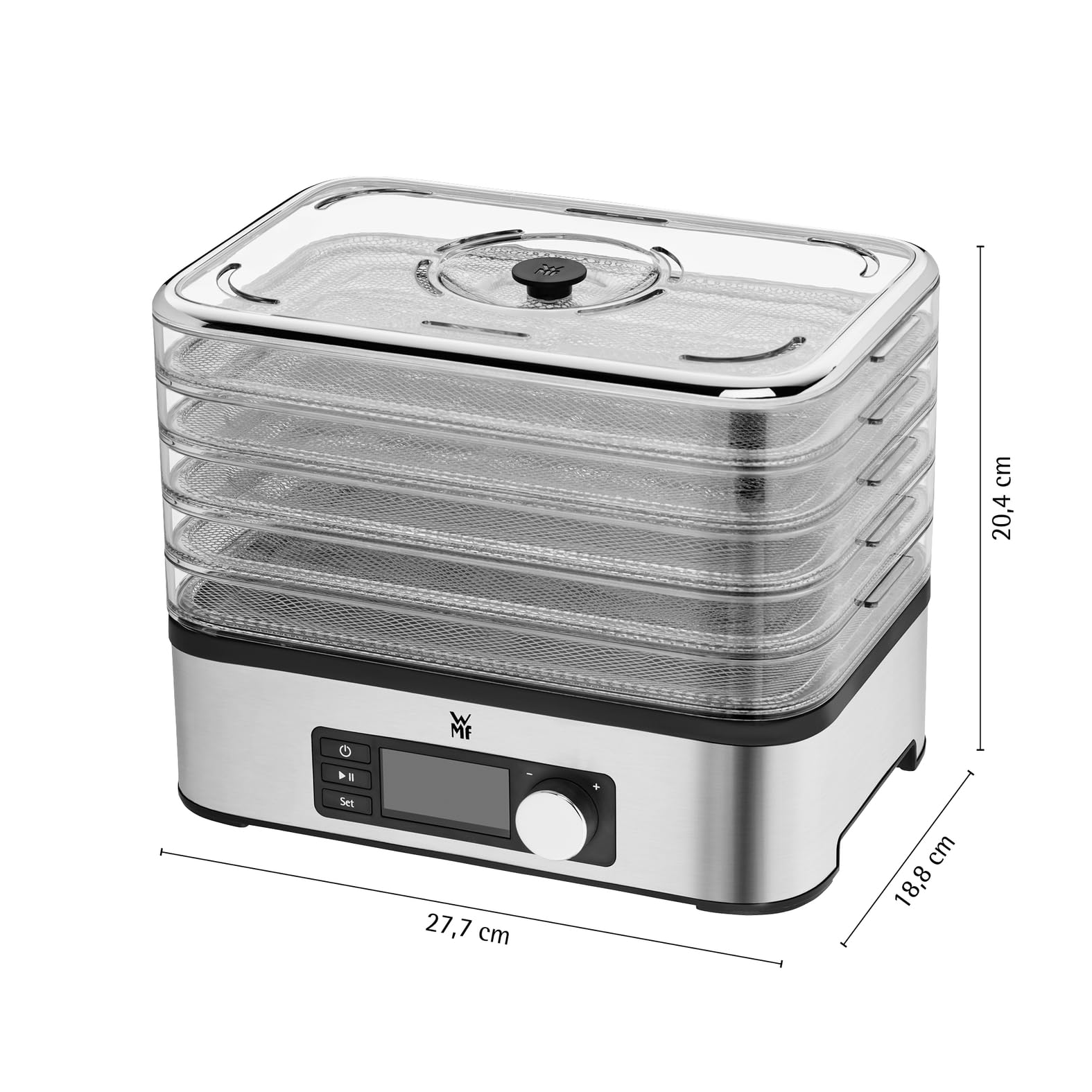 Trockenobst, gedörrte Pilze, Kräuter, Gemüsechips, Beef Jerky oder Müsliriegel kann man im Supermarkt für gutes Geld kaufen – oder einfach selber, mit dem WMF Dörrautomaten. Der äusserst platz- und energiesparende Apparat dörrt und trocknet alles, was ihm aufs Gitter oder in die extra Silikonform kommt – gerne auch über Nacht. Nahezu geräuschlos werden auf fünf Etagen köstliche Snacks und Müsliriegel produziert. Der Überhitzungsschutz mit automatischer Abschaltung sorgt für die nötige Sicherheit. Am nächsten Morgen einfach die kleinen Köstlichkeiten zur Arbeit mitnehmen oder den Kindern als Pausensnack mitgeben. Dank elektronischer Luftzirkulation besteht eine gleichmässige Wärmeverteilung, welche zu optimalen Ergebnissen führt. Die Temparatur kann je nach Bedarf zwischen 30 - 70 Grad variabel eingestellt werden. Das Gerät verfügt über eine Abschaltautomatik sowie Überhitzungssschutz mit Sicherheitsabschaltung. So kann man den Dörrautomat auch nachts verwenden, einfach die gewünschte Zeit zwischen 0 und 24 Stunden in den Timer eingeben und fertig. Auf dem LC Display kann man dann die Temparatur- und Restlaufzeitanzeige ablesen. Der Dörrapparat hat 5 feinmaschige Dörrgitter aus Tritan und Edelstahl, die individuell 3 weitere Dörrgitter erweiterbar sind. Inklusive werden auch eine Silikonform für selbstgemachte Müsliriegel, 2 Aufbewahrungsboxen in diversen Grössen, 1 Müsliriegel-Box zum Mitnehmen und 1 Rezeptbuch mitgeliefert.Trotz steigender Mobilität will niemand mehr auf Gesundes und Selbstgemachtes verzichten. Mit den WMF KÜCHENminis® entsteht im Handumdrehen aus frischen, regionalen und saisonalen Zutaten ein vollwertiger Speiseplan ganz nach persönlichen Vorlieben. Das schmeckt einfach besser und setzt neue Energien frei. Ob Reis, Dörrobst, Gemüse oder Salat: Die kleinen Helfer sind bis ins Detail praktisch durchdacht, so dass mit wenig Energieeinsatz eine komplette Mahlzeit gezaubert werden kann – und das auf kleinstem Raum. Perfekt, wenn man das gesunde, selbst zubereitete Essen einfach einpacken, bequem transportieren und überall geniessen kann.