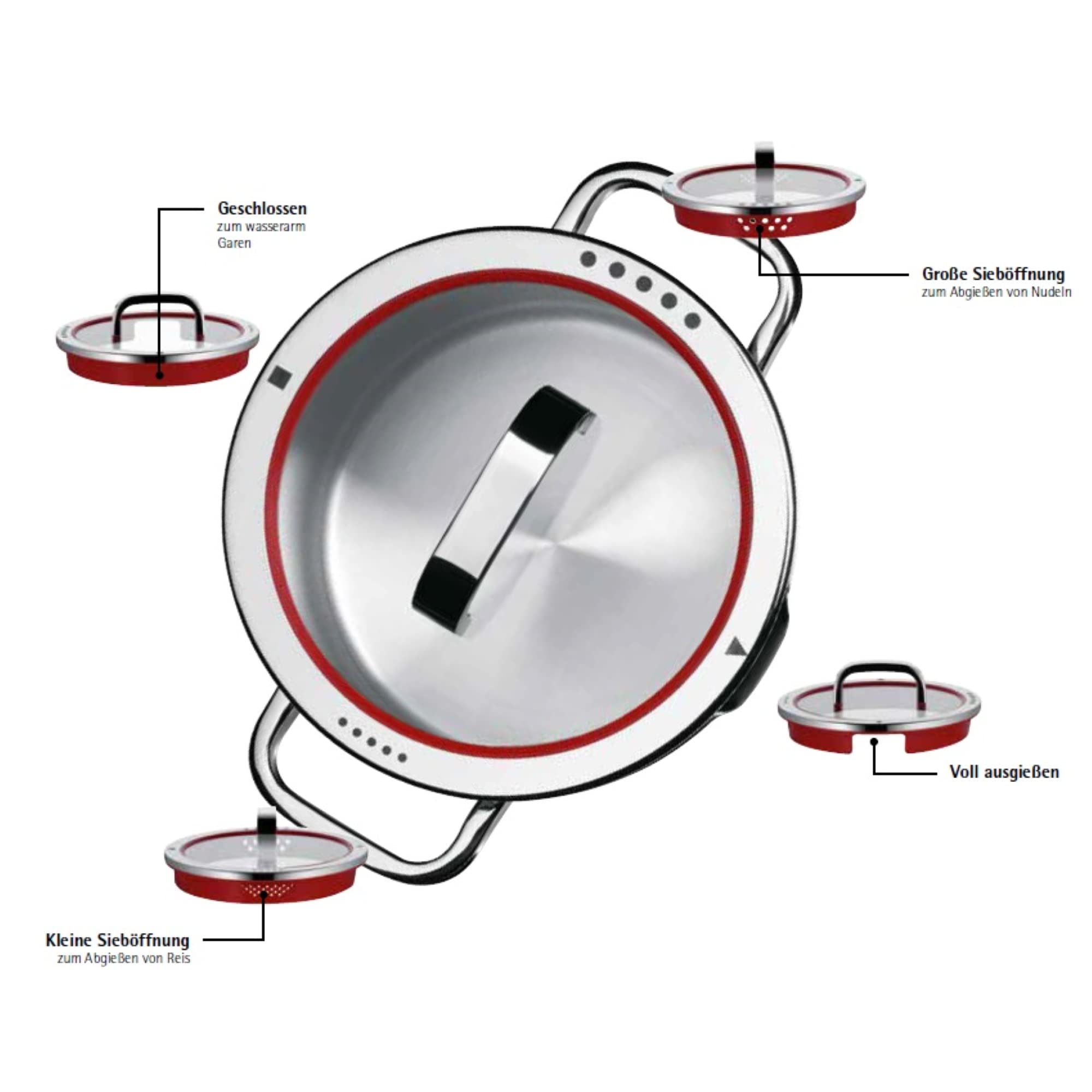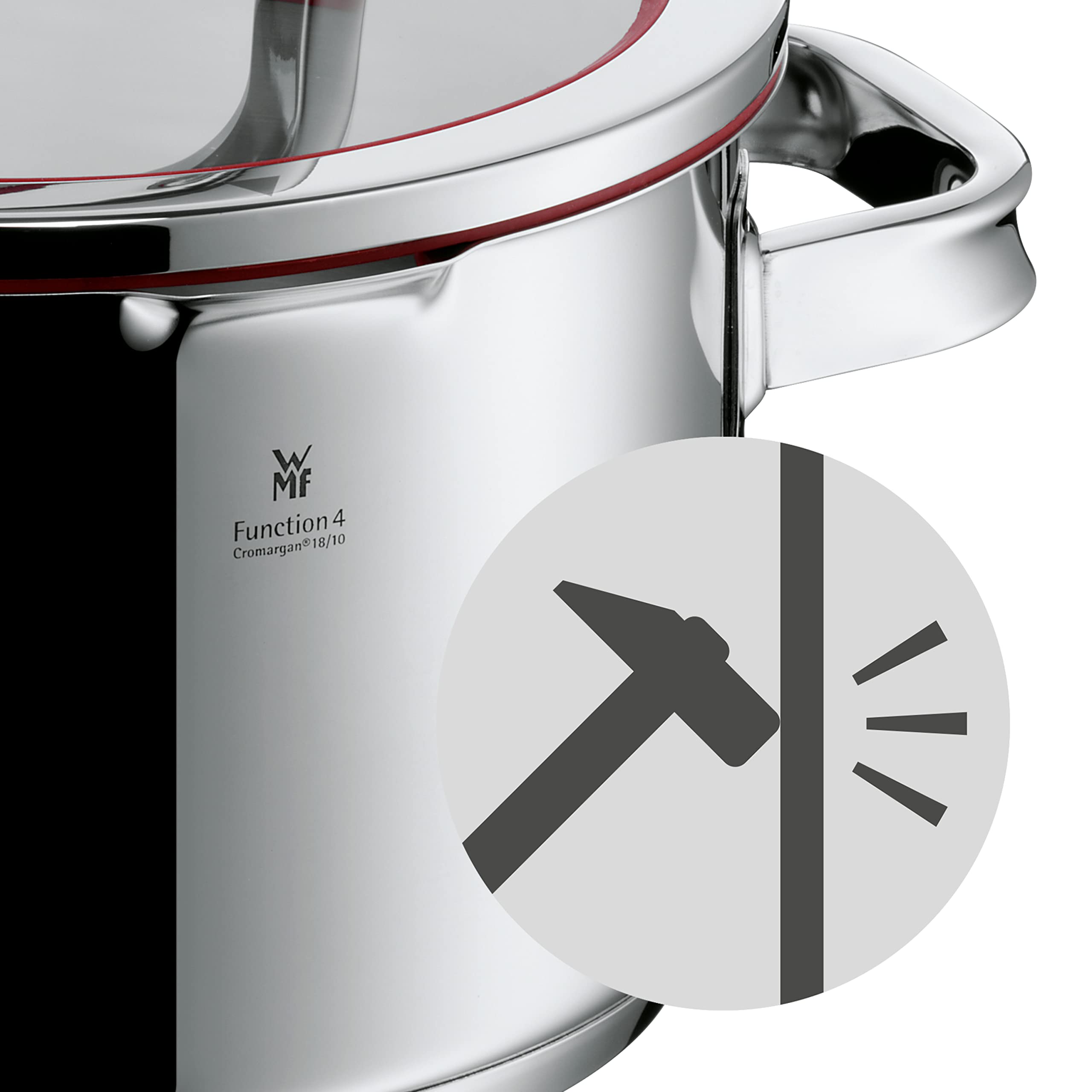 WMF Function 4 Kochtopf klein 16cm, Glasdeckel, Bratentopf Induktion 1,4l, Cromargan Edelstahl poliert, 4 Abgiessfunktionen, Innenskalierung, rot