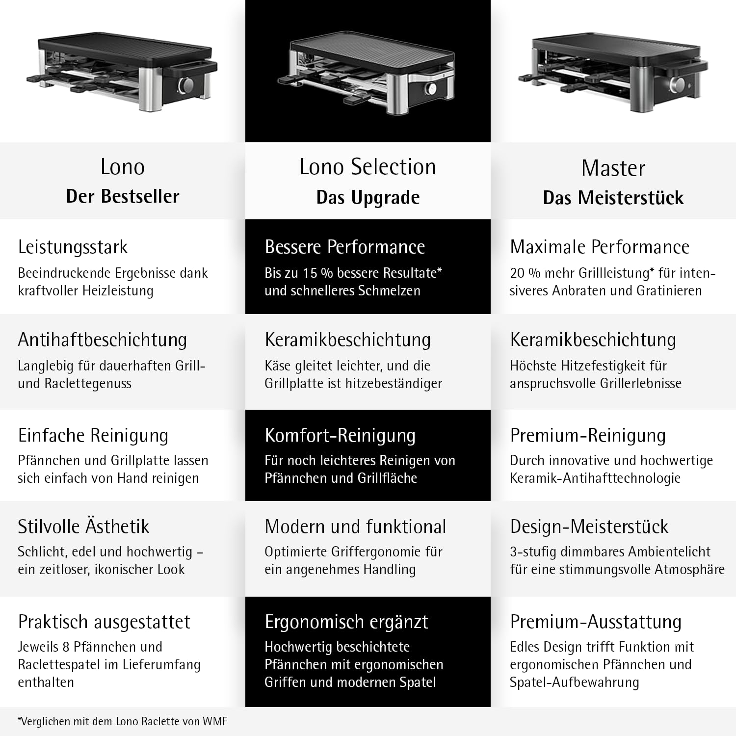 WMF Lono Selection Raclette Grill 8 Personen – Hochwertiger Cromargan Edelstahl, 1500W Leistung, keramikbeschichtete Grillplatte, 8 Pfännchen und Spatel, Temperaturregelung und Ablage