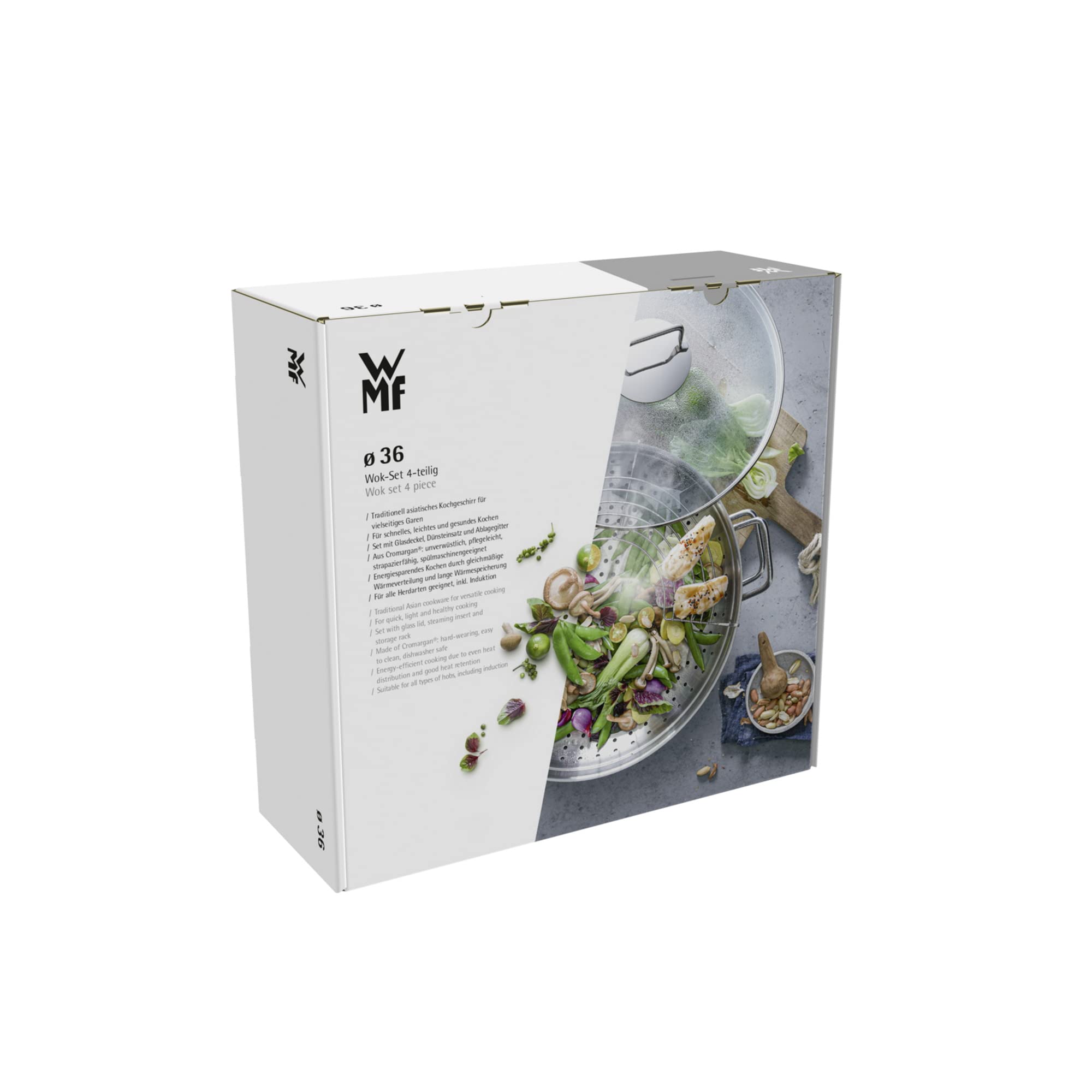 WMF Macao Wok Induktion 4-teilig, Wokpfanne 36 cm mit Glasdeckel, Ablagegitter, Dämpfereinsatz, Wokpfanne Induktion, Cromargan Edelstahl poliert, unbeschichtet
