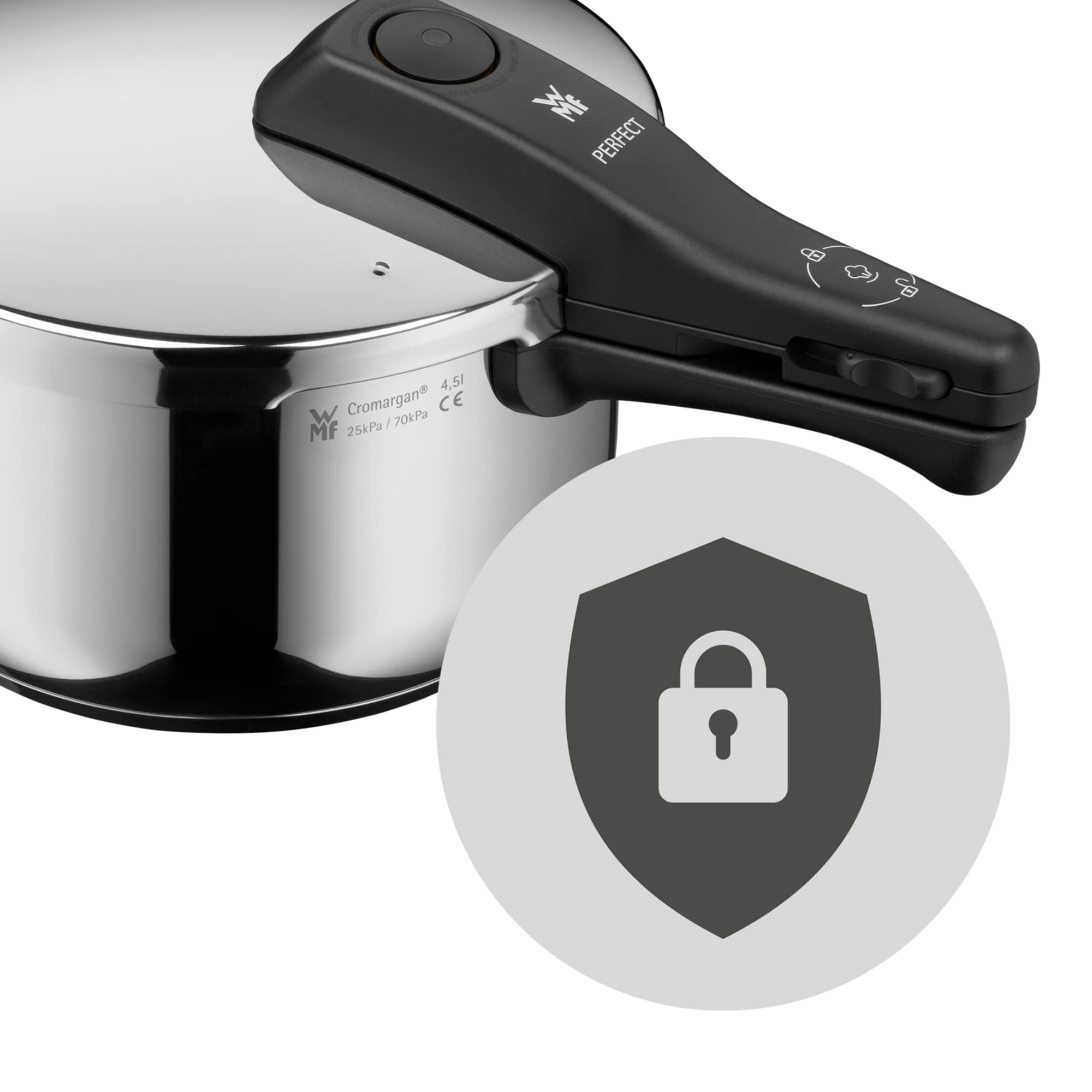 Er ist der Klassiker unter den Schnellkochtöpfen: der WMF Perfect. Seit vielen Jahren verteidigt er souverän seinen Stammplatz im WMF Sortiment – und das nicht ohne Grund. Sein klassisches Design ist zeitlos, seine Funktionalität stets an die aktuelle Technik angepasst. Wie alle anderen Schnelltöpfe aus dem Hause WMF besteht auch er aus Cromargan und ist somit rostfrei, pflegeleicht und unverwüstlich. Sein grosses Kochsignal ermöglicht eine einfache Bedienung, seine Innenskalierung das genaue Befüllen und der abnehmbare Griff leichtes Reinigen. Damit nicht genug: Dank seines TransTherm Allherdbodens eignet sich der WMF Perfect Dampftopf für alle Herdarten inklusive Induktion. Von der Serie WMF Perfect sind Schnelltöpfe in fünf verschiedenen Grössen und als zweiteiliges Set erhältlich.Die Essgewohnheiten ändern sich. Oft muss es beim Kochen schnell gehen so wie bei Berufstätigen Familien mit Kindern aber auch in Singlehaushalten. Die meisten Menschen wollen sich trotzdem bewusst ernähren. Wellness ist einer der grossen Trends der Gegenwart. Zu beidem passt der WMF Schnelltopf optimal. Denn das Kochen geht schnell und einfach wenn man ein paar Handgriffe beherrscht. Und die gesunden Nährstoffe in den Lebensmitteln bleiben weitgehend erhalten – anders als etwa in einer Mikrowelle. Ausserdem ist der Schnelltopf sicher und braucht kaum Pflege. Wie alle anderen Schnelltöpfe ist der Schnelltopf Perfect aus unverwüstlichem Cromargan. Den Griff nehmen Sie zum Reinigen einfach ab und halten ihn unter fliessendes Wasser. Das Design ist zeitlos klassisch die technische Ausstattung entspricht dem aktuellen Standard.