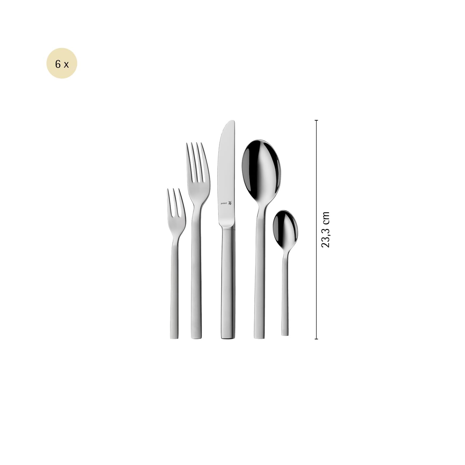 Das 30-teilige Besteck-Set bietet Ihnen passend zu zahlreichen Speisen und Gängen je sechs Menügabeln, -messer und -löffel sowie Kuchengabeln und Kaffeelöffel. Die 30 Teile sind eine gute Basis für tägliches Speisen und können mit weiteren Servier- und Ergänzungsbestecken vervollständigt werden – für eine vollendete Tischkultur.So schlicht so schön: Das WMF Besteck Lyric aus dem Designstudio Köhler & Wilms überzeugt mit klaren Konturen und harmonischen Proportionen. Dank seiner ausgewogenen Materialstärke und der präzisen Verarbeitung der Kanten liegt es angenehm in der Hand. Optisches Highlight ist die Teilmattierung des Bestecks bei der der mattierte Stiel in schönem Kontrast zum polierten Vorderteil steht. Kurz: Wer einen zeitlosen klassischen Stil mag wird dieses Besteck lieben.