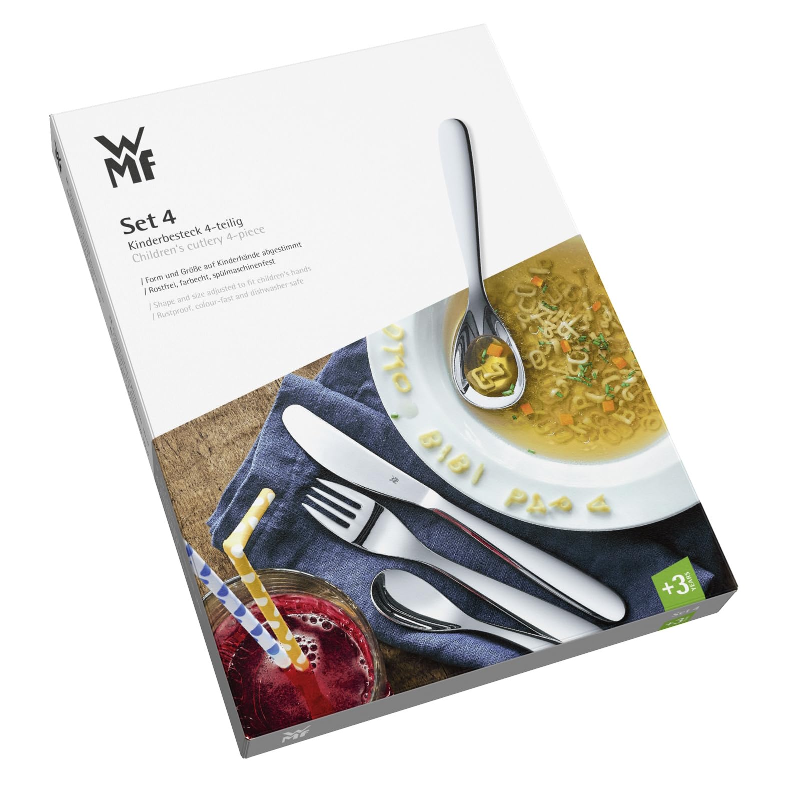 Auf zum Safari-Abenteuer mit Motiven wie Krokodil, Zebra und Giraffe. Das Besteck „Safari“ ist für alle kleinen Abenteurer und Globetrotter: Tiermotive und die Abbildung des Dschungels setzen die Fantasie in Gang und entführen Ihre Kinder in eine fremdartige Welt. Die Motive sind liebenswert und sympathisch und sind auf das Besteck geprägt. Besteck und Geschirr aus Porzellan sind in den Proportionen auf Kinder abgestimmt und hochwertig verarbeitet.Mit dem Kinderbesteck von WMF lernen die Kleinen spielerisch, mit Messer, Löffel und Gabel umzugehen. Mehr als 125 Jahre Erfahrung stecken in den kindgerechten Besteckteilen aus rostfreiem Edelstahl, die ausserdem mit liebevoll gestalteten Motiven und farbigen Bildern begeistern. Das 4-teilige WMF Kinderbesteck, bestehend aus einem Kindermesser, einem grossen und kleinen Kinderlöffel sowie einer Kindergabel, zeichnet sich durch ein kindgerechtes Design aus, das die Fähigkeit zum selbständigen Essen verbessert und gleichzeitig für Spass beim täglichen Essen sorgt. Die Kinderbesteckset sind in entsprechende Altergruppen eingestuft, dieses eignet sich für Kinder ab 3 Jahren. Die Grösse und Form dieser Kinderbesteckteile machen dieses Set zum perfekten Erstbesteck für absolute Sicherheit und die Entwicklung der Feinmotorik. Die Grössen der Besteckteile und die kräftigen Stiele eignen sich besonders für kleine Hände und die kindliche Motorik. Die Messer haben einen leichten Wellenschliff. Der Laffenrand des Löffels hat abgerundete Kanten, und die kurzen stumpfen Zinken der Kindergabel passen sich kleinen Kindermündern an. Die Besteckteile aus Cromargan Edelstahl Rostfrei 18/10 sind langlebig und können in der Spülmaschine gereinigt werden. Spülmaschinenfestes und säurebeständiges Cromargan garantiert vollen Geschmack, aussergewöhnliche Haltbarkeit und eine elegante Ästhetik. Das 4-teilige Kinderbesteck wird in einer hochwertigen Faltschachtel mit Klappdeckel geliefert.