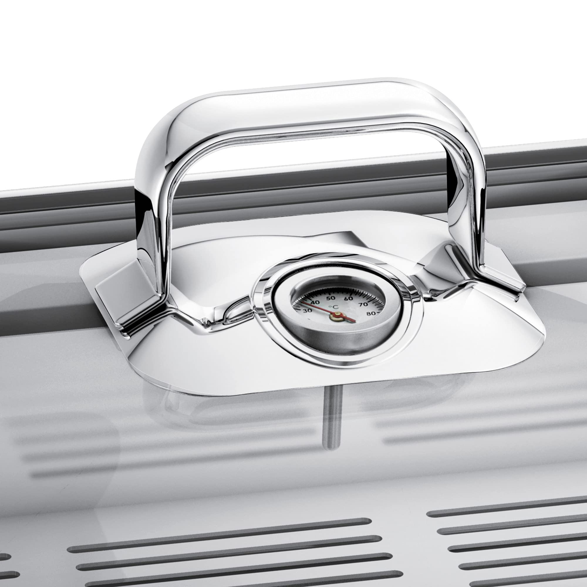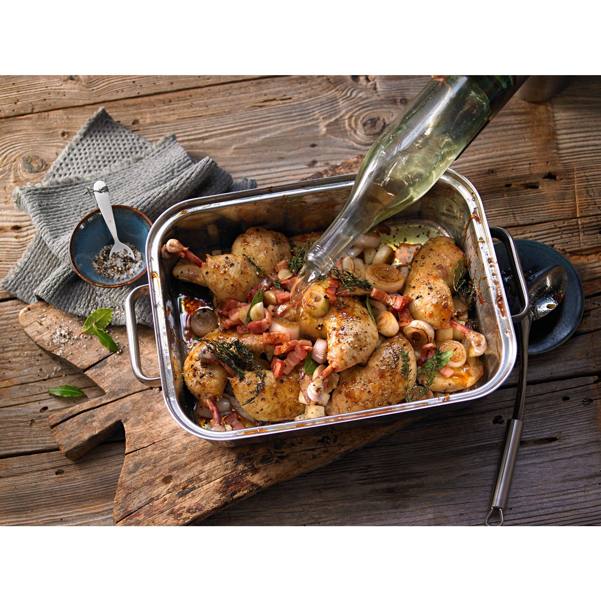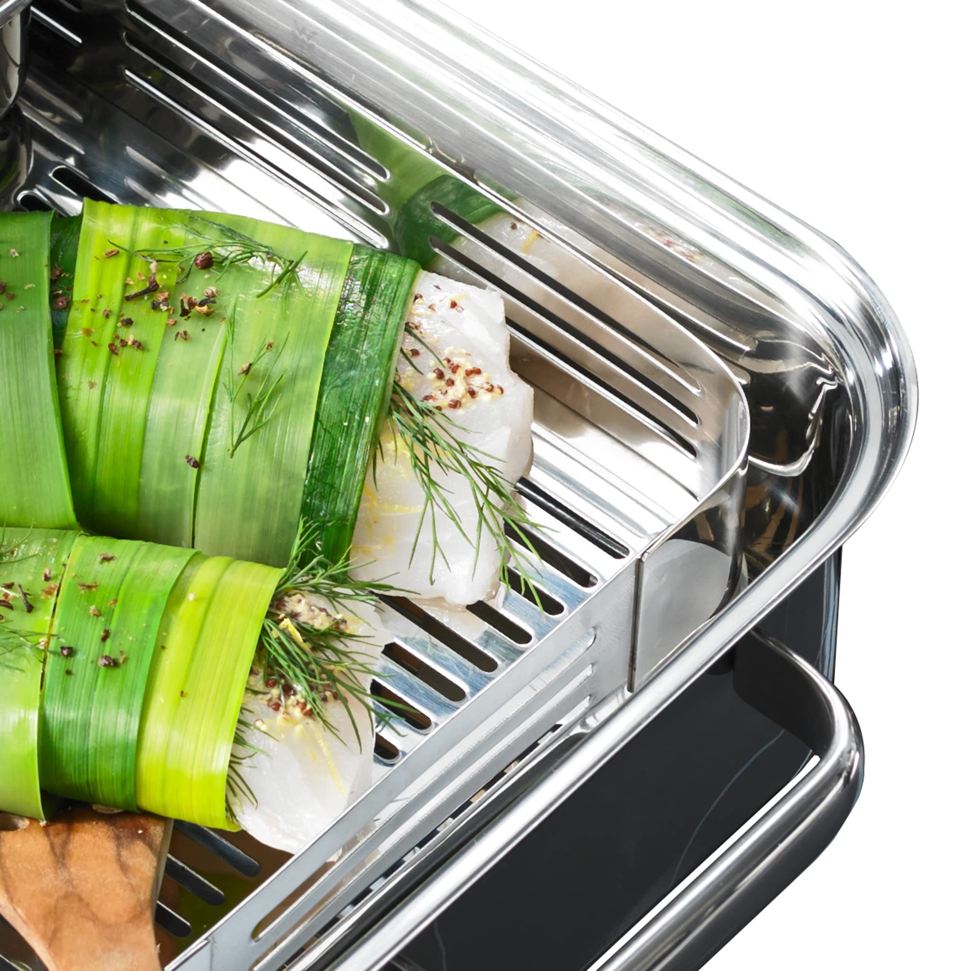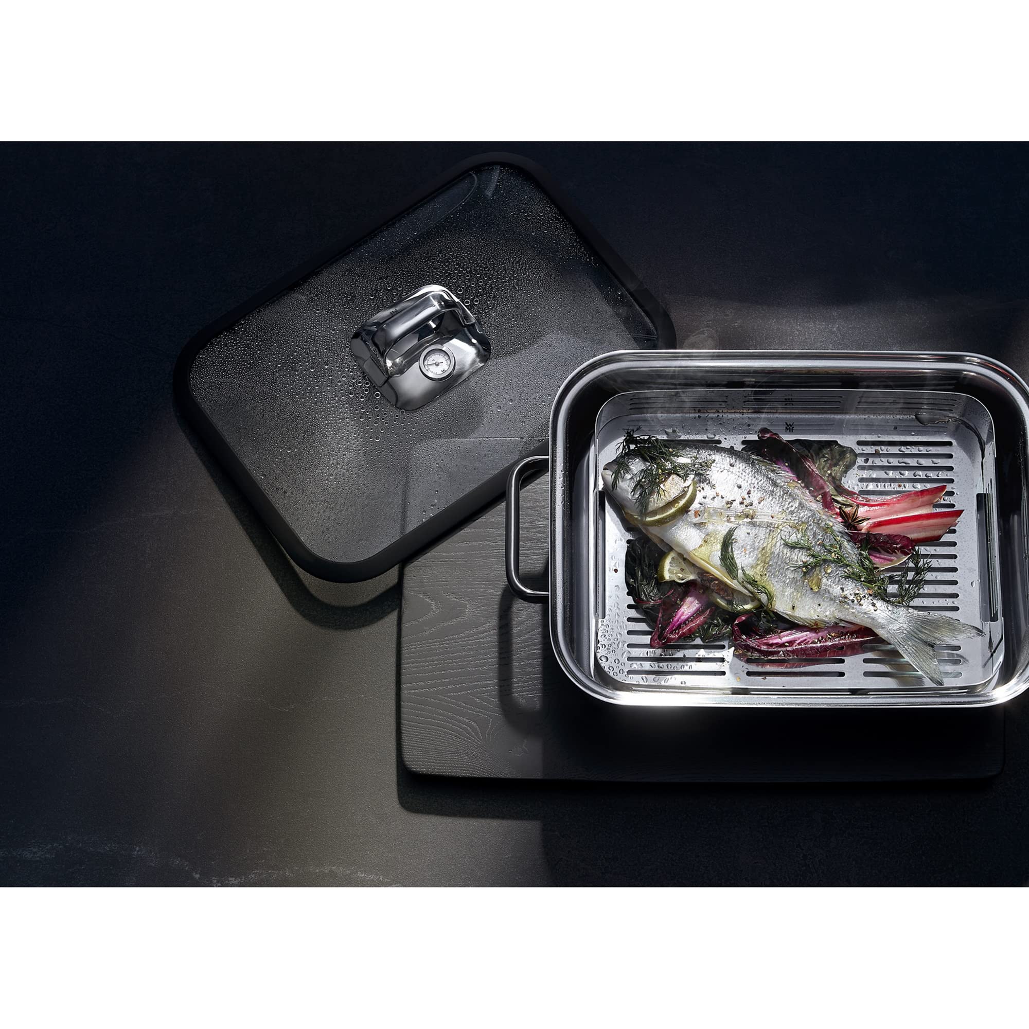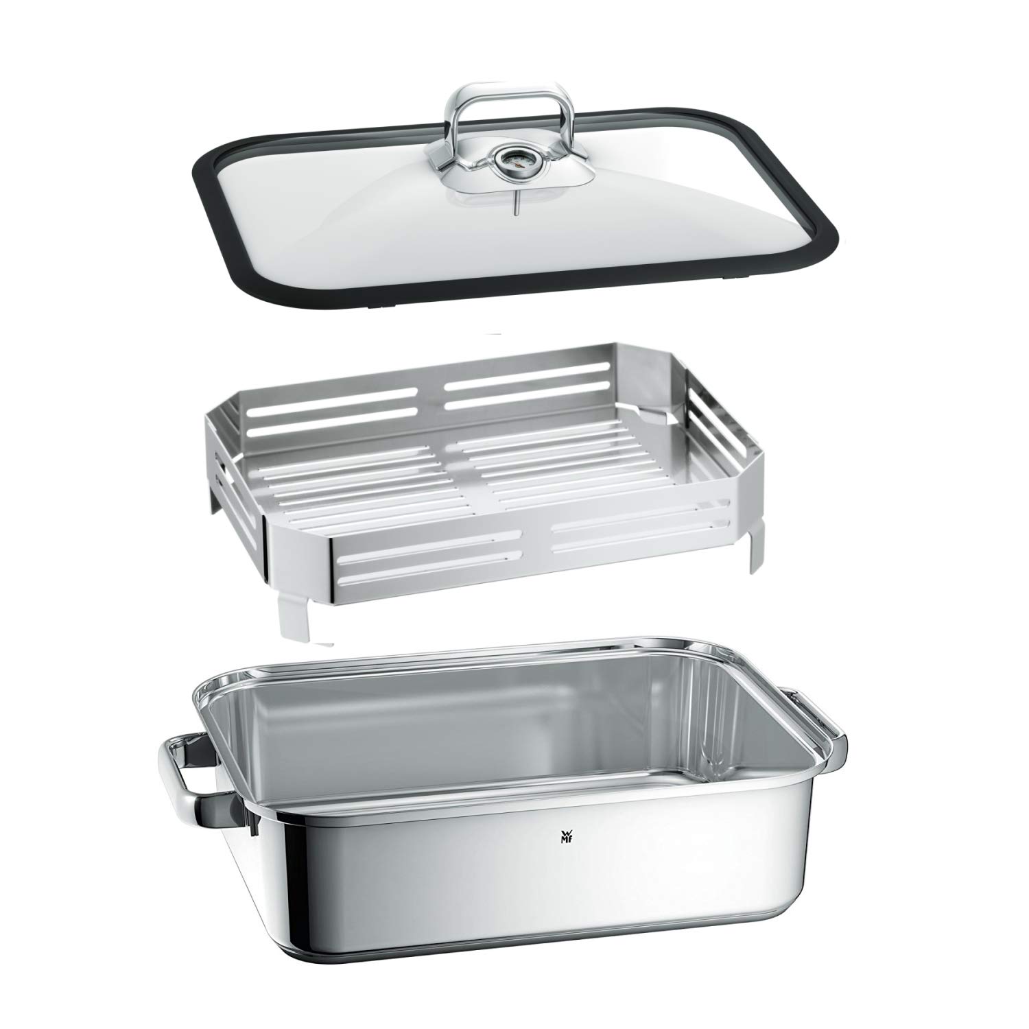 WMF Vitalis Compact Dampfgarer, Bräter Induktion, 35x21,5x10 cm, Auflaufform 3,5l, Glasdeckel Silikonrand, Thermometer, Garblech, Cromargan Edelstahl unbeschichtet
