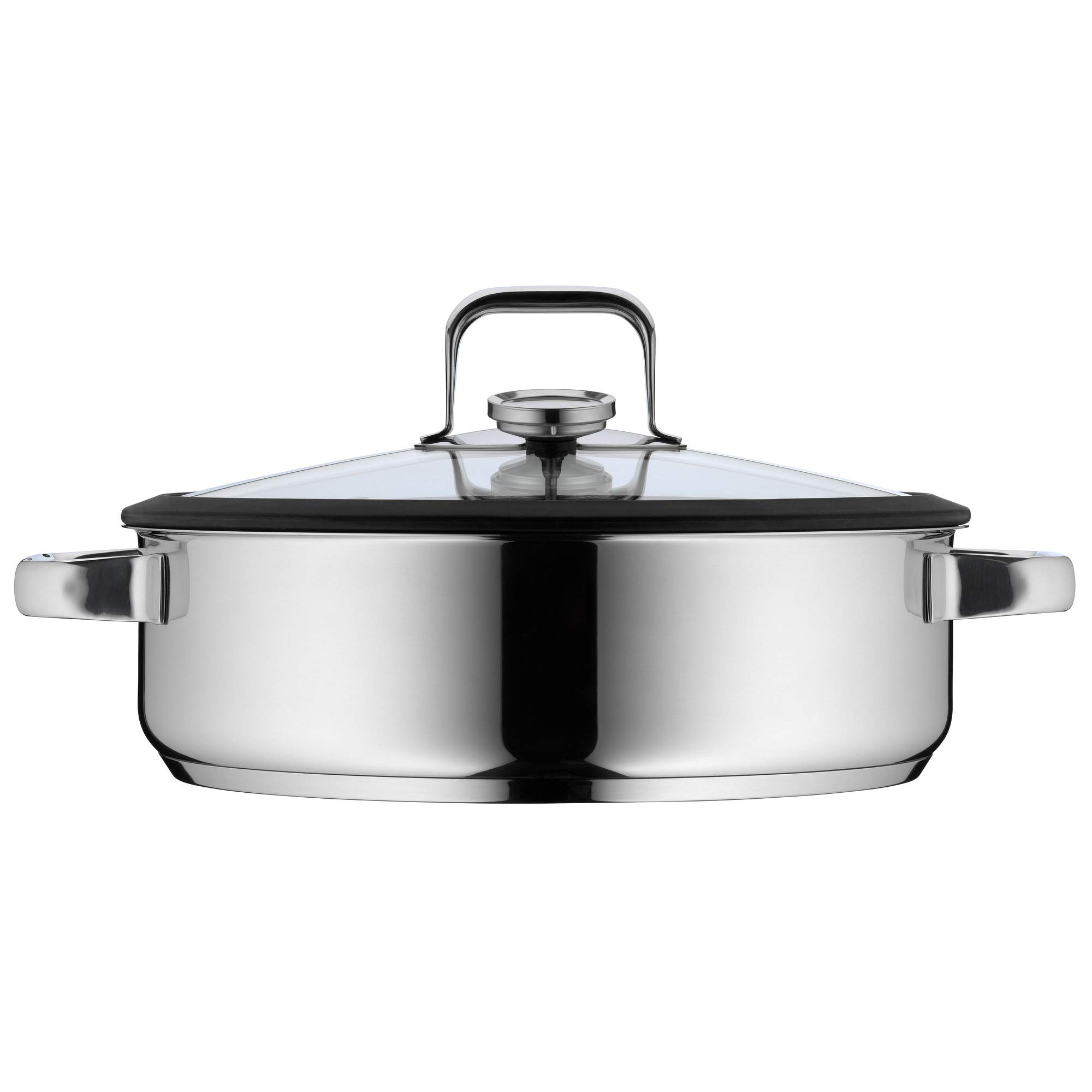 Der WMF Vitalis Aroma-Dampfgarer ist eine willkommene Ergänzung für jede Küche. Er bietet die vollständige Erhaltung von Aroma, Geschmack und Nährwert Ihrer Zutaten für gesunde Ergebnisse leicht gemacht. Entdecken Sie Fisch, Fleisch und Gemüse perfekt dampfgegart mit vollständig erhaltenen Vitaminen, einem eingebauten Thermometer und einem luftdichten Design, das einwandfreie Ergebnisse garantiert. Damit kein Dampf entweichen kann, bleibt die Silikonlippe am Glasdeckel vollständig versiegelt und bietet einen Inhalt, der wunderbar saftig bleibt, ohne zu verbrennen oder auszutrocknen. Perfektes Schmoren, Kochen und Braten sind dank des TransTherm®-Universalbodens, der mit allen Herdplatten, auch mit Induktion, kompatibel ist, zum Greifen nah.Für den WMF Vitalis liess sich Designer Peter Ramminger von Einschüben für den Backofen inspirieren. Damit war ein Teil des Auftrags erfüllt, nämlich die Bratreine funktionaler zu machen. Doch sie sollte auch innovativer werden: Fernsehkoch Johann Lafer hatte die zündende Idee, ein Thermometer in den Glasdeckel zu integrieren. Damit lässt sich die Temperatur von aussen kontrollieren, ohne den Deckel abzuheben. Zur WMF Vitalis Familie gehören ein Bräter sowie ein Aroma-Dampfgarer in verschiedenen Ausführungen. Der Bräter aus Edelstahl mit Glasdeckel eignet sich zum Anbraten und Schmoren auf dem Herd sowie für Aufläufe im Backofen. Die Aroma-Dampfgarer aus pflegeleichtem Cromargan sind als kleine Garküche für den Herd konzipiert. Während im Bräter unten die Flüssigkeit kocht, ziehen eine Etage höher die Zutaten im aufsteigenden Dampf gar. Für den Singlehaushalt gibt es den WMF Vitalis Compact mit 3,5 Liter Inhalt, ideal für kleine Mengen. Alle WMF Vitalis Produkte besitzen Kaltgriffe und einen TransTherm Allherdboden und können in der Spülmaschine gereinigt werden.