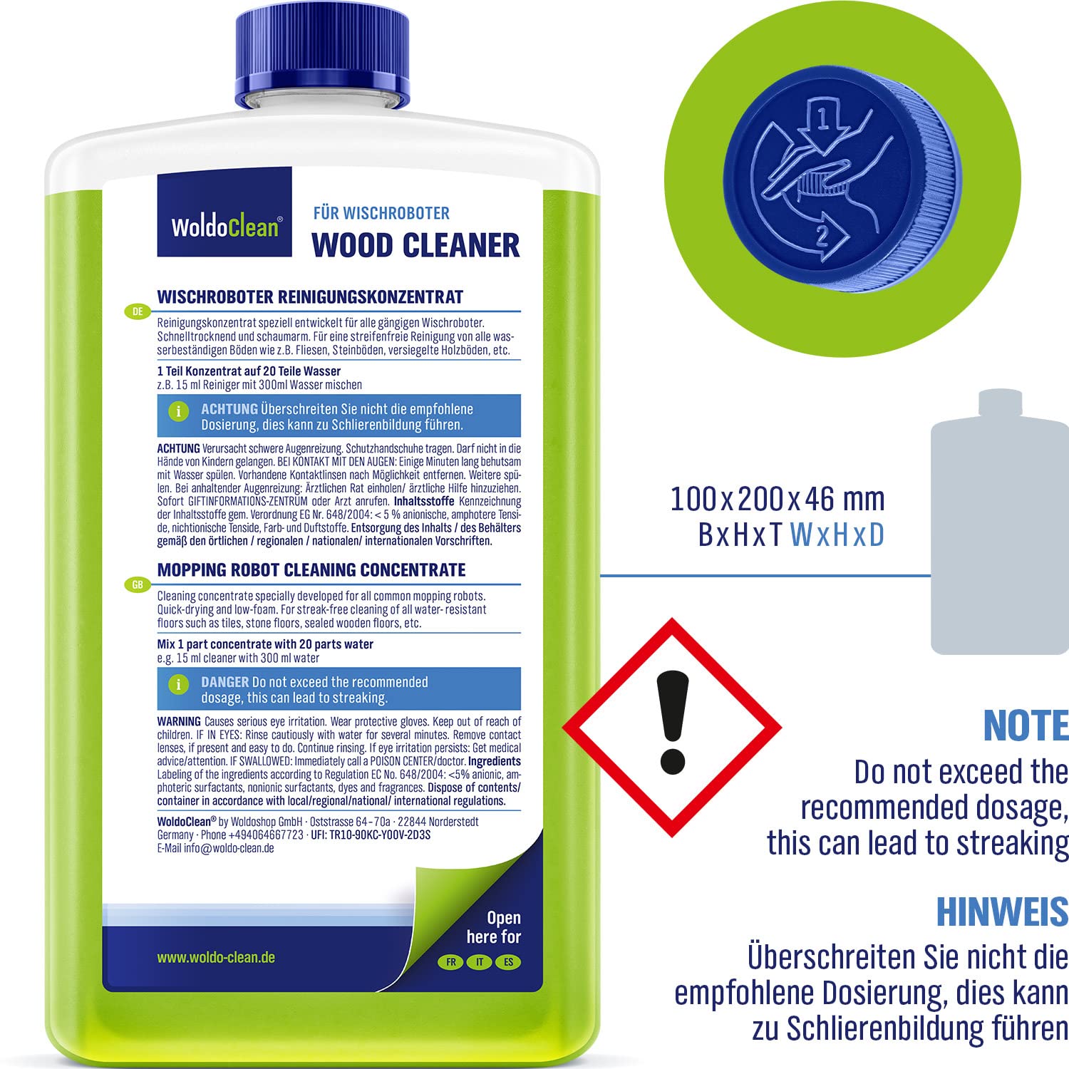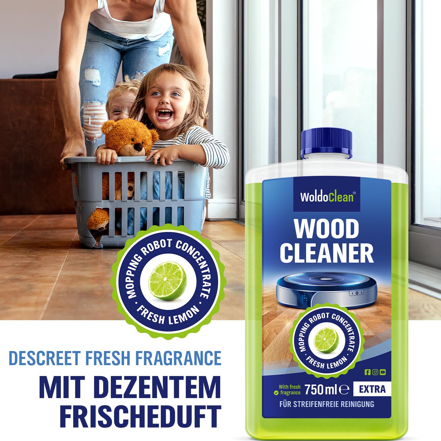 Das Original WoldoClean Wischroboter Reinigungsmittel - extra konzipiert für den Einsatz für Wischrobotern. Durch die biologische Zusammensetzung werden alle Böden sanft gereinigt und der Wassertank des Roboters geschont. Zudem gibt es bei der Reinigung keine Schaumbildung oder Schlieren mit einem angenehmen Duft. Der Reiniger kommt in einer 750ml Flasche und ist leicht zu dosieren. Wir möchten unser putzendes Gerät noch effizienter machen, um die harte Arbeit zu minimieren und schaffen es dabei trotzdem, gleichzeitig unsere Umwelt zu schützen. Der Original WoldoClean Reiniger wurde entwickelt, um Ihr Zuhause auf nachhaltige Weise gründlich zu reinigen. Es entfernt Staub- und Schmutzpartikel schnell ohne Ressourcenverschwendung und verursacht keine Verstopfung des Tanks - all dies garantiert bequemere Ergebnisse als manuelle Methoden! Die biologische Formel ist so konzipiert, dass sogar ökologisch sensible Bereiche wie Holzböden behandelt werden können. Herkömmlicher Bodenreiniger oder Spezialprodukt? An der Frage nach dem besten Reiniger für Saug-Wisch-Roboter scheiden sich die Geister. Der WoldoClean Bodenreiniger für Wischroboter ist vorzugsweise anwendbar auf allen wasserbeständigen Böden, wie z. B. Fliesen, PVC, Laminat, Parkett, Linoleum etc. Das angenehm duftende Konzentrat ist ein flüssiges Unterhalts- und Wischpflegemittel auf der Basis von wasserlöslichen Polymeren. Als Bodenpflegemittel erreicht das Konzentrat eine 2 in 1 Wirkung mit Reinigung und Pflege in nur einem Arbeitsgang und spart somit wertvolle Zeit und Energie. Zusätzlich hinterlässt die Bodenwischpflege einen besonders streifenfreien Glanz. Der WoldoClean Bodenreiniger für Wisch-Roboter ist ein effektives Reinigungsmittel, das auch bei täglicher Anwendung schonend zum Bodenbelag und der Umwelt ist. Die spezielle Formel beseitigt effizient Verschmutzungen und Staub und hinterlässt einen angenehmen Duft nach frischer Reinheit.