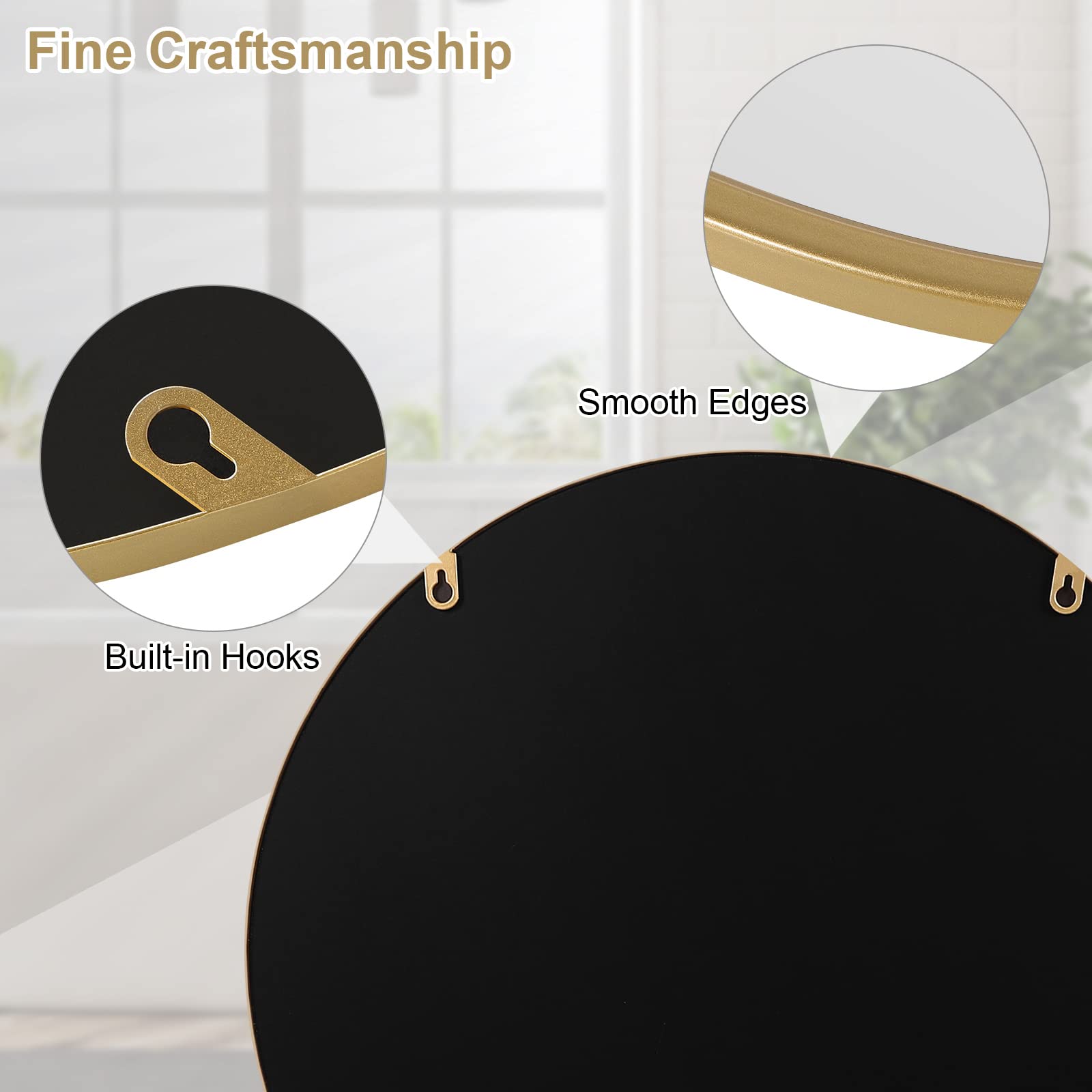 Das schlichte und zeitgemässe Design passt zu Ihrer Wohnkultur. Die praktische Funktion erfüllt Ihren täglichen Bedarf. WOLTU Wandspiegel mit klarer Bildgebung perfektionieren Ihr Leben. Feine Verarbeitung Der Metallrahmen ist goldfarben lackiert, glatt und rostfrei. Der Rand ist mit Gummistreifen für besseren Schutz und längere Lebensdauer versiegelt. Rückwand Die MDF-Rückwand bietet zusätzlichen Schutz für den Spiegel. 2 Haken am Rahmen sorgen für eine einfache und solide Installation und sichere Nutzung. Einfach und elegant Der runde Wandspiegel mit goldenem Rahmen ist einfach, elegant und schön, ist sicher ein dekoratives und auch ein funktionales Element in Ihrem Raum. Einfache Installation Positionen markieren, Löcher bohren, Dübel einsetzen, sie mit den Schrauben befestigen (Zubehör im Paket enthalten), Spiegel schliesslich aufhängen. Leichte Reinigung Rahmen: wischen Sie mit einem trockenen Tuch ab; Spiegel: reinigen Sie mit etwas Spülmittel und wischen Sie mit Papiertuch oder trockenem Tuch ab. Multifunktional Sie können den einfachen Spiegel im Badezimmer, Schlafzimmer, Wohnzimmer und Flur verwenden, um sich selbst zu überprüfen, bevor Sie hinausgehen. Mehrere Grössen Messen Sie zuerst den Raum aus, in dem Sie den Spiegel anbringen möchten, und wählen Sie einen passenden Spiegel (Durchmesser von 40, 50, 60 cm) aus. Spezifikationen des Spiegels mit Rahmen: Materialien: MDF + Metall + Glas Farbe: Golden Form: Rund Verfügbare Grössen: 40 x 40/50 x 50/60 x 60 cm Dicke des Rahmens: 2 cm Bruttogewicht: ca. 2,4/3,2/4,4 kg Packungsinhalt: 1x runder Spiegel, 1x Montagezubehör, 1x Installationsanleitung WOLTU Hinweise: 1. Das Produkt ist nicht für die Installation an einer Trockenbau-, Hohlwand- oder Gipskartonwand geeignet.