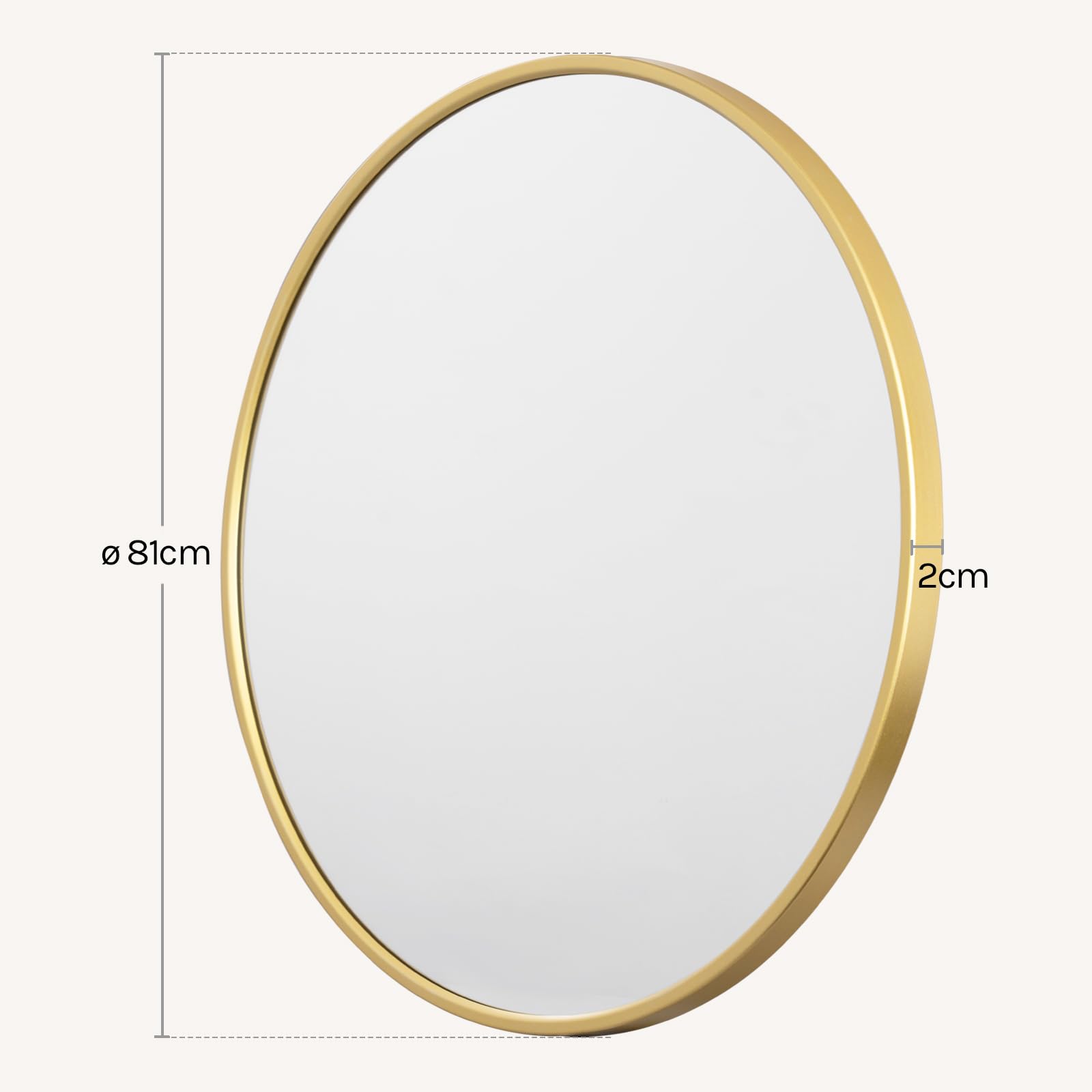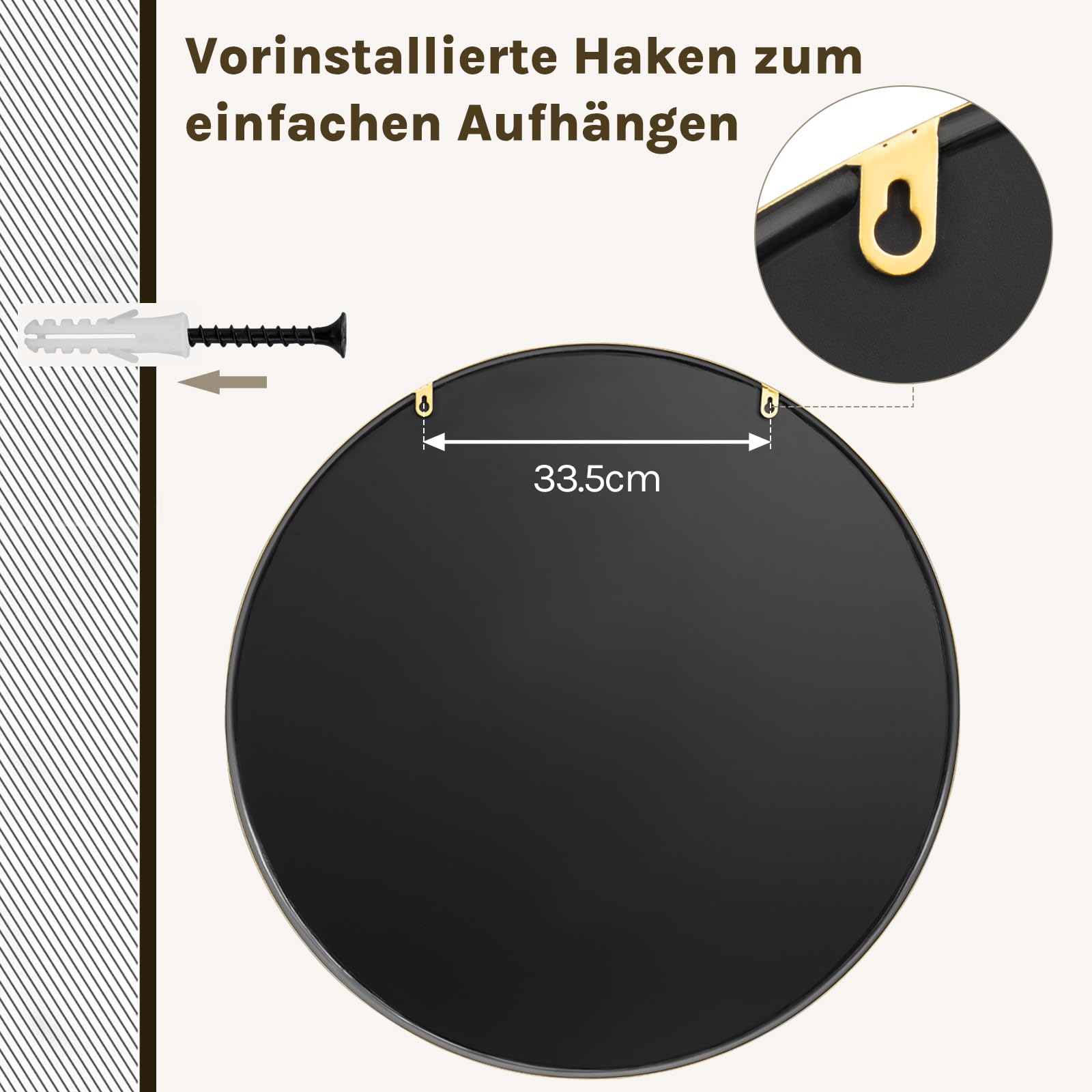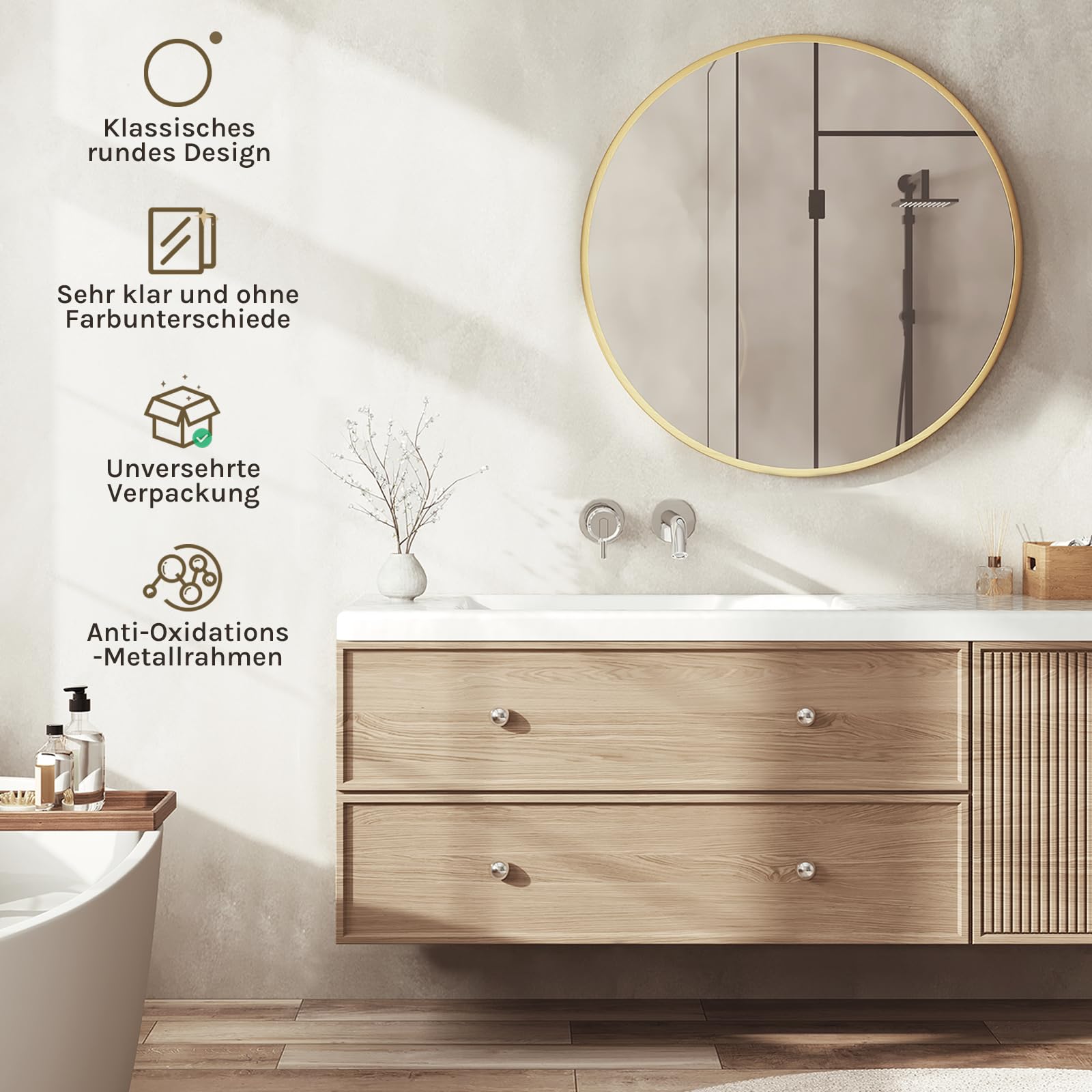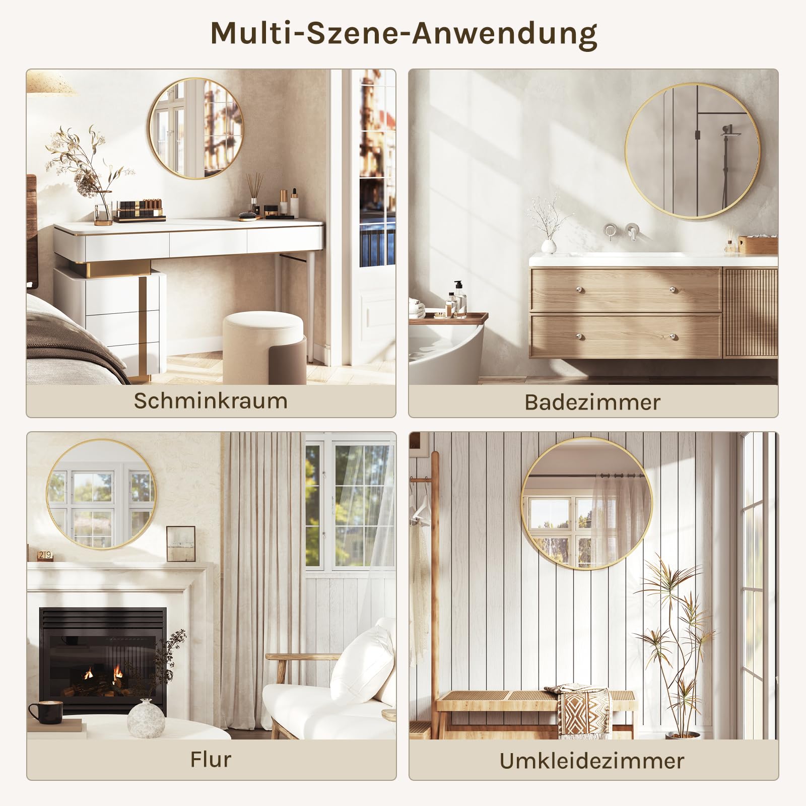 Das schlichte und zeitgemässe Design passt zu Ihrer Wohnkultur.Die praktische Funktion erfüllt Ihren täglichen Bedarf.WOLTU Wandspiegel mit klarer Bildgebung perfektionieren Ihr Leben. Klares BildOhne Farbunterschiede und Verzerrungen des Spiegelbildes stellt der dekorative Wandspiegel sein ursprüngliches Aussehen wieder her.Minimalistischer StilDieser Bad Spiegel hat ein rundes, schwebendes Design mit einfachen Linien, das dem Raum eine minimalistische Ästhetik verleiht.Vielseitiger dekorativer SpiegelGeeignet für Schlafzimmer, Badzimmer, Wohnzimmer und andere Bereiche. Er ist ein praktischer Spiegel und dekoratives Element für Ihr Zuhause.MetallrahmenDer rostfreie Metallrahmen mit einer wasserdichten Gummidichtung umschliesst den Spiegel fest und sorgt so für zusätzlichen Schutz und Haltbarkeit.Einfache MontageVorinstallierte Löcher und weiteres Zubehör ermöglichen eine schnelle Montage für einen modernen Wandspiegel.Spezifikationen Material: Metall + MDF-Rückwand + GlasFarbe: GoldGesamtabmessung: φ80x2 cm (Durchmesser x Gesamtdicke)Dicke des Wandspiegels: 4 mmNettogewicht: 5 kgPaketinhalt:1x Wandspiegel, 1 x Montageanleitung, 1 x ZubehörsetWOLTU Hinweise:1. Das Produkt ist nicht für zur Verwendung auf Trockenbau-, Hohlraum- oder Gipskartonwänden geeignet.2. Durch manuelle Bestimmung der Masse kann eine Abweichung von ca. 1 bis 2 cm vorliegen.3. Aufgrund der Lichtverhältnisse bei der Produktfotografie und unterschiedlichen Bildschirmeinstellungen kann es dazu kommen, dass die Farbe des Produktes nicht authentisch wiedergegeben wird.