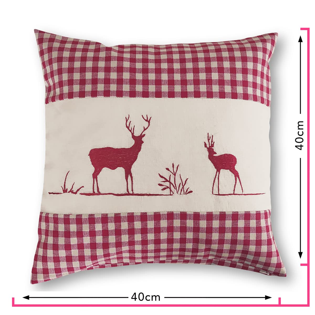 wometo Kissenhülle Zierkissen 40x40 OekoTex - Landhaus-Stil Dekokissen Sofakissen Stick Hirsch rot kariert, Karo rot Heller Hintergrund Reissverschluss