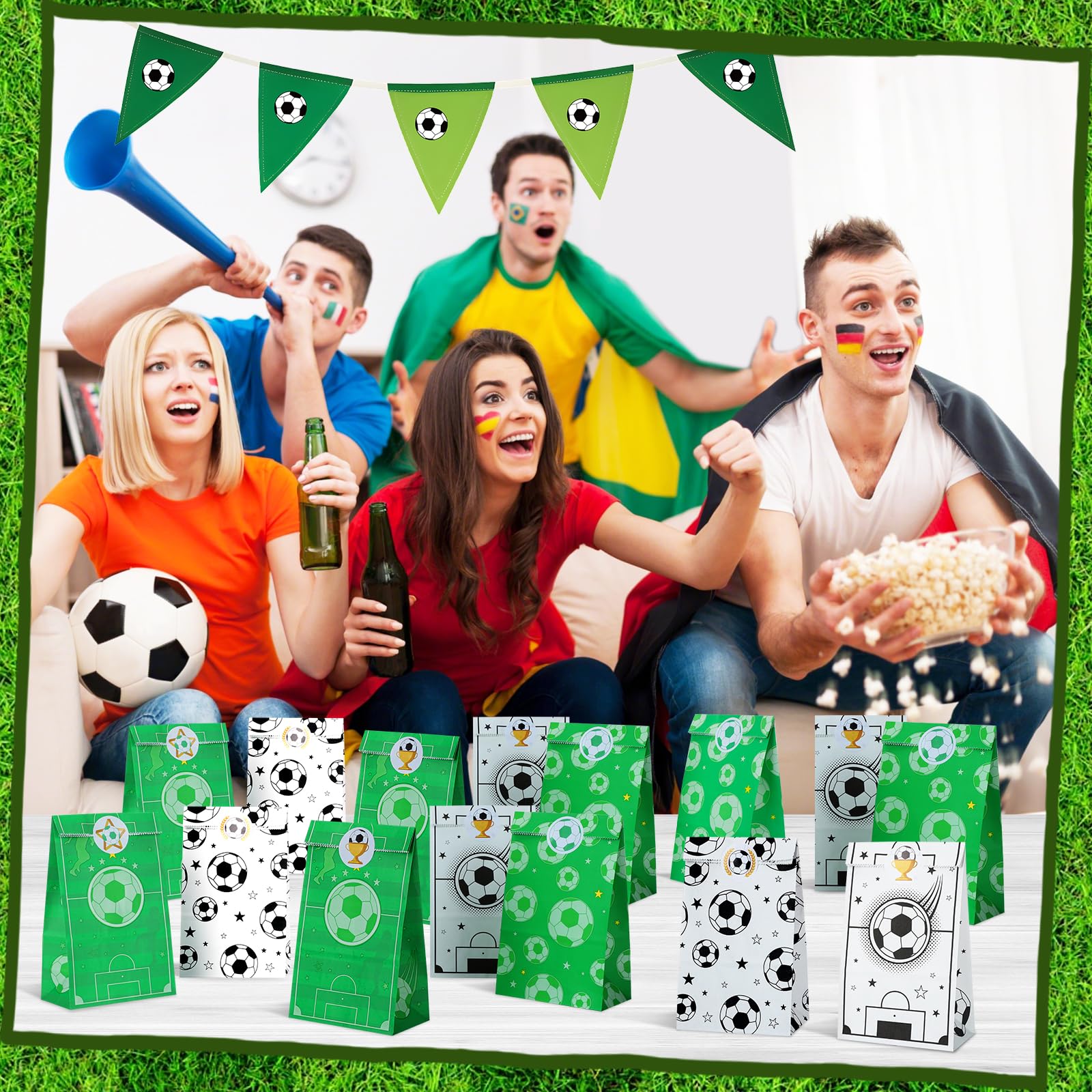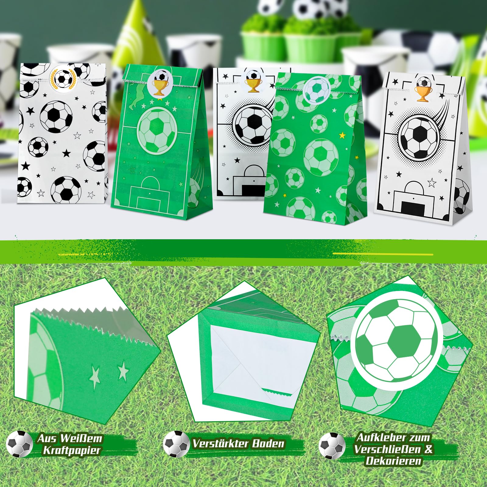 • ⚽【4 STILE】 Fussball Kindergeburtstag Tüten sind bedruckt mit Fussball, Sternen, Fussballfeld, Fussballern, die Farben sind grün und weiss, süss und lebendig, sehr attraktiv, sehr geeignet für Fussballfans.