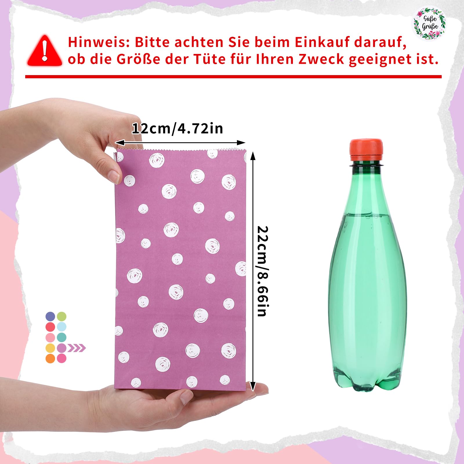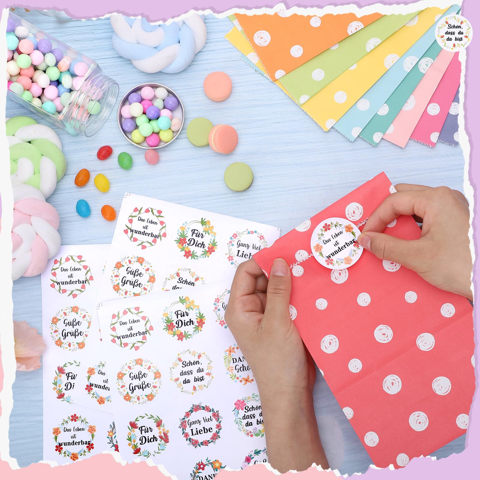 woric 50 Stück Papiertüten, 22x12x7cm Geschenktüten Kindergeburtstag Klein mit 60 Aufkleber(Auf Deutsch) Candy bar Tüten Bunt Mitgebsel Tüten für Valentinstag Ostern Geburtstag Hochzeit Party
