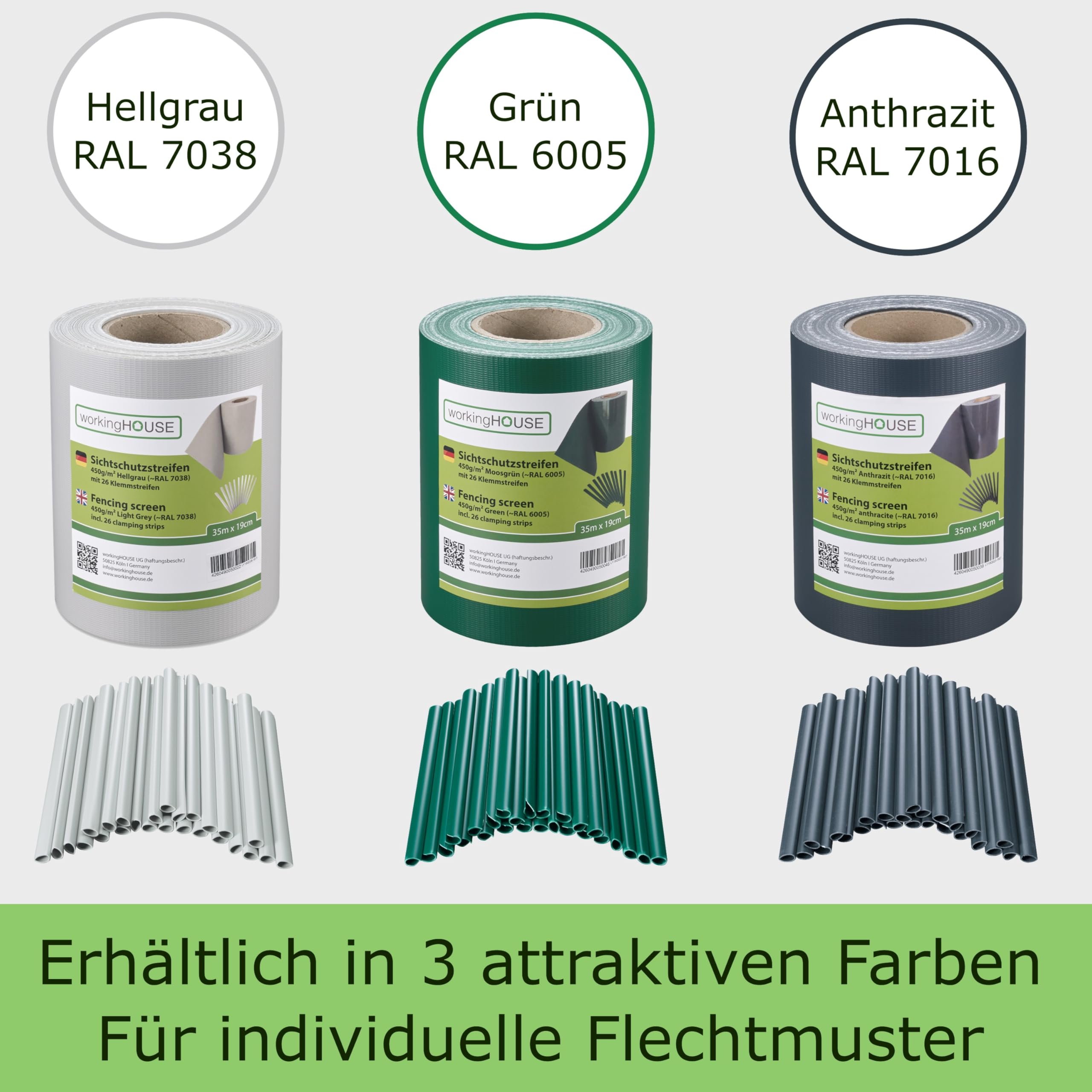 Die Preis-Leistungslösung von WORKINGHOUSE: Sichtschutzstreifen 450 g/m² StandardDie 450 g/m² PVC Sichtschutzstreifen sind die wirtschaftliche Standard-Lösung, um Ihren Doppelstabmattenzaun schnell und effektiv blickdicht zu machen. Dieses Produkt ist ideal für preisbewusste Käufer, die eine zuverlässige WORKINGHOUSE-Qualität für grosse Flächen oder Projekte suchen, bei denen die Kosten pro Meter entscheidend sind.Die 450 g/m² Stärke bietet einen soliden Schutz, ist leicht zu verarbeiten und sorgt für eine ansprechende Optik. Profitieren Sie von einem attraktiven Preis-Leistungs-Verhältnis, ohne auf die grundlegenden Schutzfunktionen verzichten zu müssen.Alle Vorteile der Standard-Serie:WIRTSCHAFTLICHE LÖSUNG: Das 450 g/m² PVC-Material bietet ein hervorragendes Preis-Leistungs-Verhältnis für die blickdichte Gestaltung grosser Zaunflächen.PERFEKTE ANWENDUNG: Ideal für alle gängigen Doppelstabmattenzäune und alle Maschenhöhen von 19-20 cm.WITTERUNGSBESTÄNDIG: UV-stabilisiert und wetterfest, dient als zuverlässiger Wind- & Blickschutz.MONTAGEFERTIG: Einfach zuzuschneiden und inklusive Befestigungsclips für die schnelle Anbringung.Verfügbare Längen:Wählen Sie die Länge, die zu Ihrem Projekt passt: Verfügbar in der Standardlänge 35m und der Grossen Länge **50m** sowie in attraktiven Spar-Sets (z.B. 4x 50m für 200m Gesamtlänge). Verfügbare Farben wie Anthrazit RAL 7016, Grün RAL 6005 und Hellgrau RAL 7040.