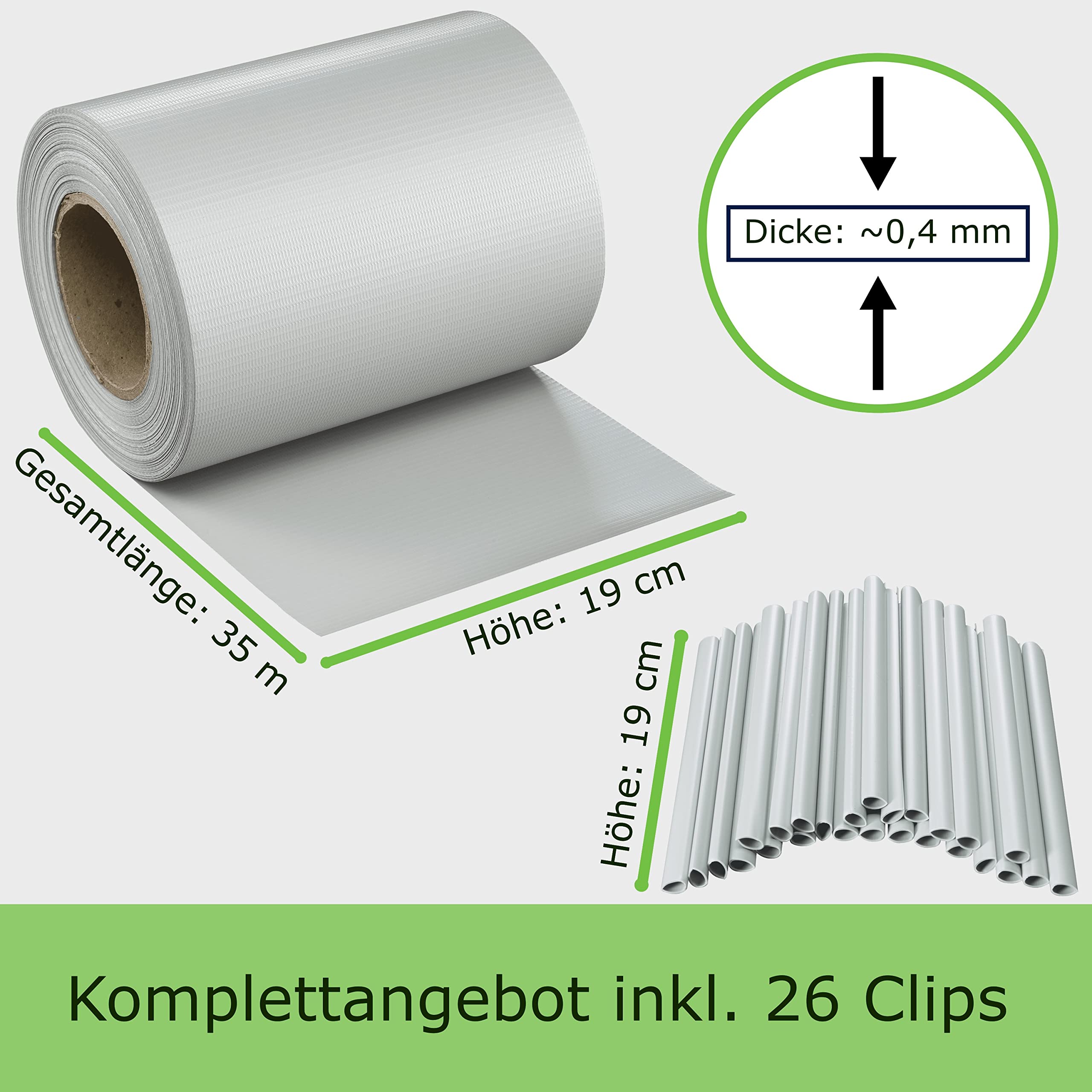 PVC Sichtschutzstreifen für Zäune mit Einzel- und Doppelstabmatten Langlebig. Stilvoll. Hochwertig. Sichtschutzstreifen aus PVC - Material sind die ideale Lösung, um Dein Grundstück vor neugierigen Blicken zu schützen und gleichzeitig Deinen Stabmattenzaun optisch aufzuwerten. Immer mehr Menschen wählen statt einer Steinwand oder einem Zaun aus Holz lieber (Doppel-) Stabmattenzäune mit PVC Sichtschutzstreifen, weil diese witterungsbeständig, wartungsfrei & farblich individuell anpassbar sind. Unsere PVC Sichtschutzstreifen haben eine Höhe von 19 cm und werden mit gleichfarbigen Klemmstreifen geliefert. Deine Vorteile: ✔ Schutz vor neugierigen Blicken. ✔ Optische Aufwertung Deines Gartenzauns. ✔ Witterungsbeständig und Wartungsfrei. ✔ Einfachste Anbringung ohne Werkzeug. ✔ Farblich individuell anpassbar. ✔ Standardhöhe von 19 cm für alle gängigen Zaunsysteme. ✔ Gleichfarbige PVC Klemmstreifen im ✔ Lieferumfang enthalten.