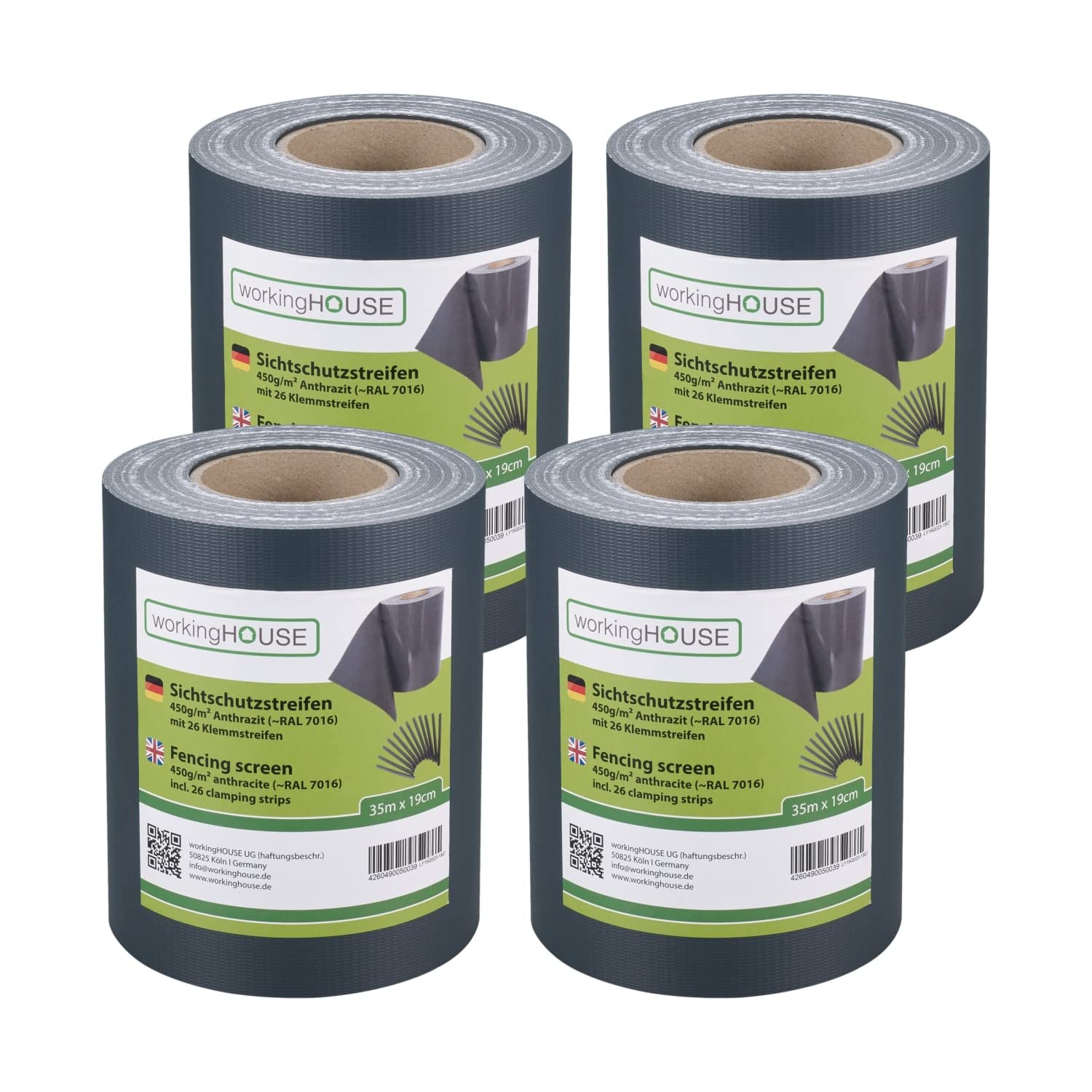 WORKINGHOUSE PVC Sichtschutzstreifen 450g/m² Standard für Doppelstabmatten Zaun – 4er Spar-Set (140m Gesamtlänge), Anthrazit RAL 7016 | Wind- & Blickschutz, wetterfest, inkl. Clips