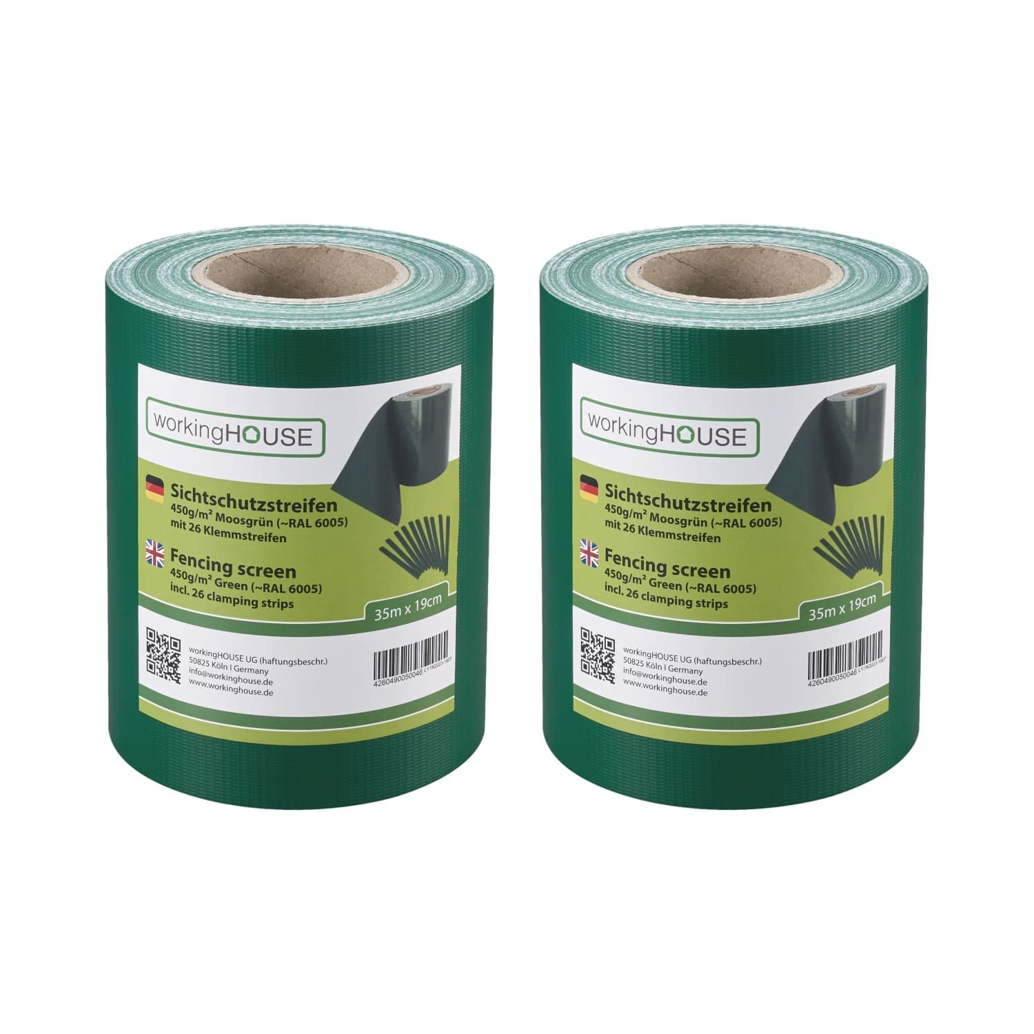 WORKINGHOUSE PVC Sichtschutzstreifen 450g/m² Standard für Doppelstabmatten Zaun – 2er Spar-Set (70m Gesamtlänge), Grün RAL 6005 | Wind- & Blickschutz, wetterfest, inkl. Clips