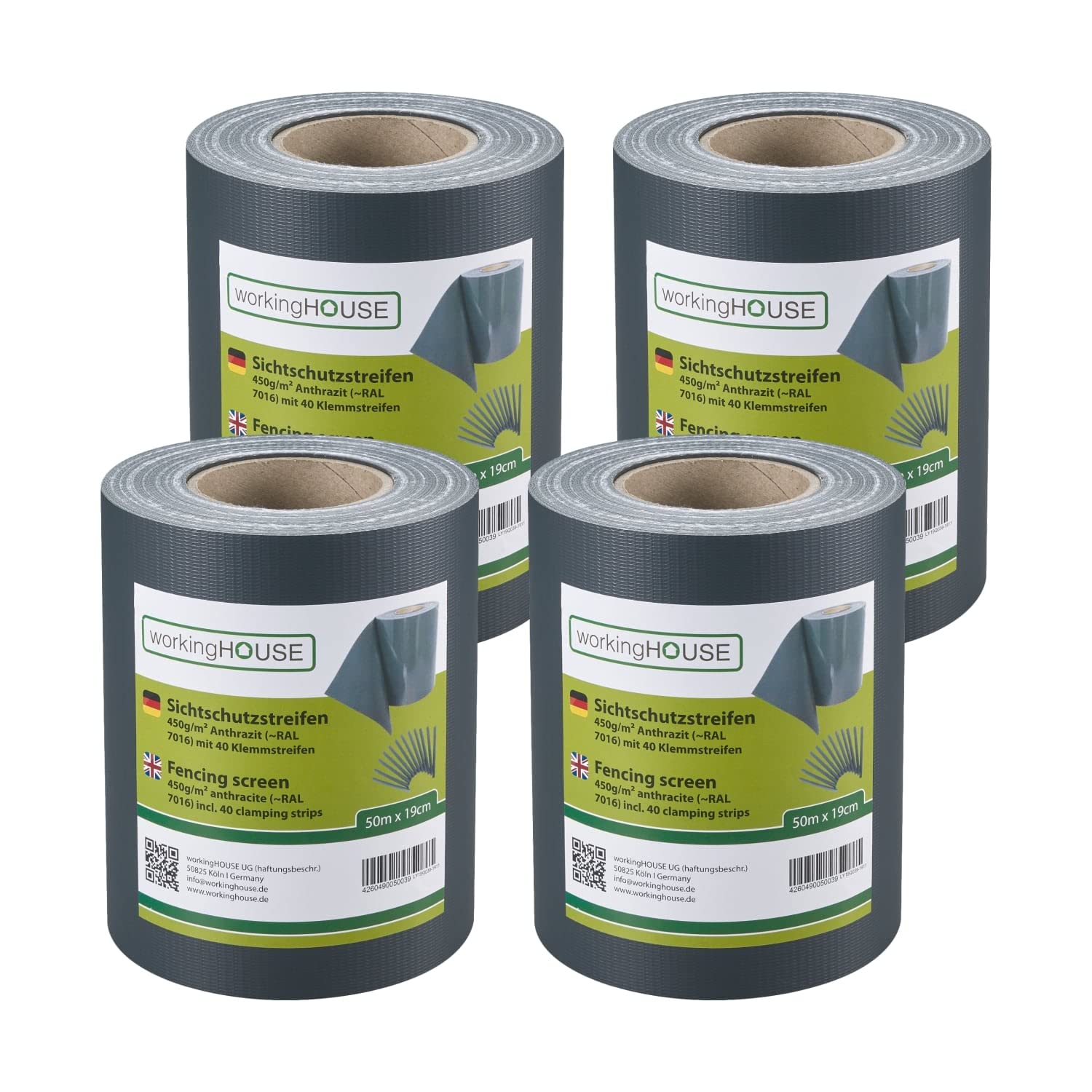WORKINGHOUSE PVC Sichtschutzstreifen 450g/m² Standard für Doppelstabmatten Zaun – 4er Spar-Set (200m Gesamtlänge), Anthrazit RAL 7016 | Wind- & Blickschutz, wetterfest, inkl. Clips