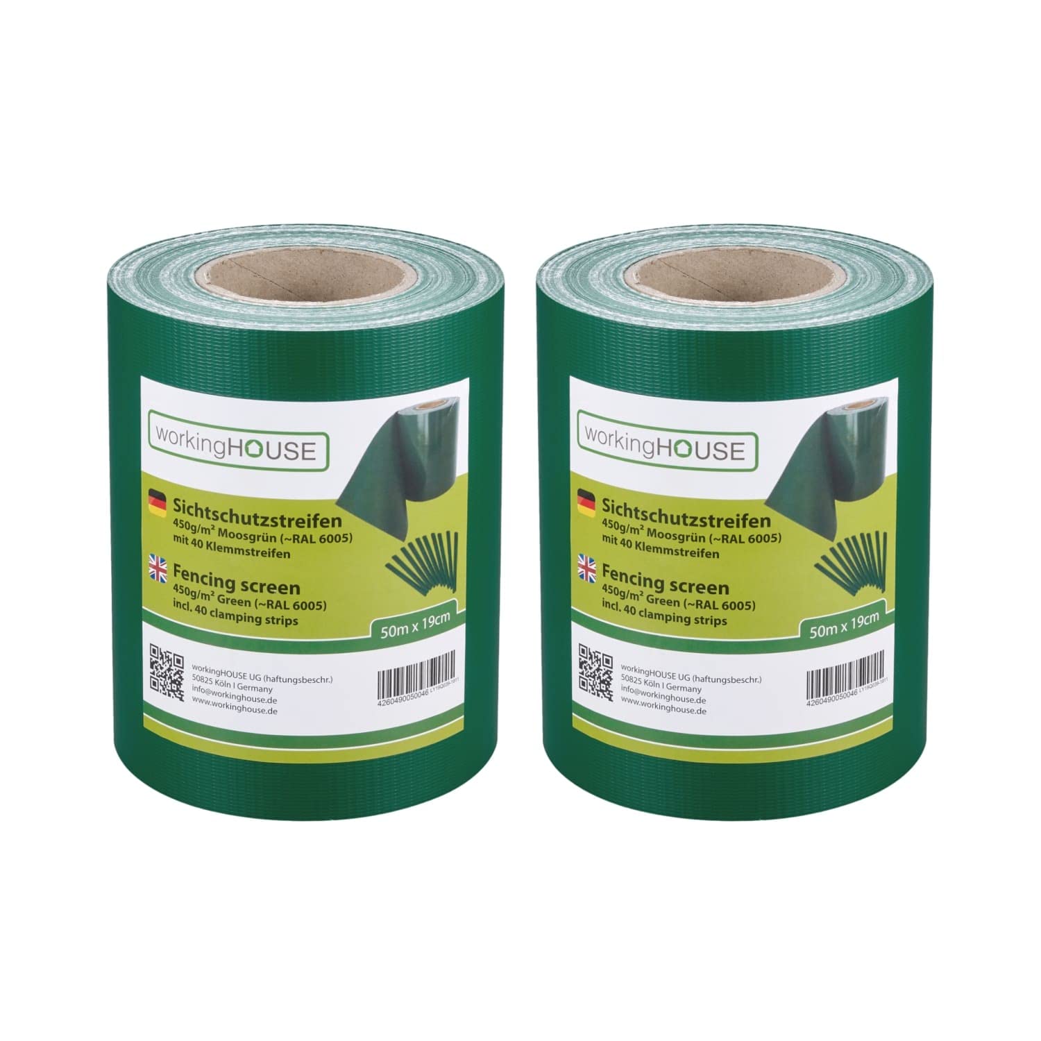 WORKINGHOUSE PVC Sichtschutzstreifen 450g/m² Standard für Doppelstabmatten Zaun – 2er Spar-Set (100m Gesamtlänge), Grün RAL 6005 | Wind- & Blickschutz, wetterfest, inkl. Clips
