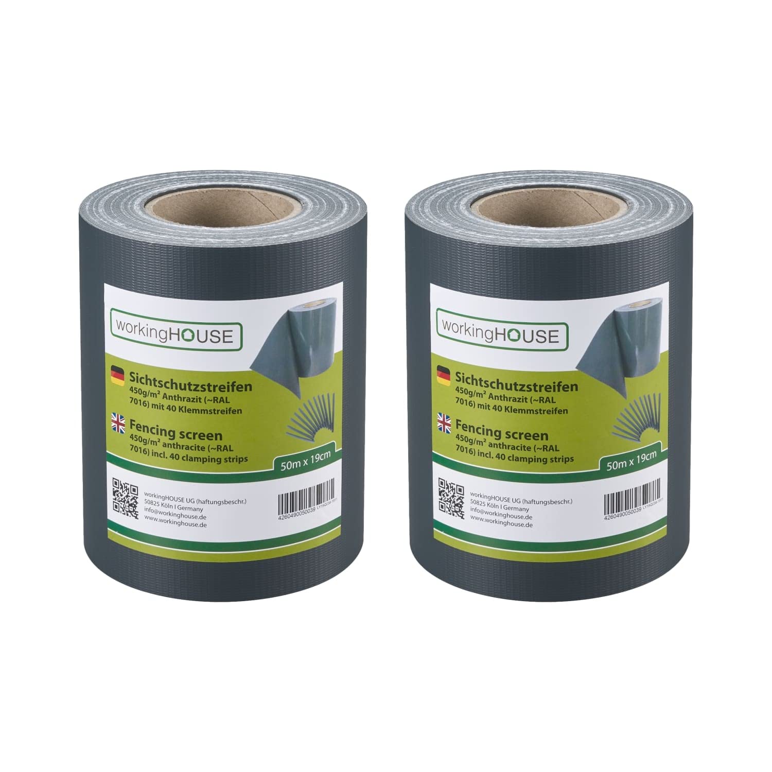 Die Preis-Leistungslösung von WORKINGHOUSE: Sichtschutzstreifen 450 g/m² StandardDie 450 g/m² PVC Sichtschutzstreifen sind die wirtschaftliche Standard-Lösung, um Ihren Doppelstabmattenzaun schnell und effektiv blickdicht zu machen. Dieses Produkt ist ideal für preisbewusste Käufer, die eine zuverlässige WORKINGHOUSE-Qualität für grosse Flächen oder Projekte suchen, bei denen die Kosten pro Meter entscheidend sind.Die 450 g/m² Stärke bietet einen soliden Schutz, ist leicht zu verarbeiten und sorgt für eine ansprechende Optik. Profitieren Sie von einem attraktiven Preis-Leistungs-Verhältnis, ohne auf die grundlegenden Schutzfunktionen verzichten zu müssen.Alle Vorteile der Standard-Serie:WIRTSCHAFTLICHE LÖSUNG: Das 450 g/m² PVC-Material bietet ein hervorragendes Preis-Leistungs-Verhältnis für die blickdichte Gestaltung grosser Zaunflächen.PERFEKTE ANWENDUNG: Ideal für alle gängigen Doppelstabmattenzäune und alle Maschenhöhen von 19-20 cm.WITTERUNGSBESTÄNDIG: UV-stabilisiert und wetterfest, dient als zuverlässiger Wind- & Blickschutz.MONTAGEFERTIG: Einfach zuzuschneiden und inklusive Befestigungsclips für die schnelle Anbringung.Verfügbare Längen:Wählen Sie die Länge, die zu Ihrem Projekt passt: Verfügbar in der Standardlänge 35m und der Grossen Länge **50m** sowie in attraktiven Spar-Sets (z.B. 4x 50m für 200m Gesamtlänge). Verfügbare Farben wie Anthrazit RAL 7016, Grün RAL 6005 und Hellgrau RAL 7040.
