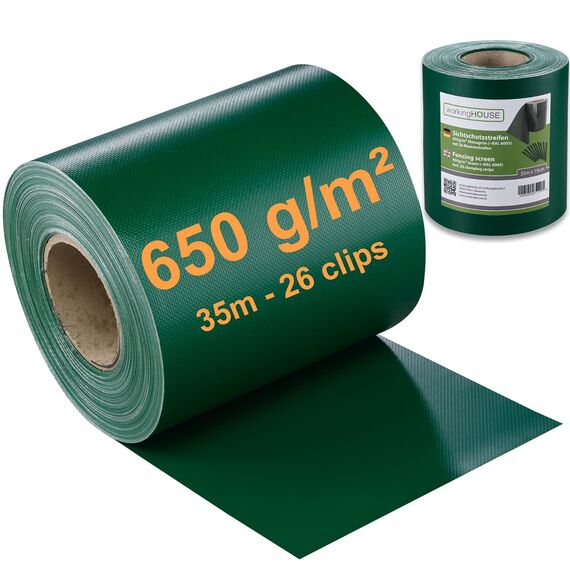 Verwandeln Sie Ihren Zaun in einen Premium-Sichtschutz – Mit WORKINGHOUSE 650 g/m²Geniessen Sie ungestörte Momente in Ihrem Garten. Die WORKINGHOUSE PVC Sichtschutzstreifen bieten die ideale Lösung, um Ihren Doppelstabmattenzaun schnell, langlebig und stilvoll blickdicht zu machen. Unsere Streifen sind nicht nur ein optisches Highlight, sondern setzen mit ihrer Premium-Qualität von 650 g/m² einen neuen Standard in Sachen Langlebigkeit und Stabilität.Warum 650 g/m² den Unterschied macht? Während Standard-Streifen oft nur 450 g/m² wiegen, bietet unser schweres Material eine überlegene Reissfestigkeit, absolute Blickdichte und eine Formstabilität, die auch starkem Wind standhält.Alle Vorteile auf einen Blick:MAXIMALE HALTBARKEIT: Das 650 g/m² starke PVC ist extrem robust, wetterfest und UV-beständig. Es widersteht Sonne, Regen und Frost, ohne auszubleichen oder zu verspröden.PERFEKTE PASSFORM: Speziell für alle gängigen Doppelstabmattenzäune (Typ 6/5/6 und 8/6/8) konzipiert. Die Streifen lassen sich mühelos und passgenau in die 19-cm-Maschen einflechten.EINFACHE MONTAGE: Die 35m Rolle lässt sich leicht mit einer Schere auf die gewünschte Länge zuschneiden. Befestigen Sie die Enden einfach mit den mitgelieferten Befestigungsclips – kein Spezialwerkzeug nötig.STILVOLLER WINDSCHUTZ: Neben dem effektiven Blickschutz dient das Material auch als zuverlässiger Windschutz und reduziert Windgeräusche im Garten.Wählen Sie Ihre Wunsch-Variante:Gestalten Sie Ihren Gartenzaun individuell. Unsere Streifen sind in mehreren modernen Farben erhältlich, die perfekt zu Haus und Garten passen:Anthrazit (RAL 7016)Hellgrau (RAL 7040)Grün (RAL 6005)Ob für ein kleines Projekt oder einen kompletten Gartenzaun – wählen Sie zwischen der praktischen 35m Rolle oder dem 4er Spar-Set (insgesamt 140m Gesamtlänge) für grosse Flächen.Lieferumfang:Je nach Auswahl: 1x 35m Rolle (oder 4x 35m Rolle) WORKINGHOUSE PVC SichtschutzstreifenAusreichende Anzahl an Befestigungsclips