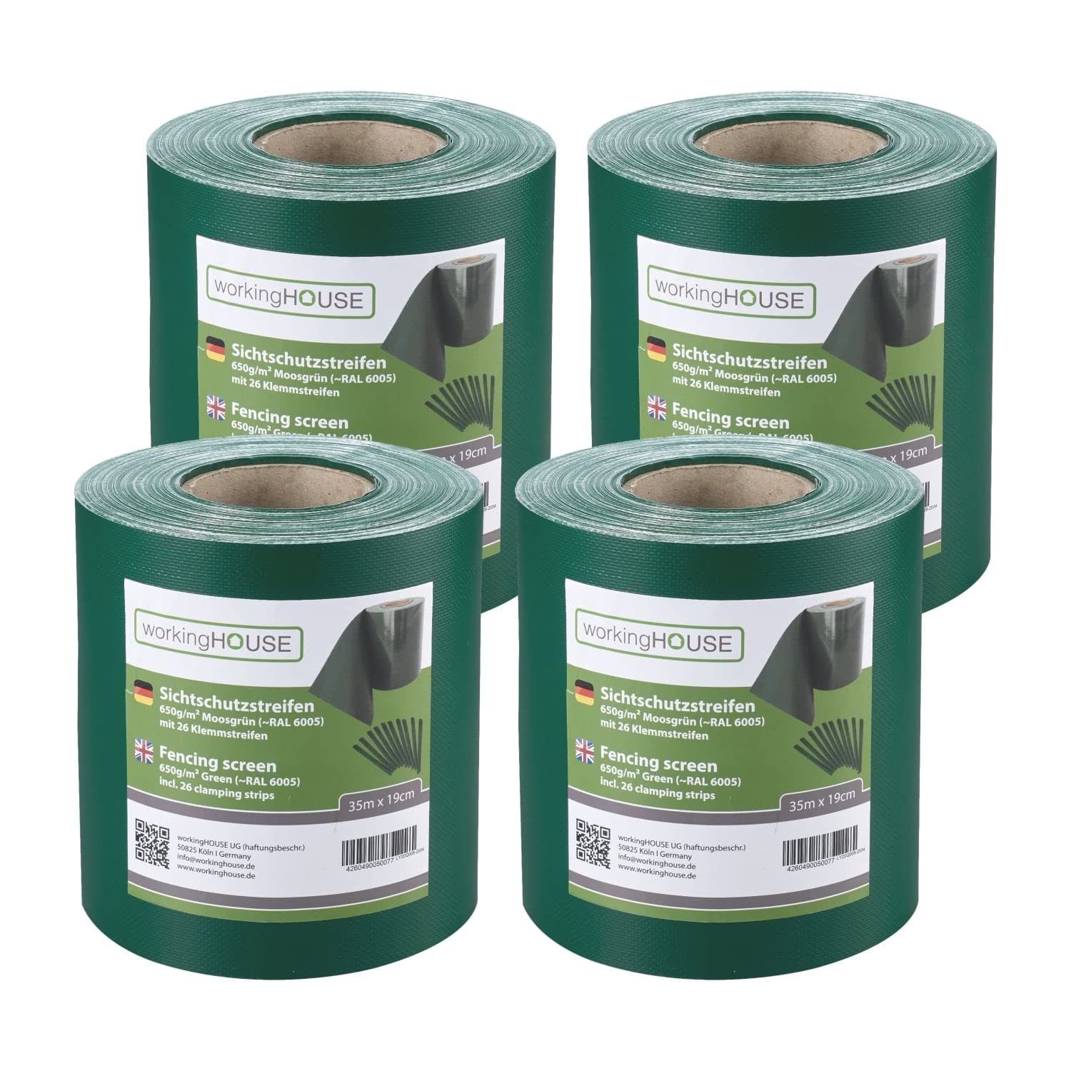 Verwandeln Sie Ihren Zaun in einen Premium-Sichtschutz – Mit WORKINGHOUSE 650 g/m²Geniessen Sie ungestörte Momente in Ihrem Garten. Die WORKINGHOUSE PVC Sichtschutzstreifen bieten die ideale Lösung, um Ihren Doppelstabmattenzaun schnell, langlebig und stilvoll blickdicht zu machen. Unsere Streifen sind nicht nur ein optisches Highlight, sondern setzen mit ihrer Premium-Qualität von 650 g/m² einen neuen Standard in Sachen Langlebigkeit und Stabilität.Warum 650 g/m² den Unterschied macht? Während Standard-Streifen oft nur 450 g/m² wiegen, bietet unser schweres Material eine überlegene Reissfestigkeit, absolute Blickdichte und eine Formstabilität, die auch starkem Wind standhält.Alle Vorteile auf einen Blick:MAXIMALE HALTBARKEIT: Das 650 g/m² starke PVC ist extrem robust, wetterfest und UV-beständig. Es widersteht Sonne, Regen und Frost, ohne auszubleichen oder zu verspröden.PERFEKTE PASSFORM: Speziell für alle gängigen Doppelstabmattenzäune (Typ 6/5/6 und 8/6/8) konzipiert. Die Streifen lassen sich mühelos und passgenau in die 19-cm-Maschen einflechten.EINFACHE MONTAGE: Die 35m Rolle lässt sich leicht mit einer Schere auf die gewünschte Länge zuschneiden. Befestigen Sie die Enden einfach mit den mitgelieferten Befestigungsclips – kein Spezialwerkzeug nötig.STILVOLLER WINDSCHUTZ: Neben dem effektiven Blickschutz dient das Material auch als zuverlässiger Windschutz und reduziert Windgeräusche im Garten.Wählen Sie Ihre Wunsch-Variante:Gestalten Sie Ihren Gartenzaun individuell. Unsere Streifen sind in mehreren modernen Farben erhältlich, die perfekt zu Haus und Garten passen:Anthrazit (RAL 7016)Hellgrau (RAL 7040)Grün (RAL 6005)Ob für ein kleines Projekt oder einen kompletten Gartenzaun – wählen Sie zwischen der praktischen 35m Rolle oder dem 4er Spar-Set (insgesamt 140m Gesamtlänge) für grosse Flächen.Lieferumfang:Je nach Auswahl: 1x 35m Rolle (oder 4x 35m Rolle) WORKINGHOUSE PVC SichtschutzstreifenAusreichende Anzahl an Befestigungsclips