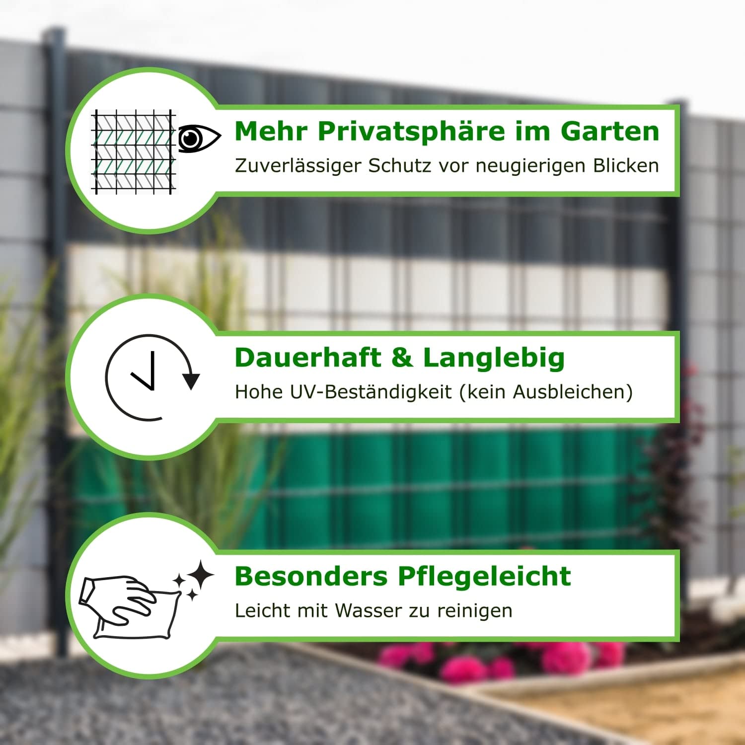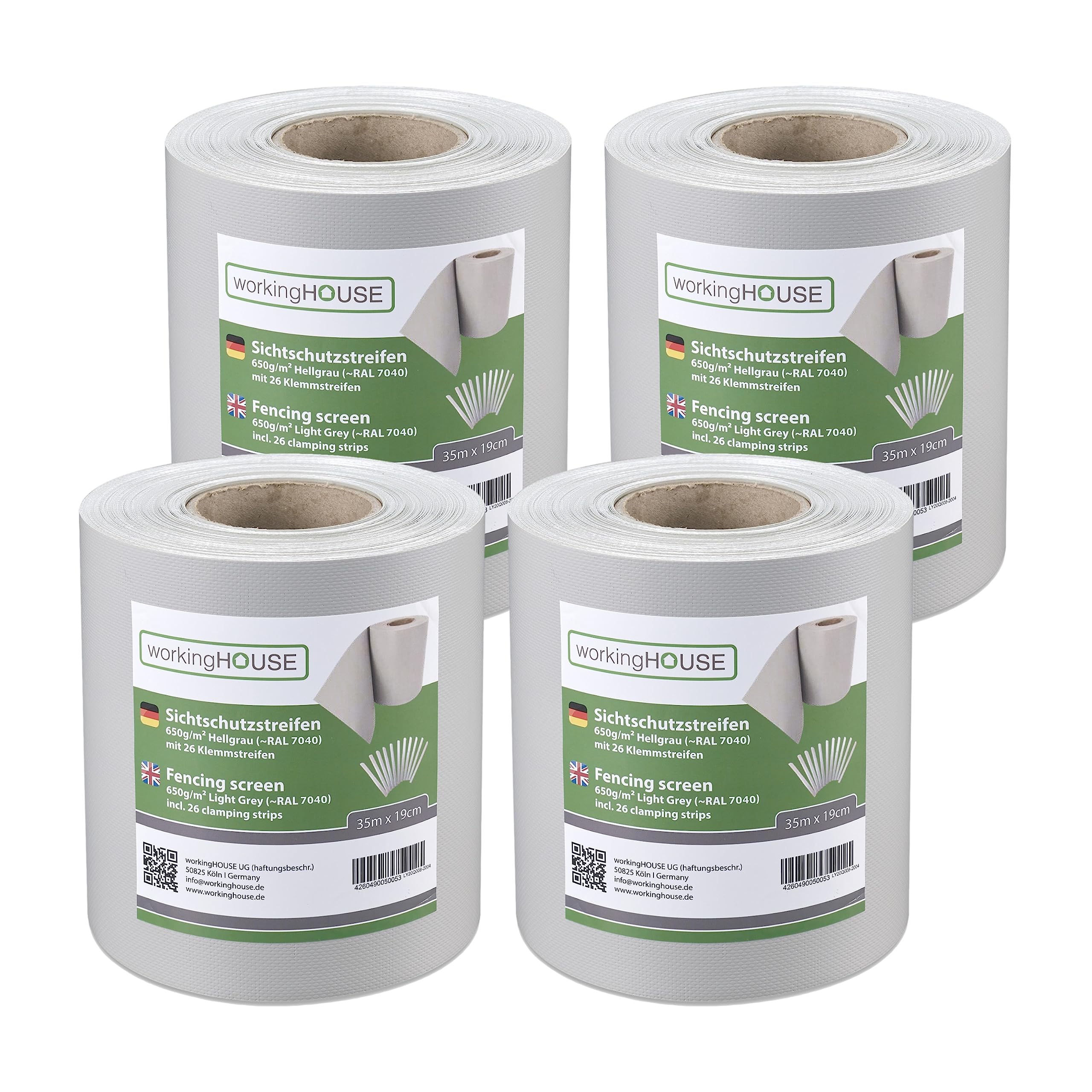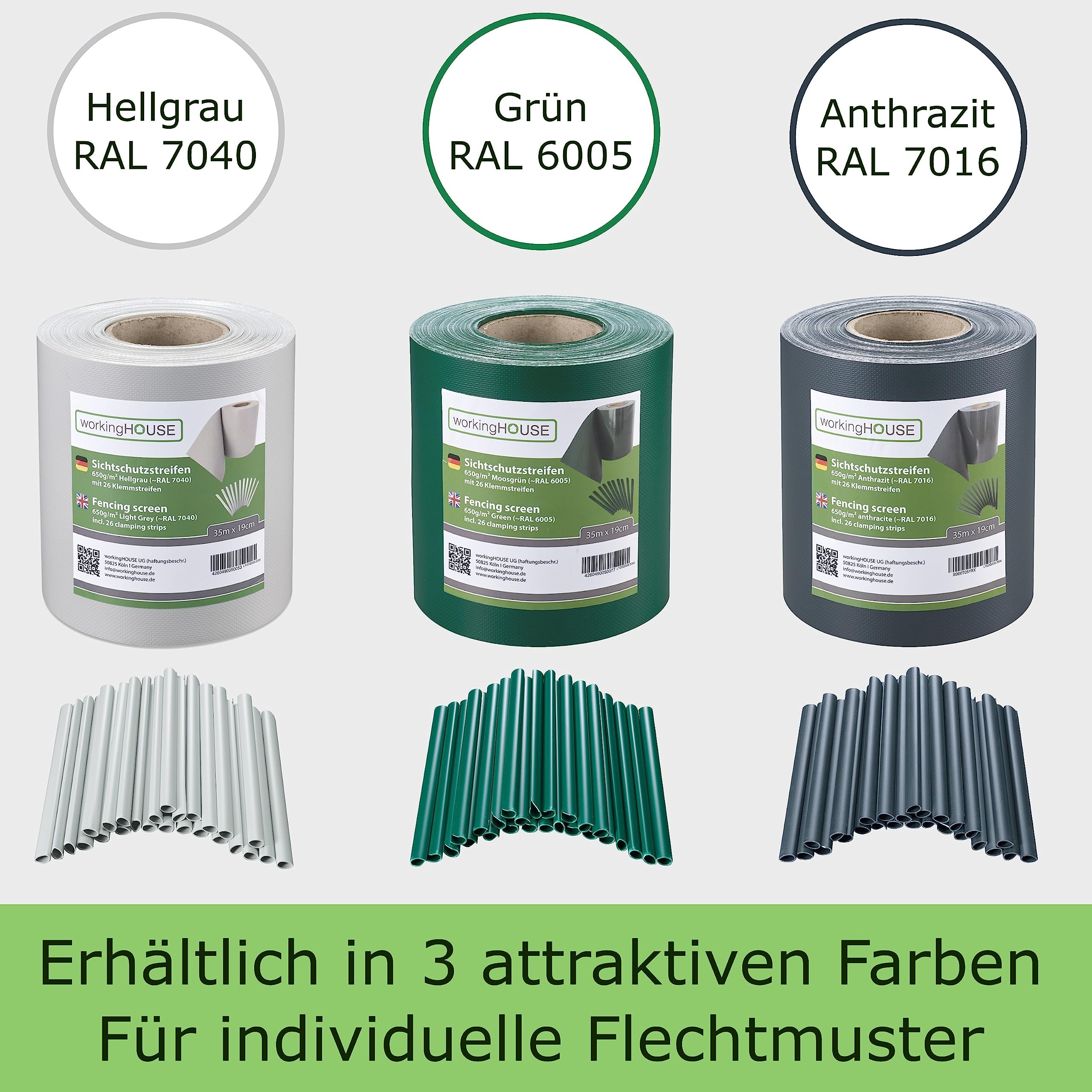 Verwandeln Sie Ihren Zaun in einen Premium-Sichtschutz – Mit WORKINGHOUSE 650 g/m²Geniessen Sie ungestörte Momente in Ihrem Garten. Die WORKINGHOUSE PVC Sichtschutzstreifen bieten die ideale Lösung, um Ihren Doppelstabmattenzaun schnell, langlebig und stilvoll blickdicht zu machen. Unsere Streifen sind nicht nur ein optisches Highlight, sondern setzen mit ihrer Premium-Qualität von 650 g/m² einen neuen Standard in Sachen Langlebigkeit und Stabilität.Warum 650 g/m² den Unterschied macht? Während Standard-Streifen oft nur 450 g/m² wiegen, bietet unser schweres Material eine überlegene Reissfestigkeit, absolute Blickdichte und eine Formstabilität, die auch starkem Wind standhält.Alle Vorteile auf einen Blick:MAXIMALE HALTBARKEIT: Das 650 g/m² starke PVC ist extrem robust, wetterfest und UV-beständig. Es widersteht Sonne, Regen und Frost, ohne auszubleichen oder zu verspröden.PERFEKTE PASSFORM: Speziell für alle gängigen Doppelstabmattenzäune (Typ 6/5/6 und 8/6/8) konzipiert. Die Streifen lassen sich mühelos und passgenau in die 19-cm-Maschen einflechten.EINFACHE MONTAGE: Die 35m Rolle lässt sich leicht mit einer Schere auf die gewünschte Länge zuschneiden. Befestigen Sie die Enden einfach mit den mitgelieferten Befestigungsclips – kein Spezialwerkzeug nötig.STILVOLLER WINDSCHUTZ: Neben dem effektiven Blickschutz dient das Material auch als zuverlässiger Windschutz und reduziert Windgeräusche im Garten.Wählen Sie Ihre Wunsch-Variante:Gestalten Sie Ihren Gartenzaun individuell. Unsere Streifen sind in mehreren modernen Farben erhältlich, die perfekt zu Haus und Garten passen:Anthrazit (RAL 7016)Hellgrau (RAL 7040)Grün (RAL 6005)Ob für ein kleines Projekt oder einen kompletten Gartenzaun – wählen Sie zwischen der praktischen 35m Rolle oder dem 4er Spar-Set (insgesamt 140m Gesamtlänge) für grosse Flächen.Lieferumfang:Je nach Auswahl: 1x 35m Rolle (oder 4x 35m Rolle) WORKINGHOUSE PVC SichtschutzstreifenAusreichende Anzahl an Befestigungsclips
