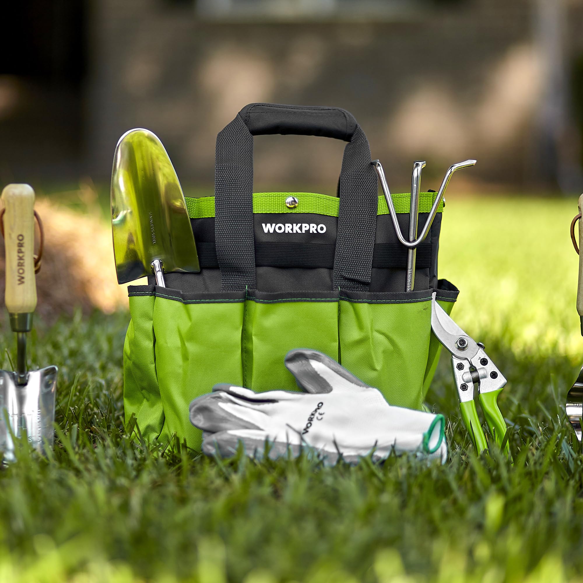 WORKPRO Gartenwerkzeug Set, 8 in 1 Gartengeräte mit Aufbewahrungstasche, aus Edelstahl, Gartenschaufel mit Holzgriff, Blumenschere, Gartenkralle, Handgrubber, Geschenk für Gärtnerinnen und Gärtner