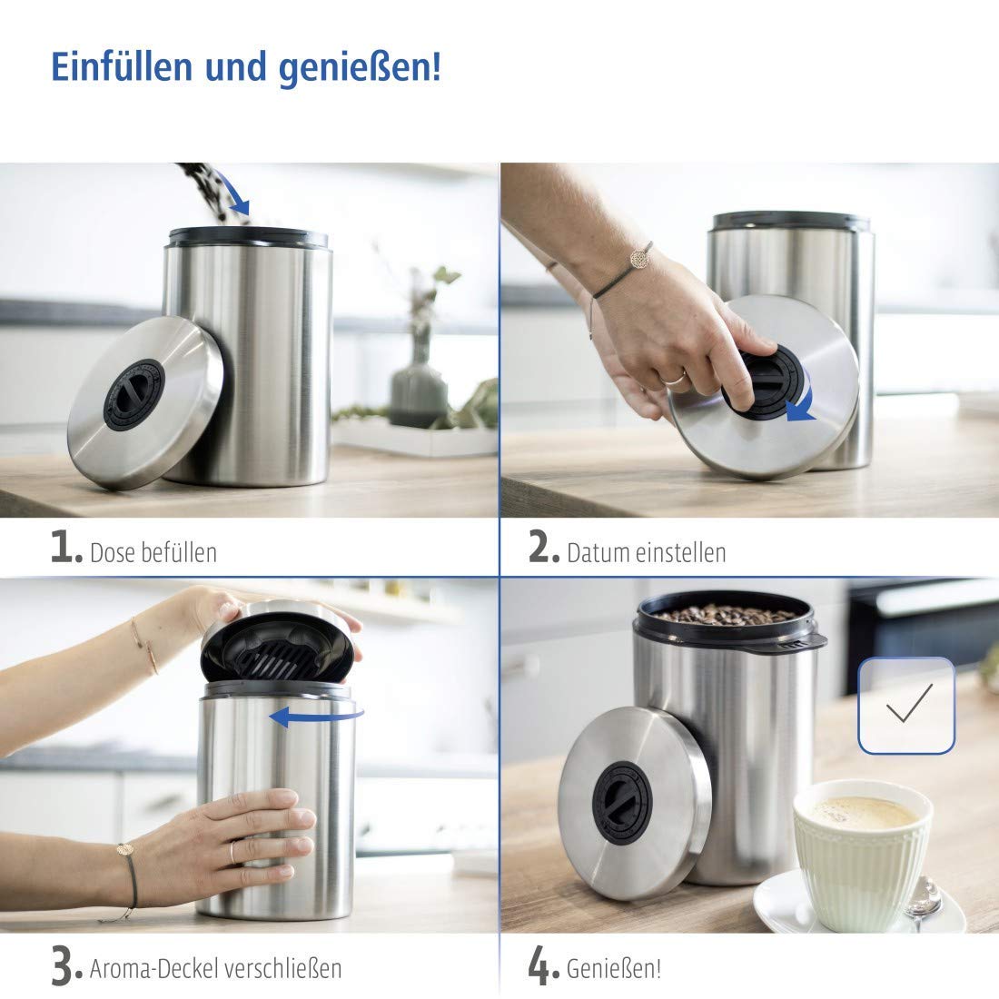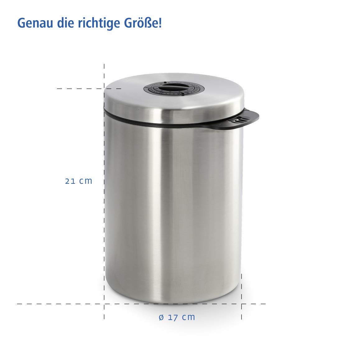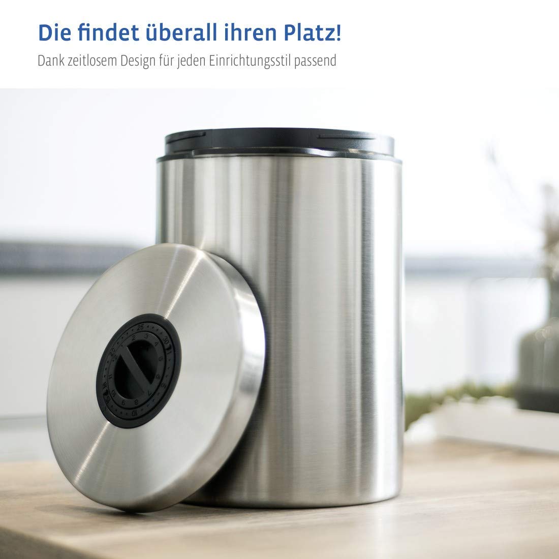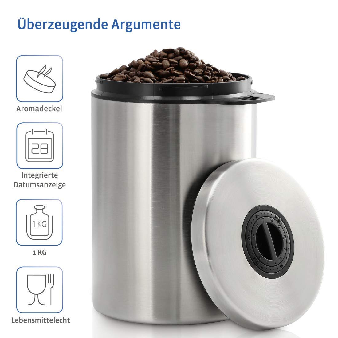 Luftdichte Kaffeedose für 1kg Bohnen mit Aromaverschluss Der Edelstahl behälter kann auch als Dose zur Aufbewahrung von anderen Lebensmitteln genutzt werden, wie z.B. Tee, Kakao, Nudeln etc. Fassungsvermögen: 1 kg Kaffeebohnen, 1,2 kg gemahlener Pulver-Kaffee Abmessung Edelstahl-Dose: 17 x 21,8 x 17cm Weitere Features: Integrierte Datumsanzeige, Stauraum im Inneren des Deckels bietet Platz für ein feuchtigkeitsregulierendes Granulat oder Duftstoffe, Drehverschluss, seitlicher Griff, lebensmittelecht