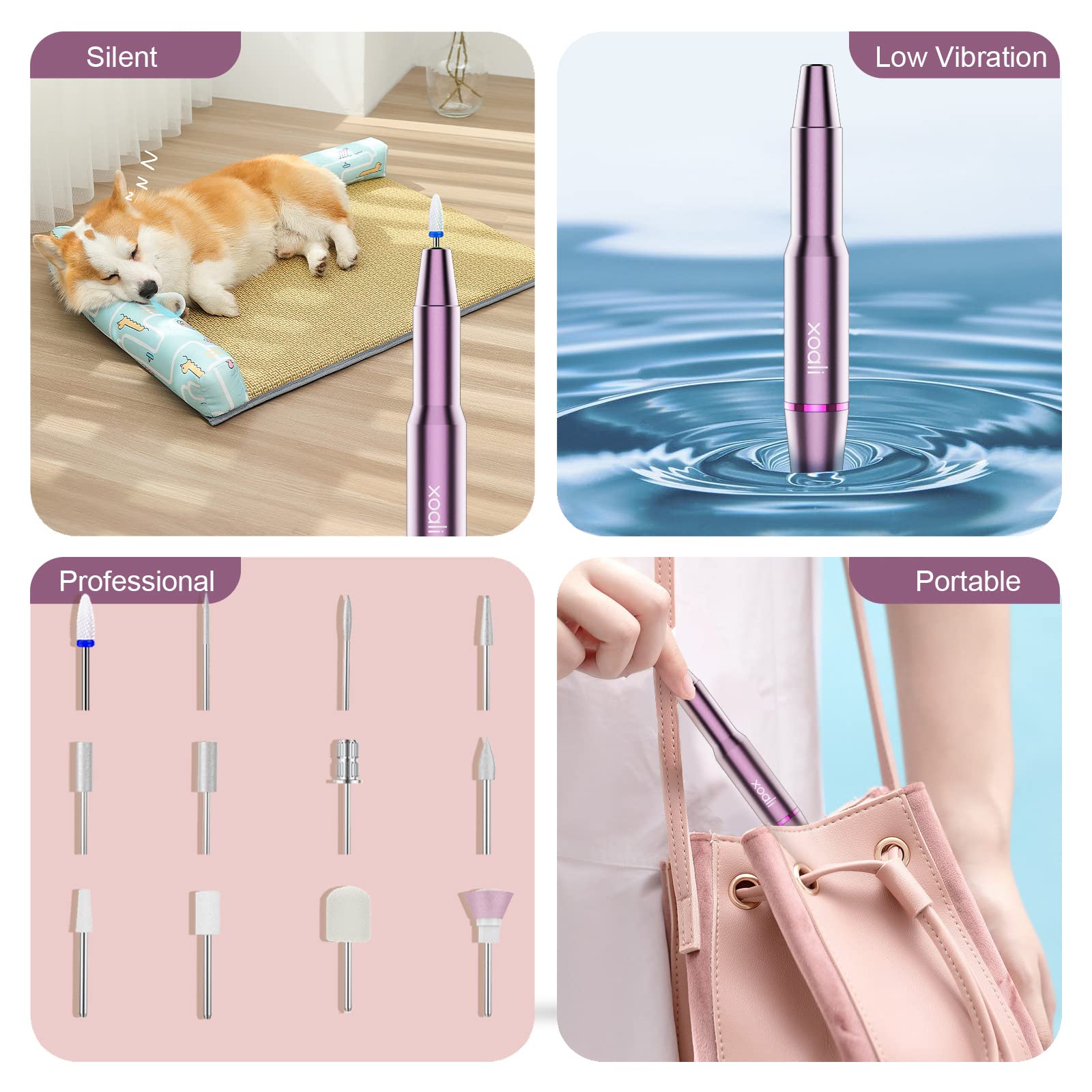 • 12 in 1 Set fuer vielseitige Nagelpflege Der Xoali elektrische Nagelfraeser wird als umfangreiches Manikuere und Pedikuere Set geliefert mit Keramik Mais Bit, Schleif und Polier Bits, Schleifbaendern, Staubbuerste und USB Kabel. Geeignet fuer Nagelkunst, Gel und Acrylnagel sowie fuer die Pflege von Naturnaegeln.