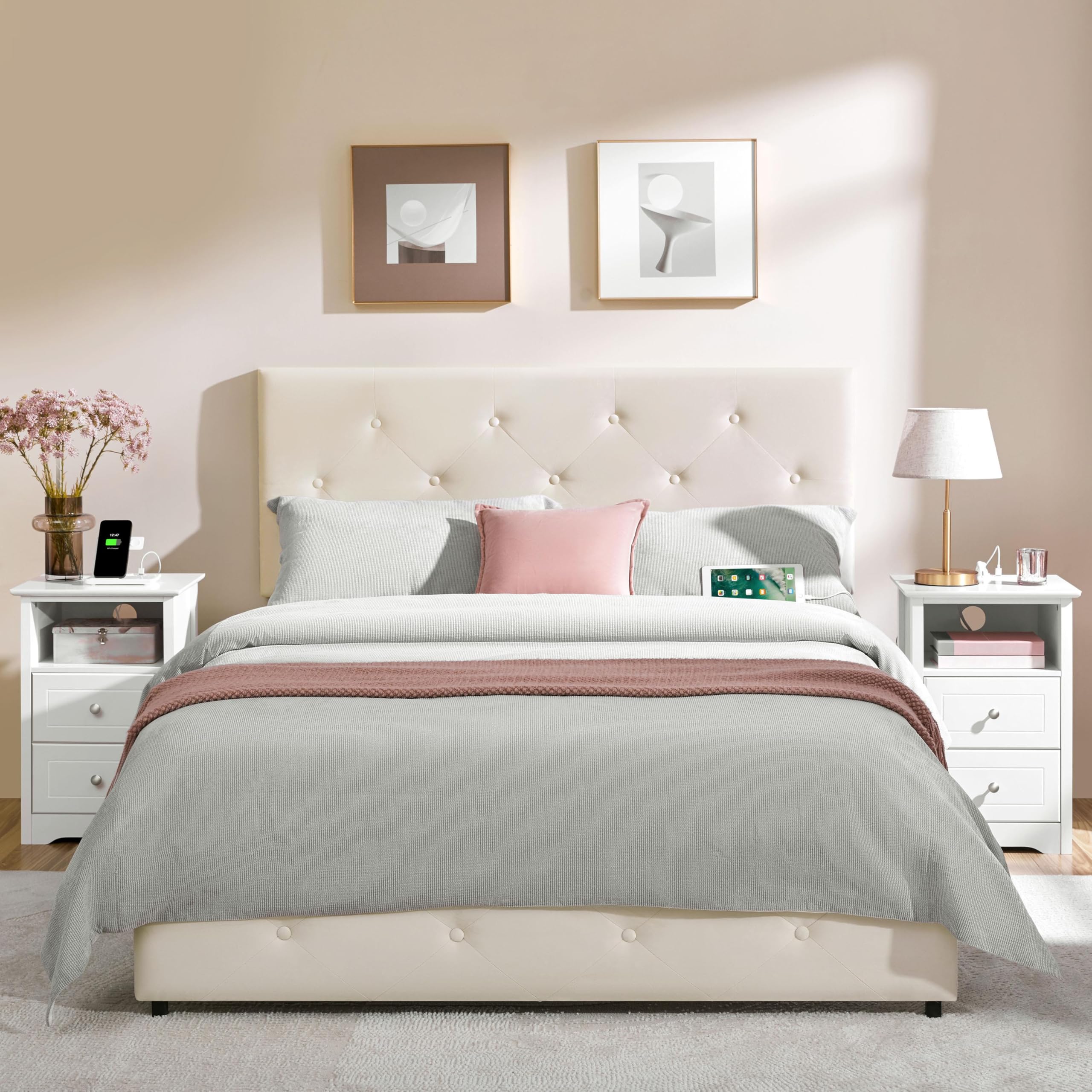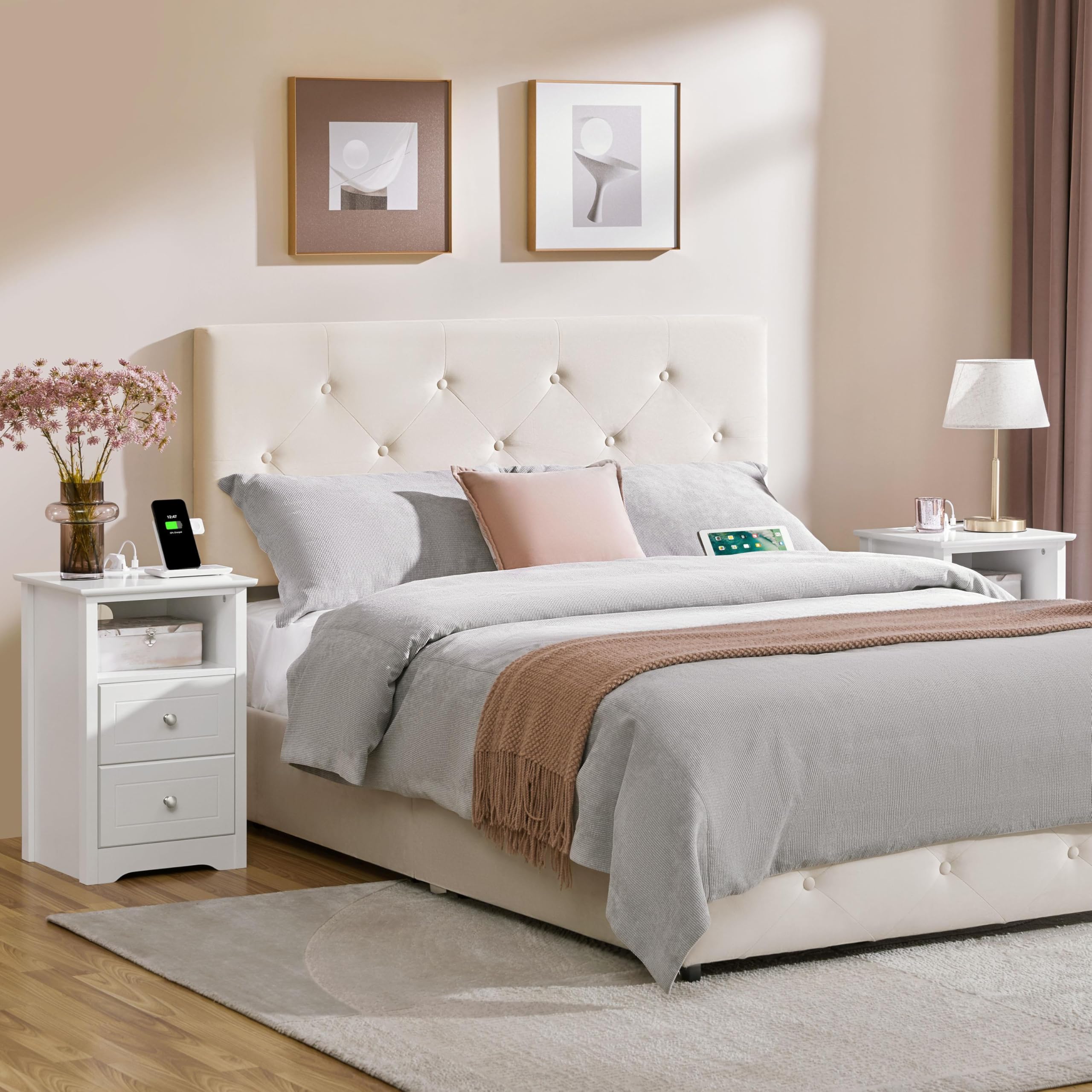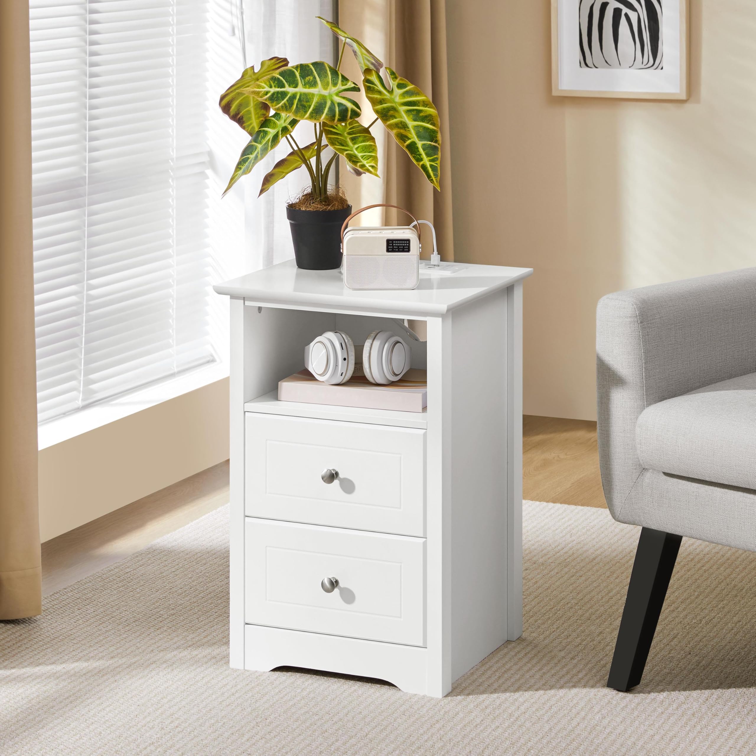 Suchen Sie nach einem schlichten und praktischen Nachttisch? Dieser Beistelltisch mit Ladestation ist eine optimale Option. Diese Ladestation verfügt über zwei Steckdosen, zwei USB-Anschlüsse und ein Netzkabel mit der Länge von 2 m. Dank der integrierten Ladestation ermöglicht Ihnen der Beistelltisch, Ihre elektronischen Geräte wie Handy, Leselampe und dergleichen bequem aufzuladen. Der Tisch ist mit einem offenen Ablagefach und zwei Schubladen ausgestattet und bietet Ihnen die ideale Aufbewahrung für die Brille, Fernbedienung, Handcreme, Bücher, USB-Kabeln und dergleichen. Auf der Tischplatte können Sie die Lampe, Vase mit Blumen und Fotorahmen stellen. Die Alltagsgegenstände sind immer griffbereit.