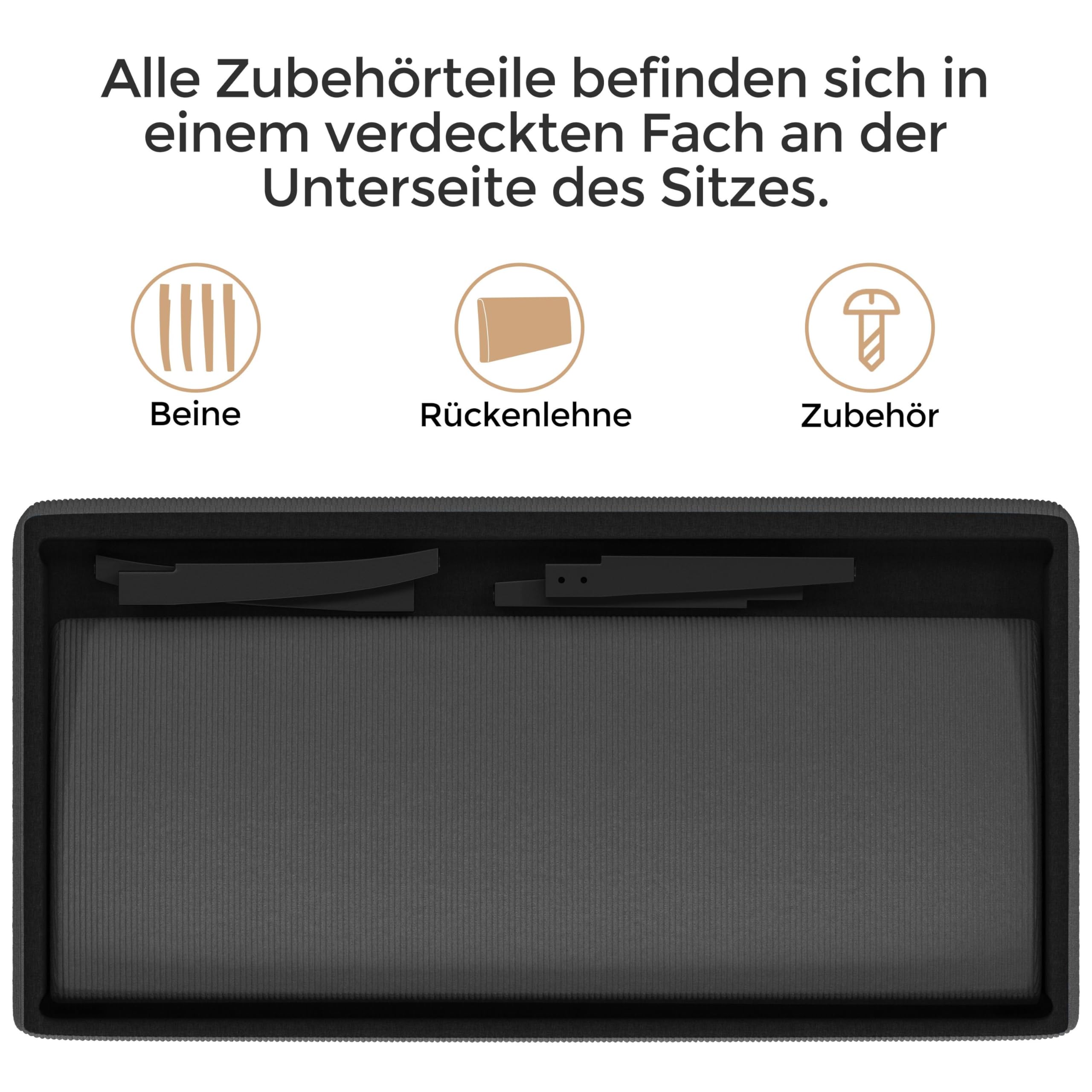 Material: Cordstoff aus Polyester, Schaumstoff, Gummibaumholz, Sperrholz, Metall, Kunststoff, Vliesstoff