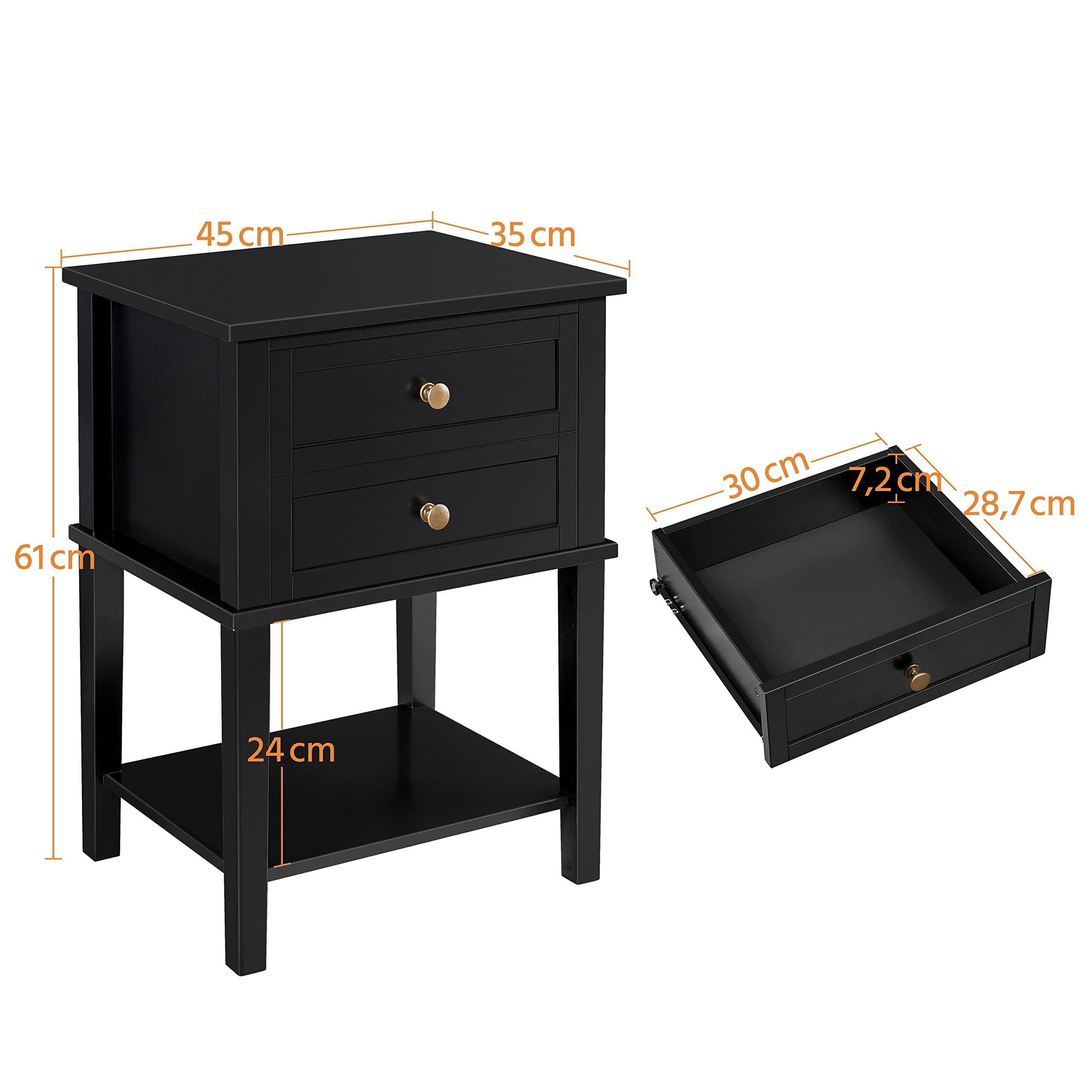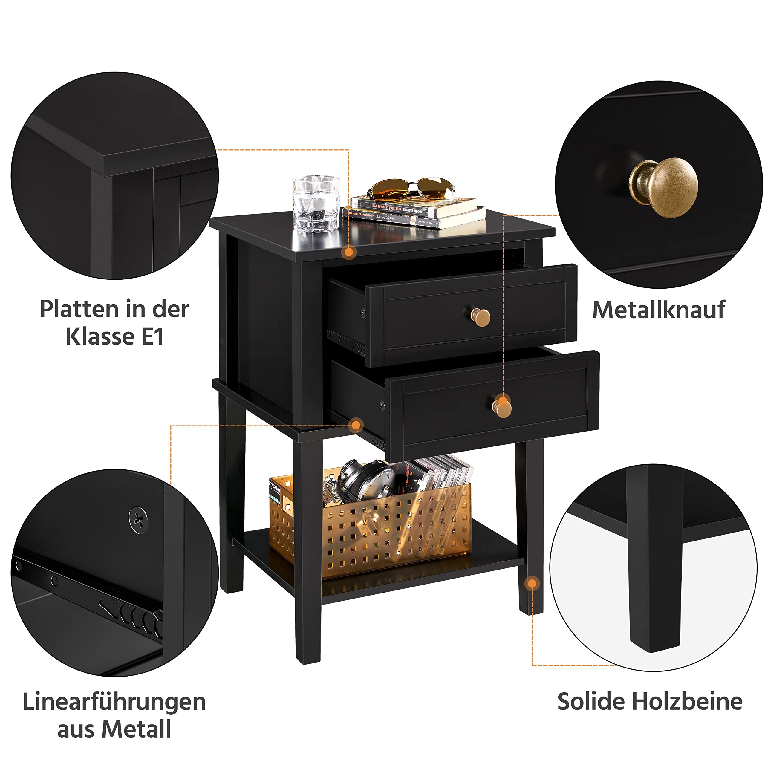 Unser Nachttisch besteht aus MDF-Holzplatten und kann maximal mit bis zu 35 kg belastet werden. 2 Schubladen und 1 unteres Regal bieten Ihnen reichlich Möglichkeiten zur Aufbewahrung Ihrer Kleidung, von Handtüchern oder Büroutensilien. Dank einer wasserabweisenden Beschichtung ist unser Nachttisch einfach und leicht zu reinigen. Aufgrund seiner Grösse eignet sich unser Beistelltisch ideal für den Einsatz an vielen verschiedenen Orten wie z.B. zu Hause, im Büro, im Wohnzimmer oder im Schlafzimmer.