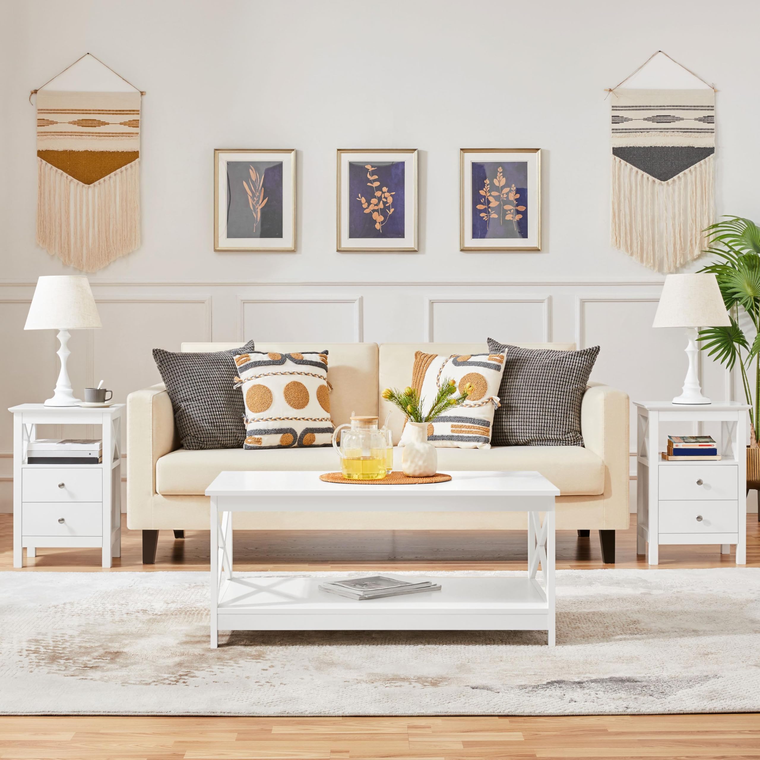 Dieser Beistelltisch besteht aus den robusten MDF-Holzplatten und Metall. 2 Schubladen und 1 offene Ablage bieten viel Platz für Ihre alltäglichen Gegenstände. Auf der Tischplatte können Sie Ihre Lampen, Fotorahmen, Topfpflanze und dergleichen aufstellen. Sie können den vielseitigen Tisch als Couchtisch im Wohnzimmer, als Nachtkommode im Schlafzimmer oder im Flur verwenden. Dank des schlichten Designs fügt er sich optimal in den verschiedenen Wohnstilen ein.