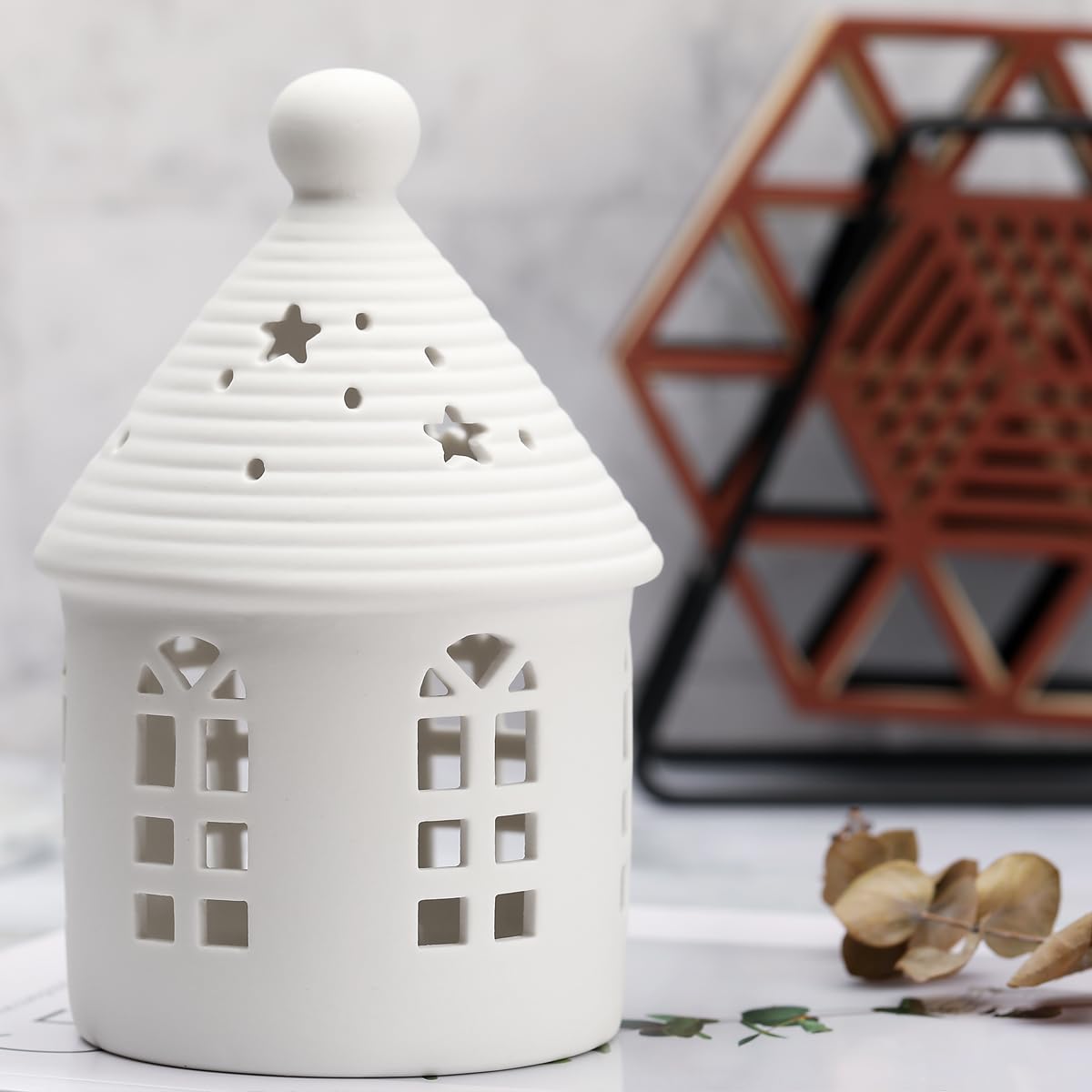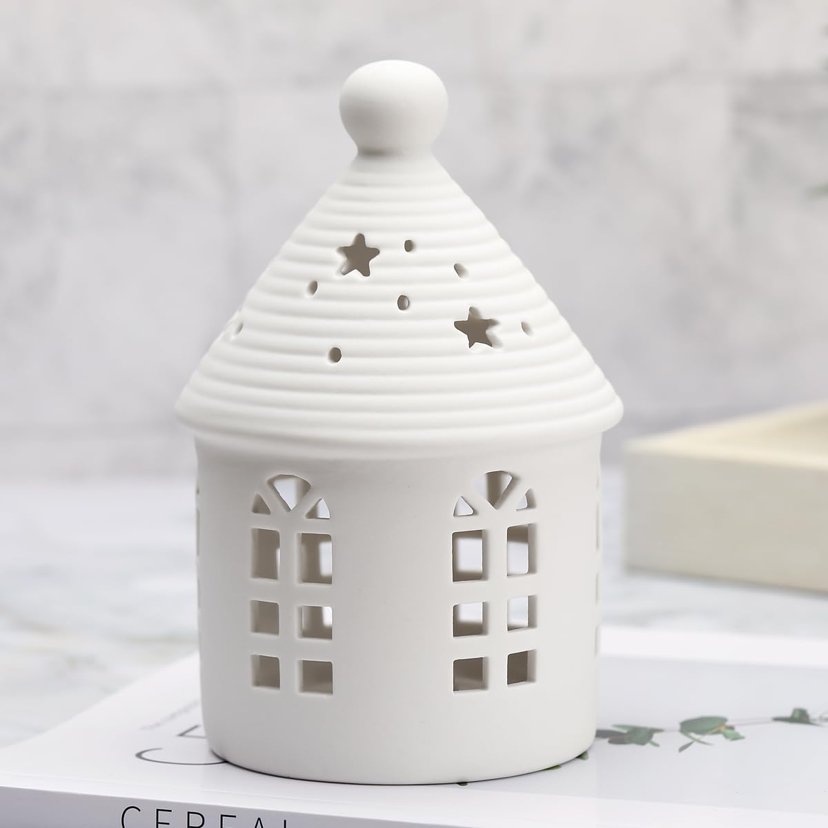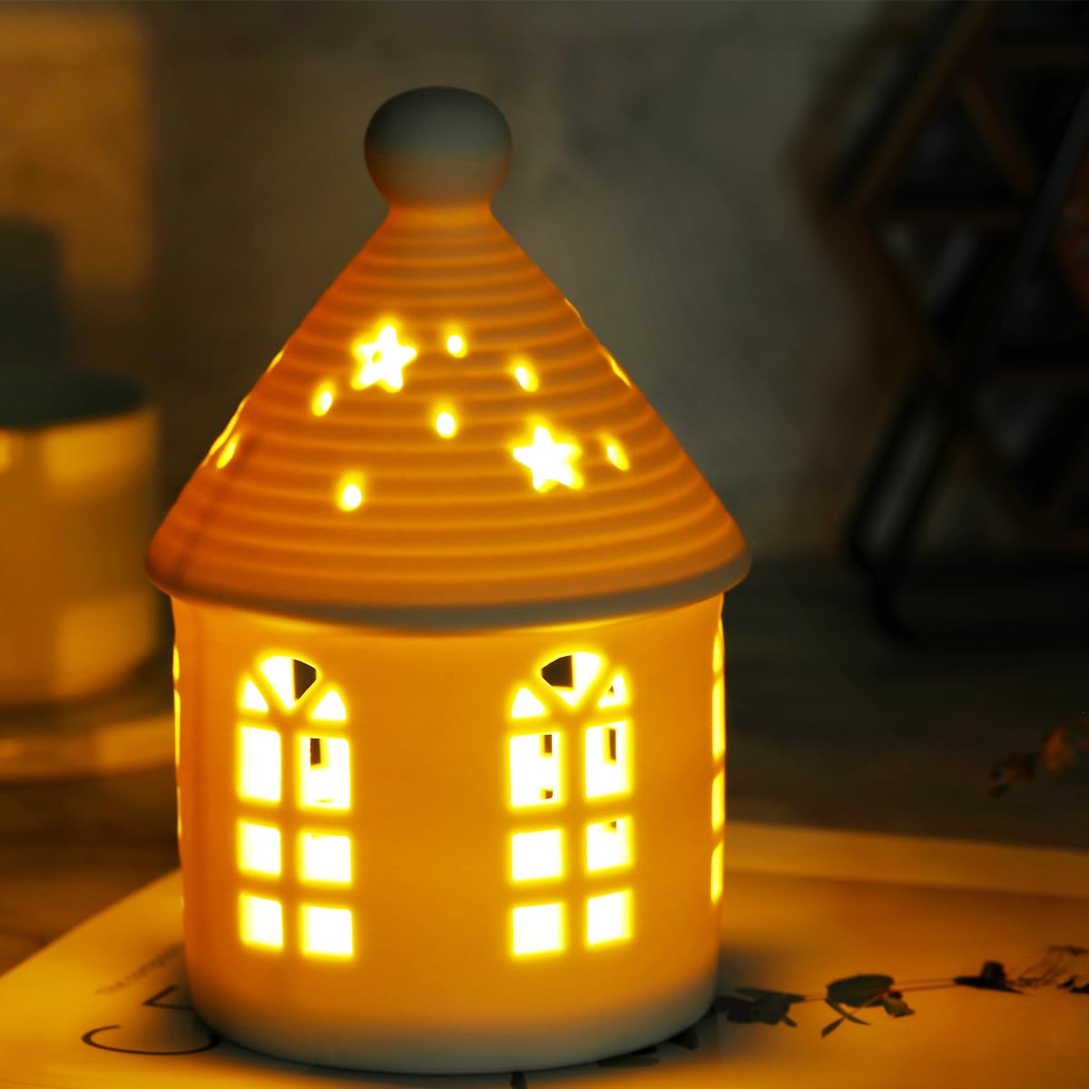 Yeerockal Keramic Xmas Dekohaus mit LED Leuchtmittel | 14cm Höhe | LED 2 x LR44 Batterien Inkl | Weiss Teelichthalter Xmas DIY Dekoration (Style A)