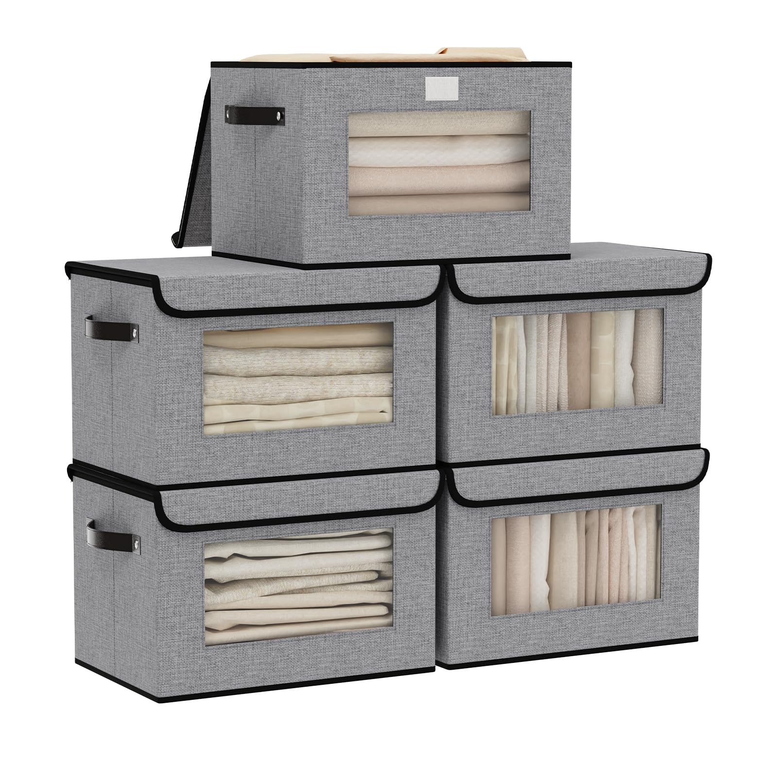 YheenLf 5 StüCk Aufbewahrungsboxen Stoff, Faltbare Aufbewahrungsbox, Boxen mit Deckel Aufbewahrung, Ordnungsboxen, Schrank Organizer mit Fenster, Grau, 33x23x20cm