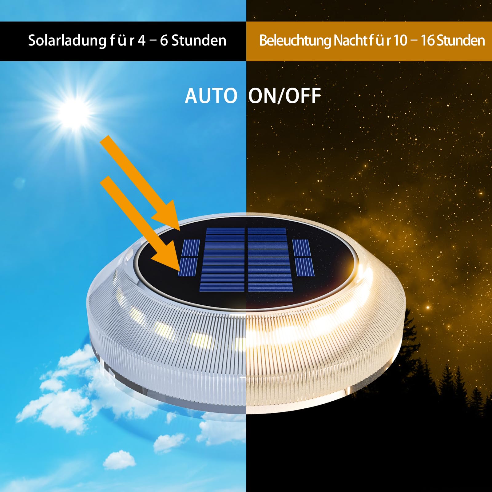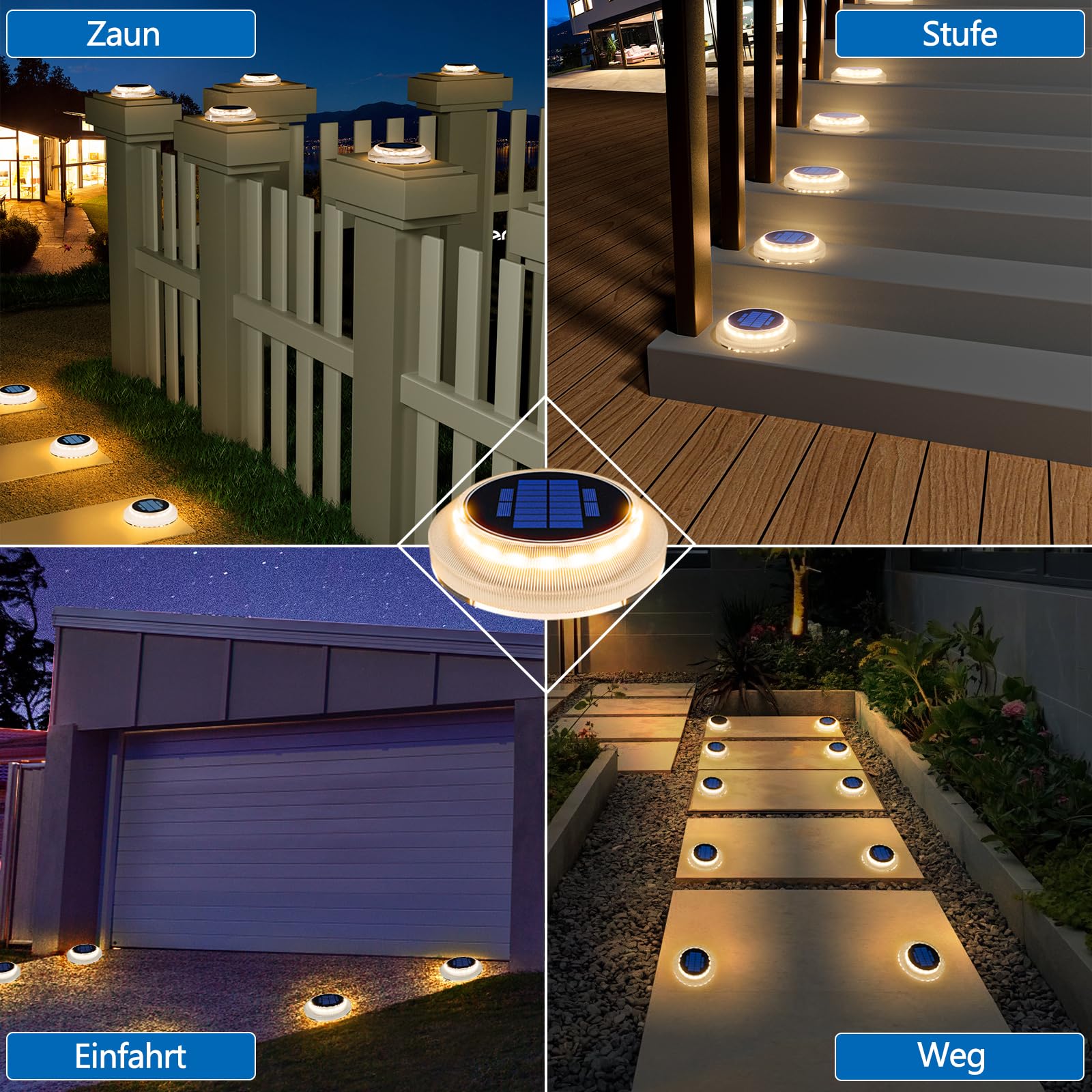 - 【Wasserdicht und druckbeständig】Die solarlampen für aussen garten besteht aus druckbeständigen Materialien und nimmt Ultraschallschweisstechnologie an. Sie ist wirklich IP68 wasserdicht und kann 10 Tonnen standhalten. Sie kann als Garagenstrassenlampe verwendet werden.