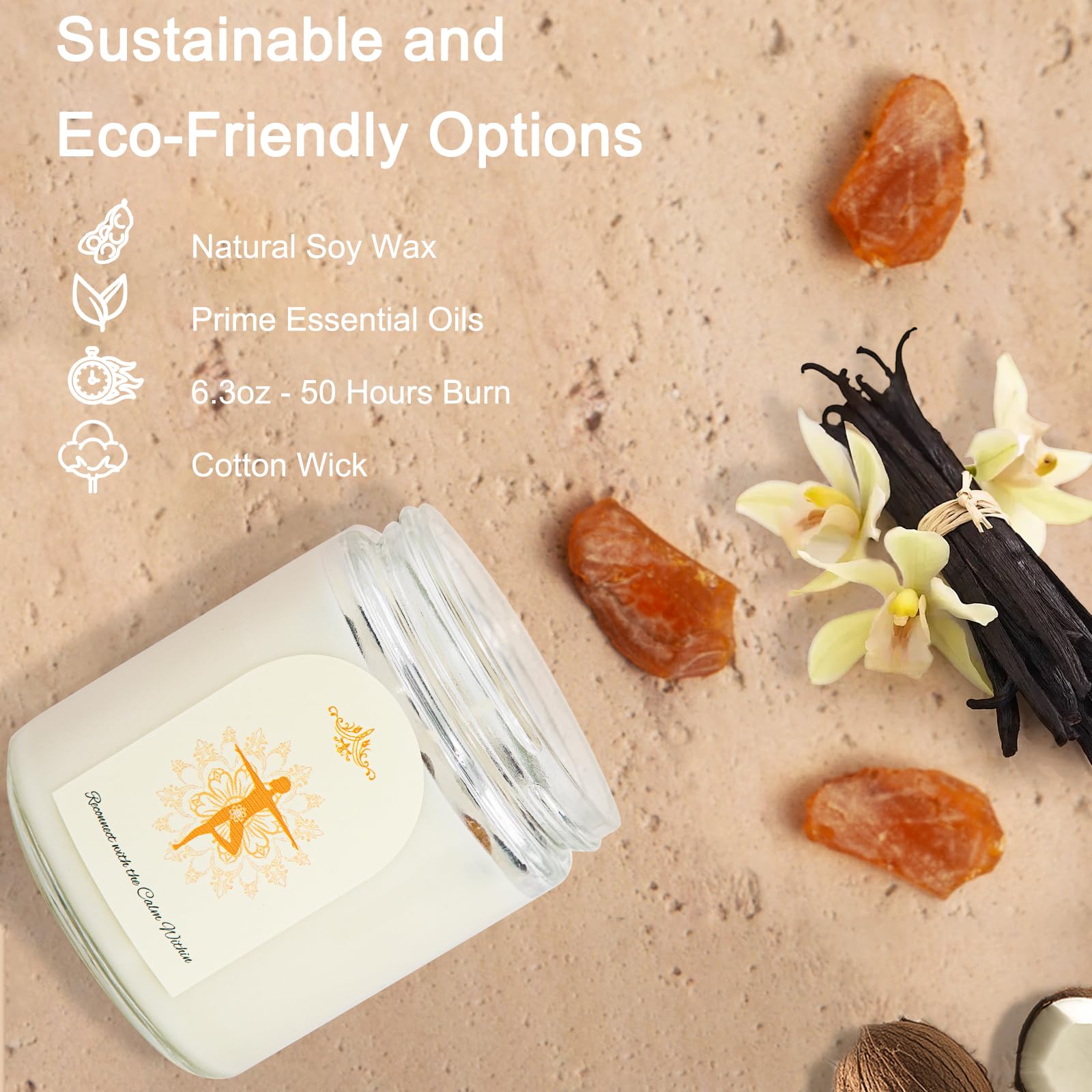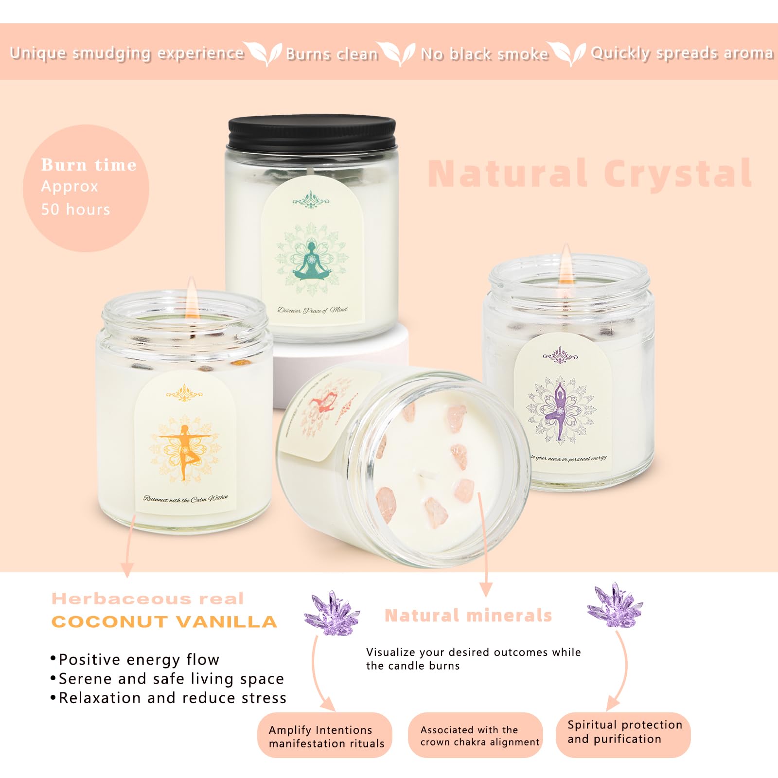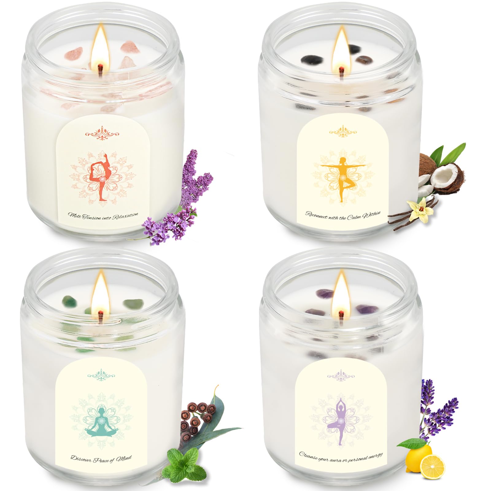 Kristallsteine Duftkerzen für Zuhause Natürliche Sojawachs Kerzen mit 4 Aromen (Kokos, Zitrone, Flieder, Eukalyptus) Rauchfrei + 45-50h Brenndauer im Geschenkset Geschenke für Frauen