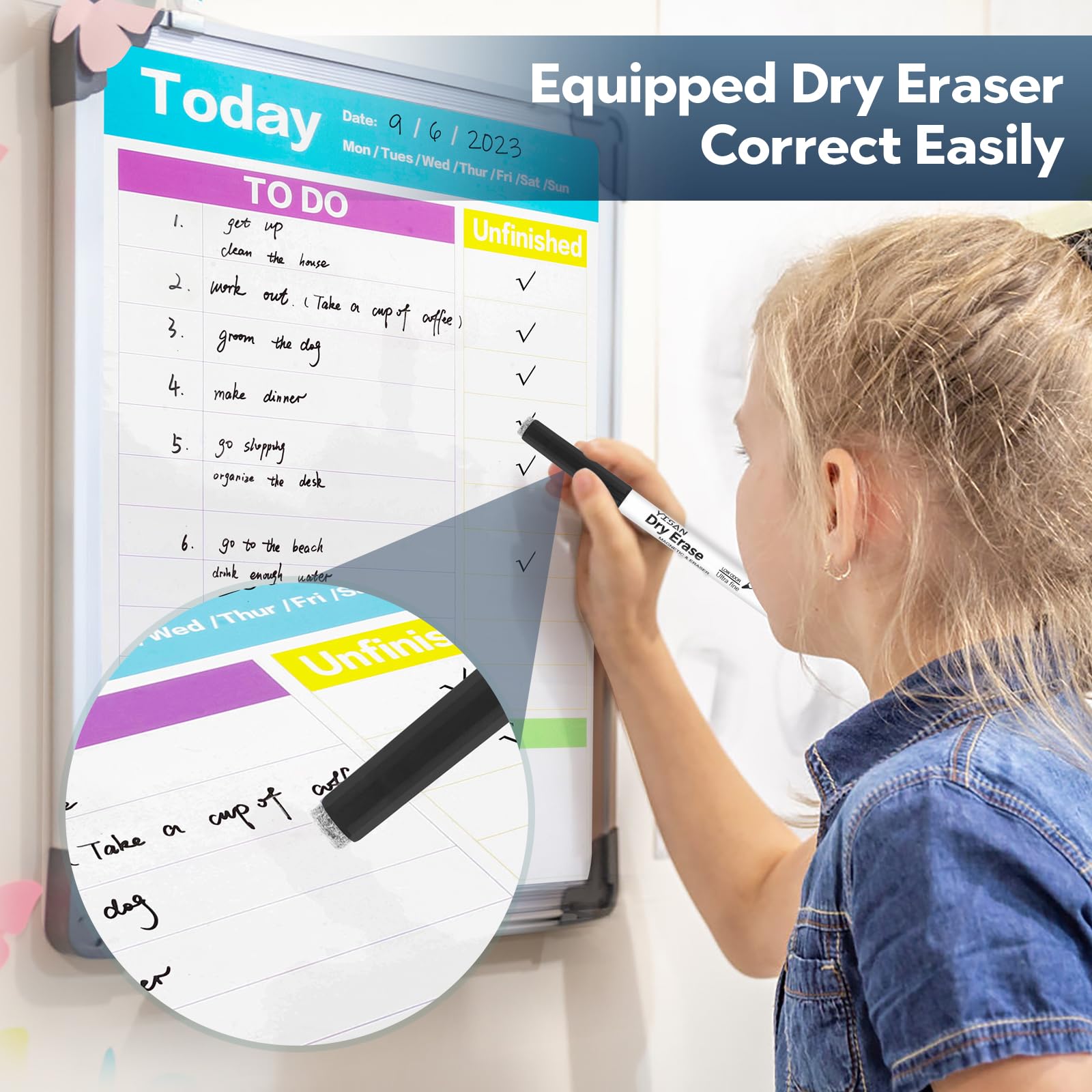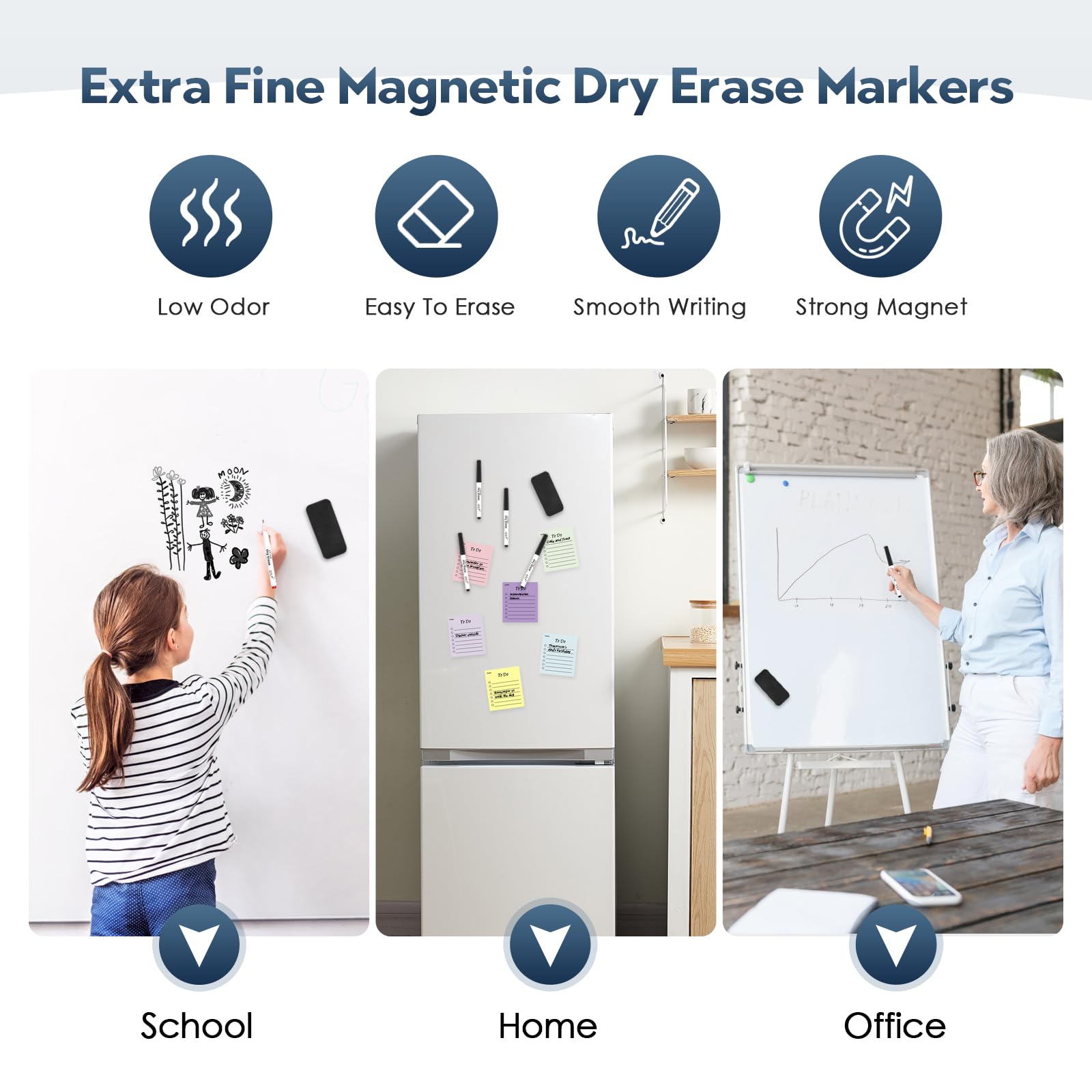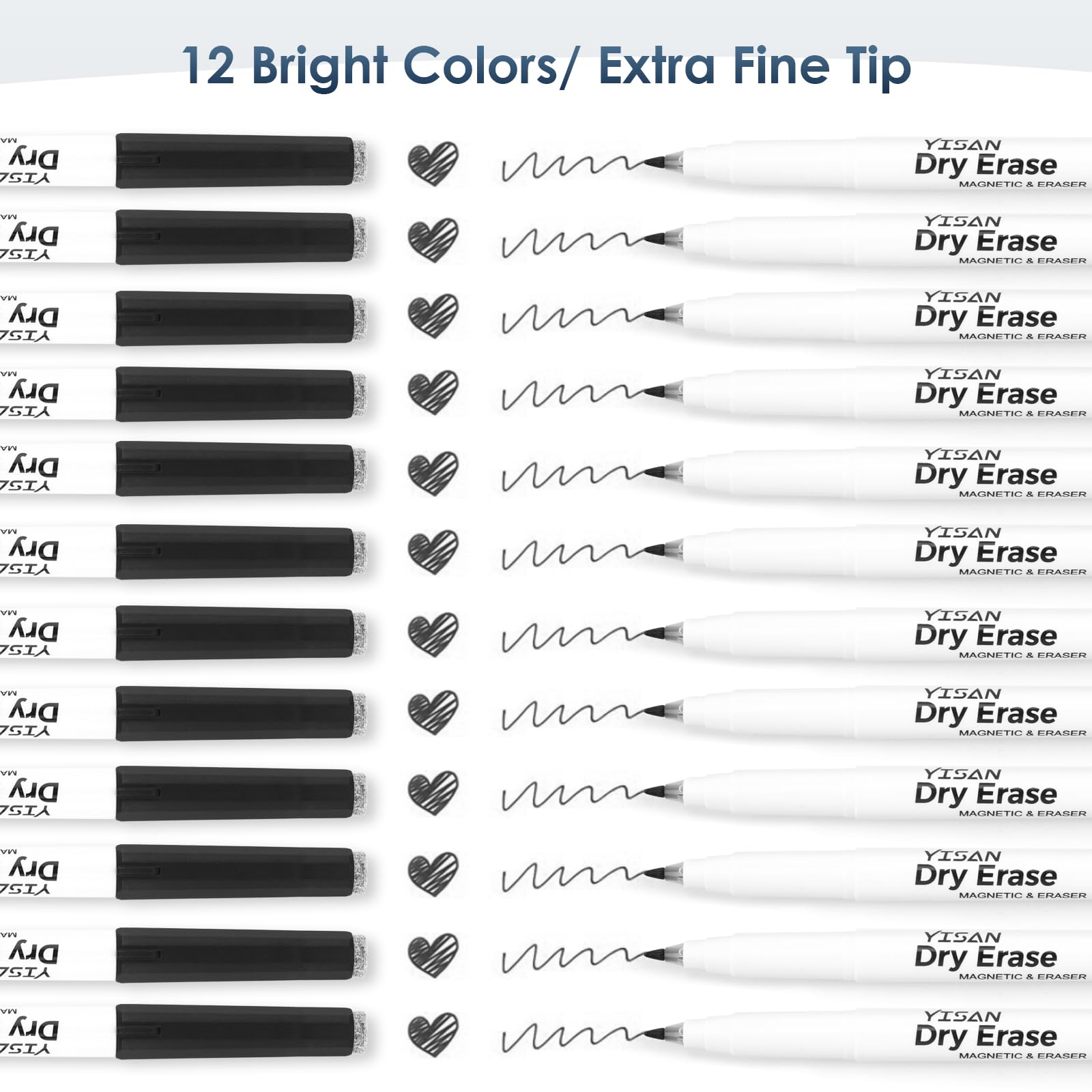 YISAN Magnetische Whiteboard Stifte,Whiteboard Marker Schwarz mit ultrafeiner Spitze,Abwischbar Stifte Dünn,0,7 mm Extra Feine mit Radiergummis Fine Point 12,70542