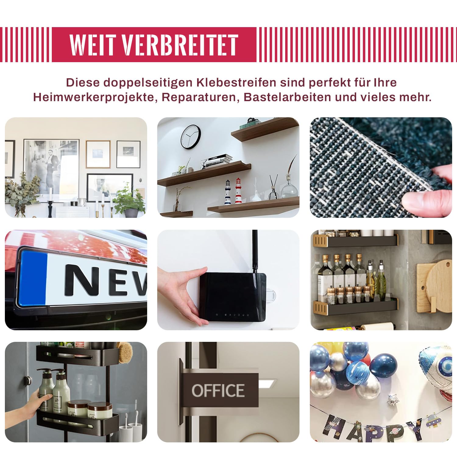 Breites Anwendungsspektrum: Das Klebeband kann auf Glas, Holz, Metall, Wänden, Kunststoffen, Keramik usw. angebracht werden. Geeignet für Autos, Fotoalben, Haken, Wanddekorationen usw.