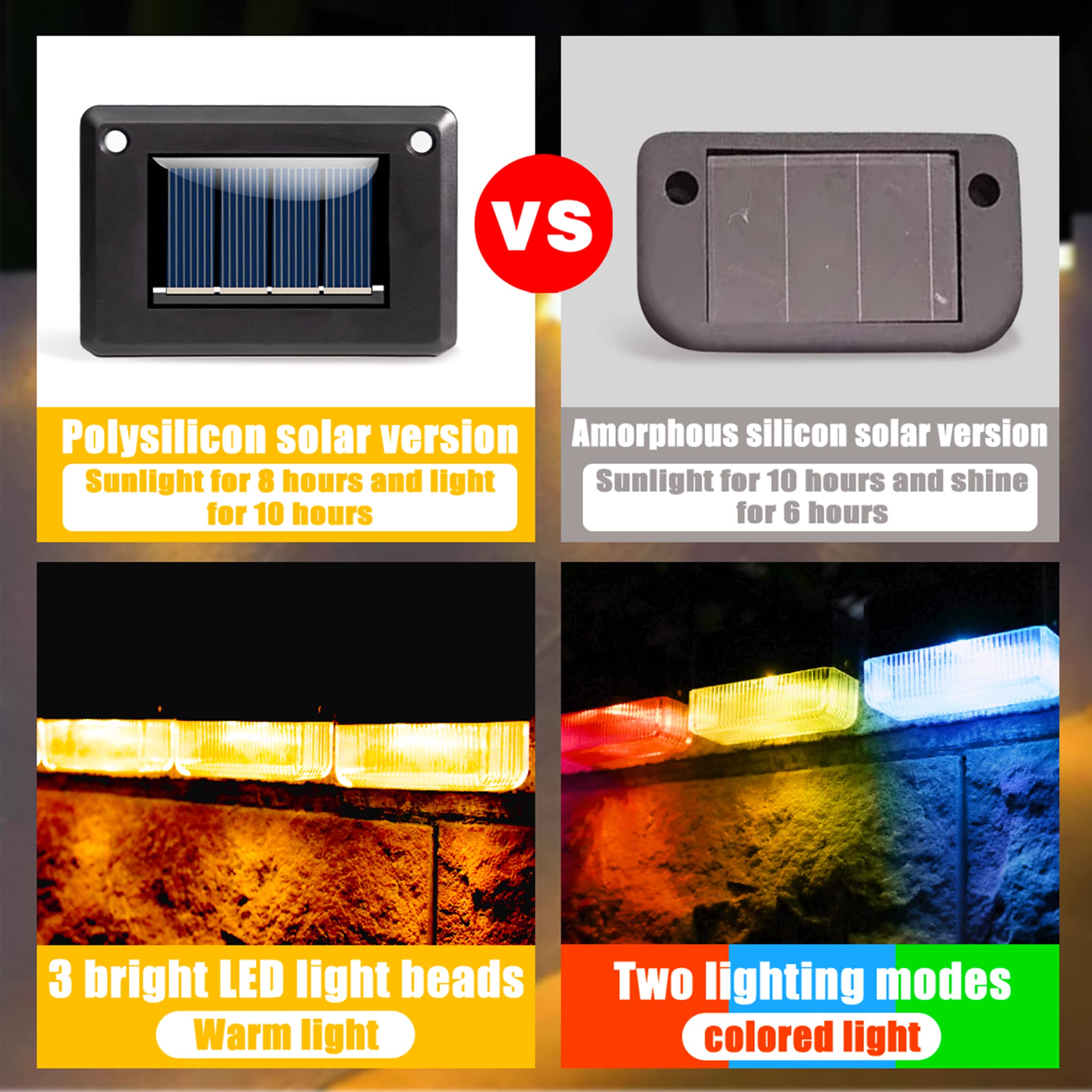 - ☀Outdoor-Solarleuchte mit überlegener Leistung: Die Grösse des Solarlichts beträgt 8 * 5.4 * 5 cm und das Solarlicht verfügt über eingebaute 2 * F5-Strohhutlampenperlen und einen 800-mAh-Akku (grosse Kapazität). Es kann in 6 bis 8 Stunden bei direkter Sonneneinstrahlung vollständig aufgeladen werden und kann nachts etwa 8 bis 10 Stunden hell sein, nachdem es vollständig aufgeladen wurde. Das Produkt wird tagsüber automatisch geladen, was umweltfreundlicher und energiesparender ist.