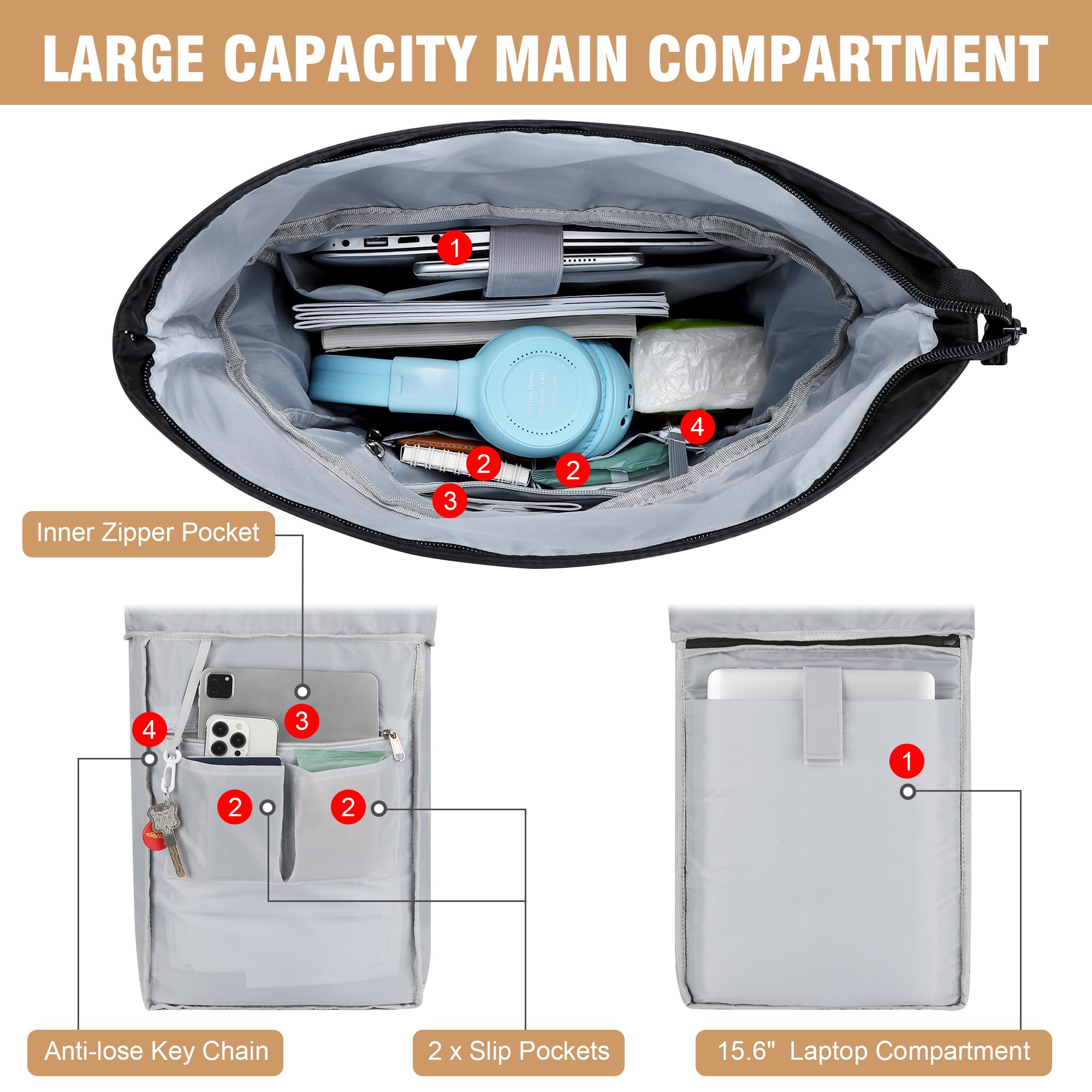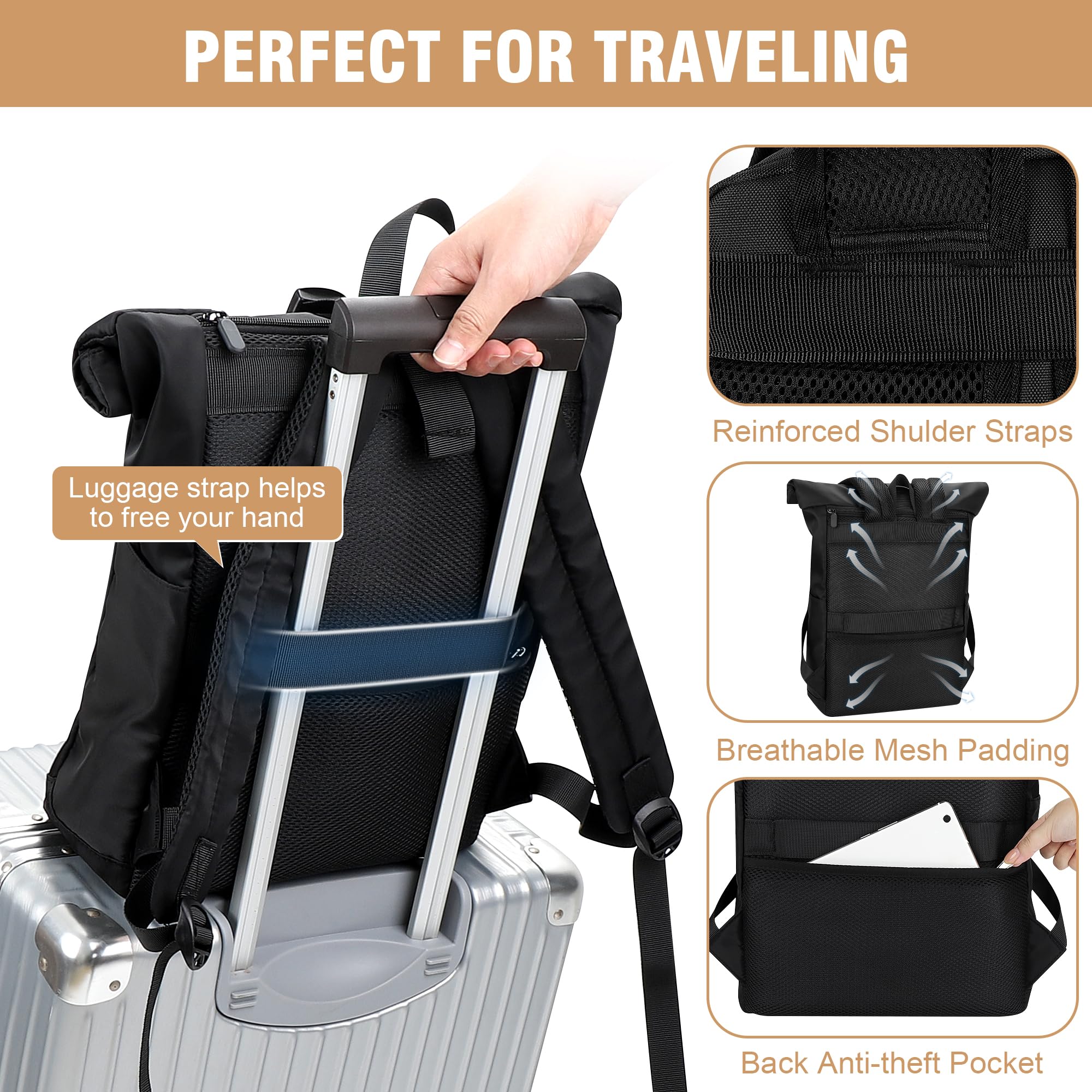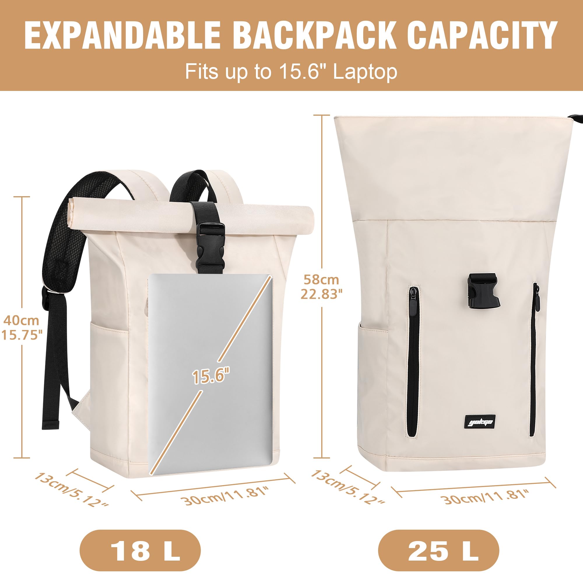 YOKGO Rolltop Rucksack Damen & Herren - Mit Laptopfach für 15.6 Zoll Laptop, Grosser Reiserucksack Backpack Daypack für Uni Schule Business Arbeit City Freizeit Reise