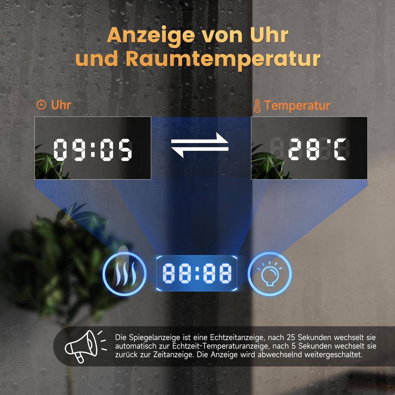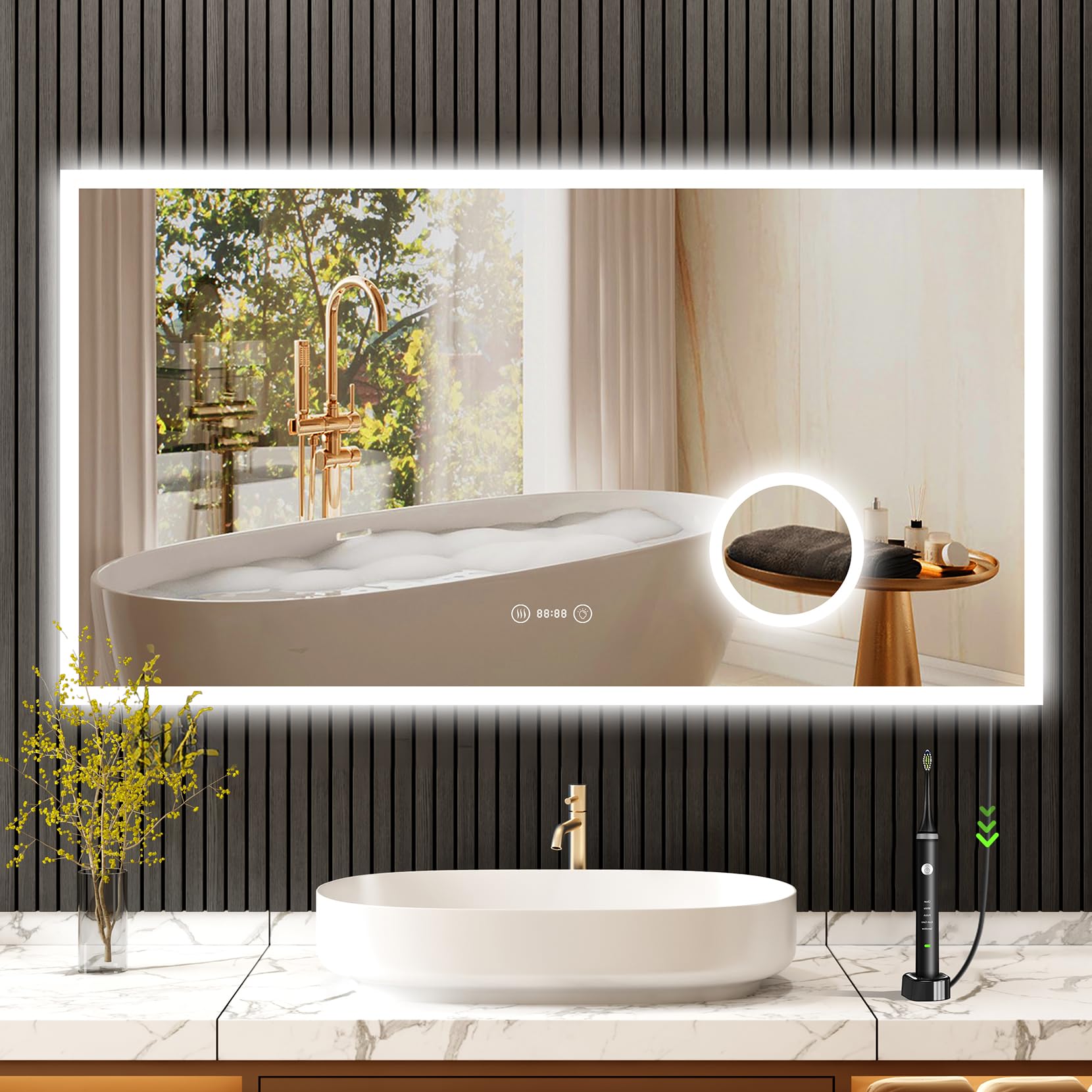 YOLEO Badspiegel mit Beleuchtung, LED Spiegel mit Uhr, Temperatur, 3-Fach Vergrösserung, Wandspiegel mit Steckdose, Badezimmerspiegel LED Beschlagfrei, 3 einstellbare Lichtfarbe, 100x60cm