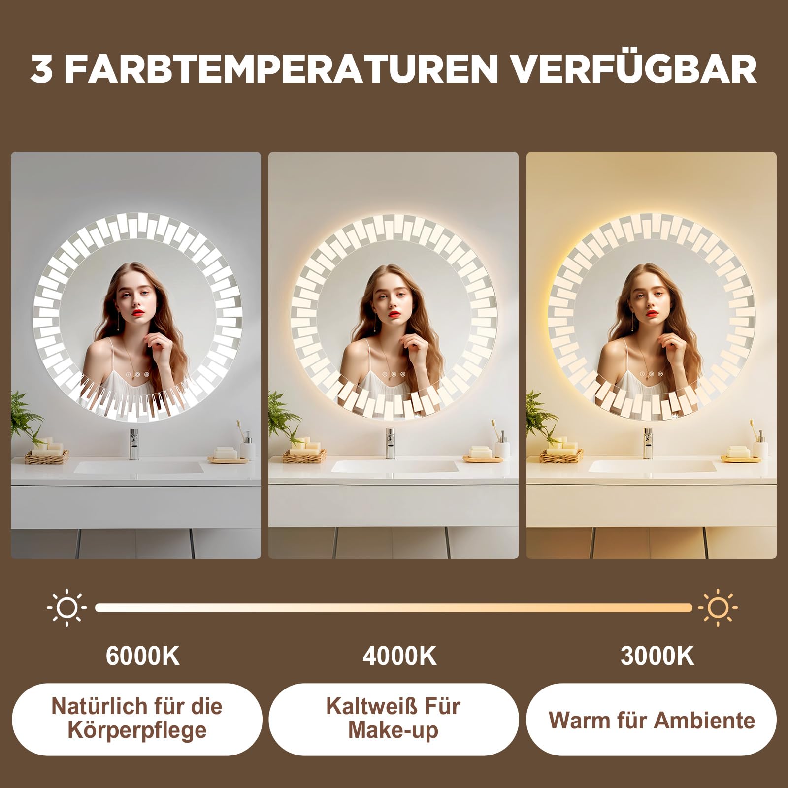 YOLEO Badspiegel rund mit Beleuchtung 80cm, Wandspiegel LED Badezimmerspiegel Antibeschlag grosser Schminkspiegel, Berührungstaste Dimmbares 3 Farben LED-Licht 6500K