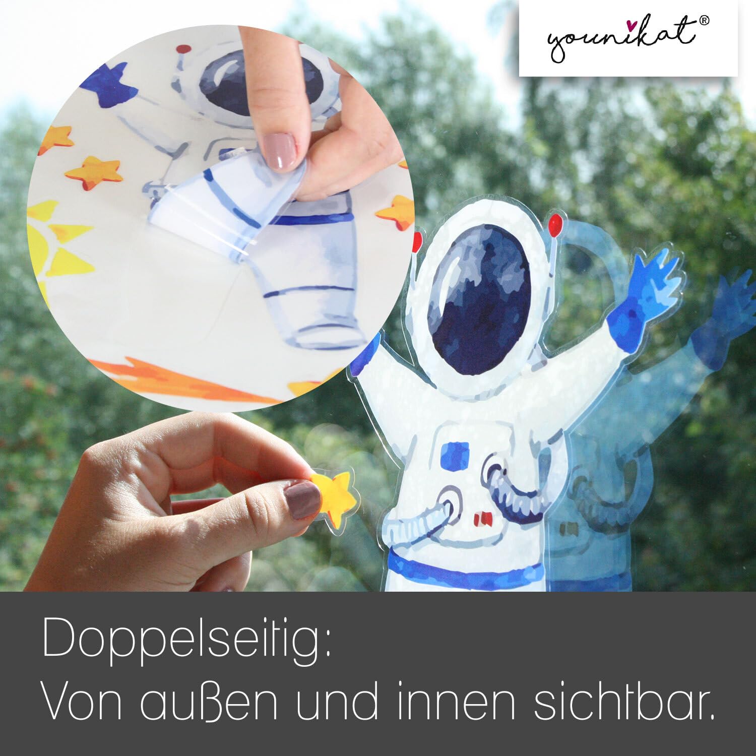 Das Besondere an den Fenster-Aufklebern ist, dass sie wieder benutzbar sind. Man kann sie jederzeit vorsichtig abziehen und in einer neuen Position anbringen, zusätzlich halten die Aufkleber durch statische Haftung, es bleiben also keine Klebereste auf dem Untergrund.