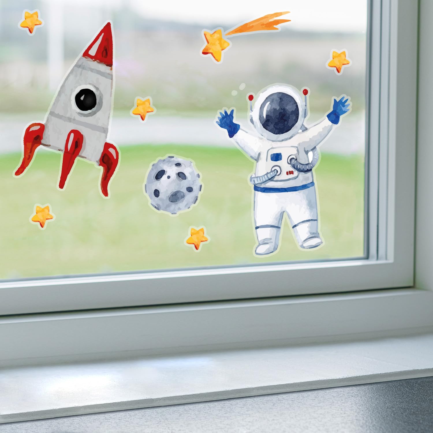 Fenster-Aufkleber Set auf klarer Folie I 3 DIN A4 Bögen mit insgesamt 46 Stickern I mit Raketen Sternen und Planeten I Doppelseitig und selbstklebend I Vogelschutz I dv968