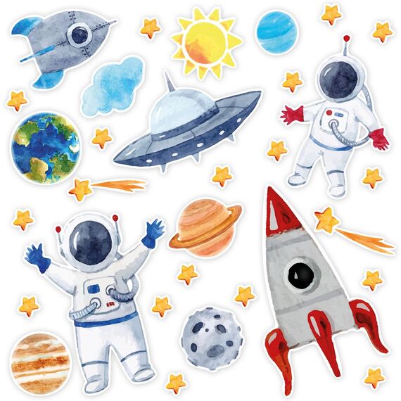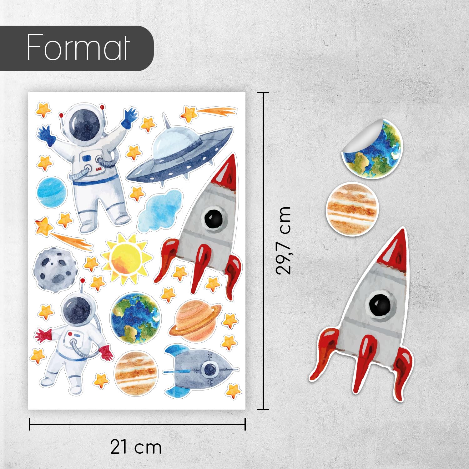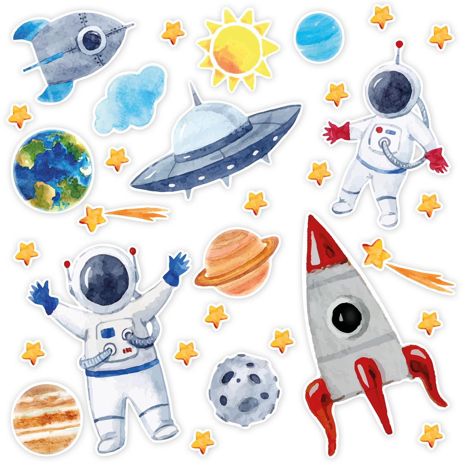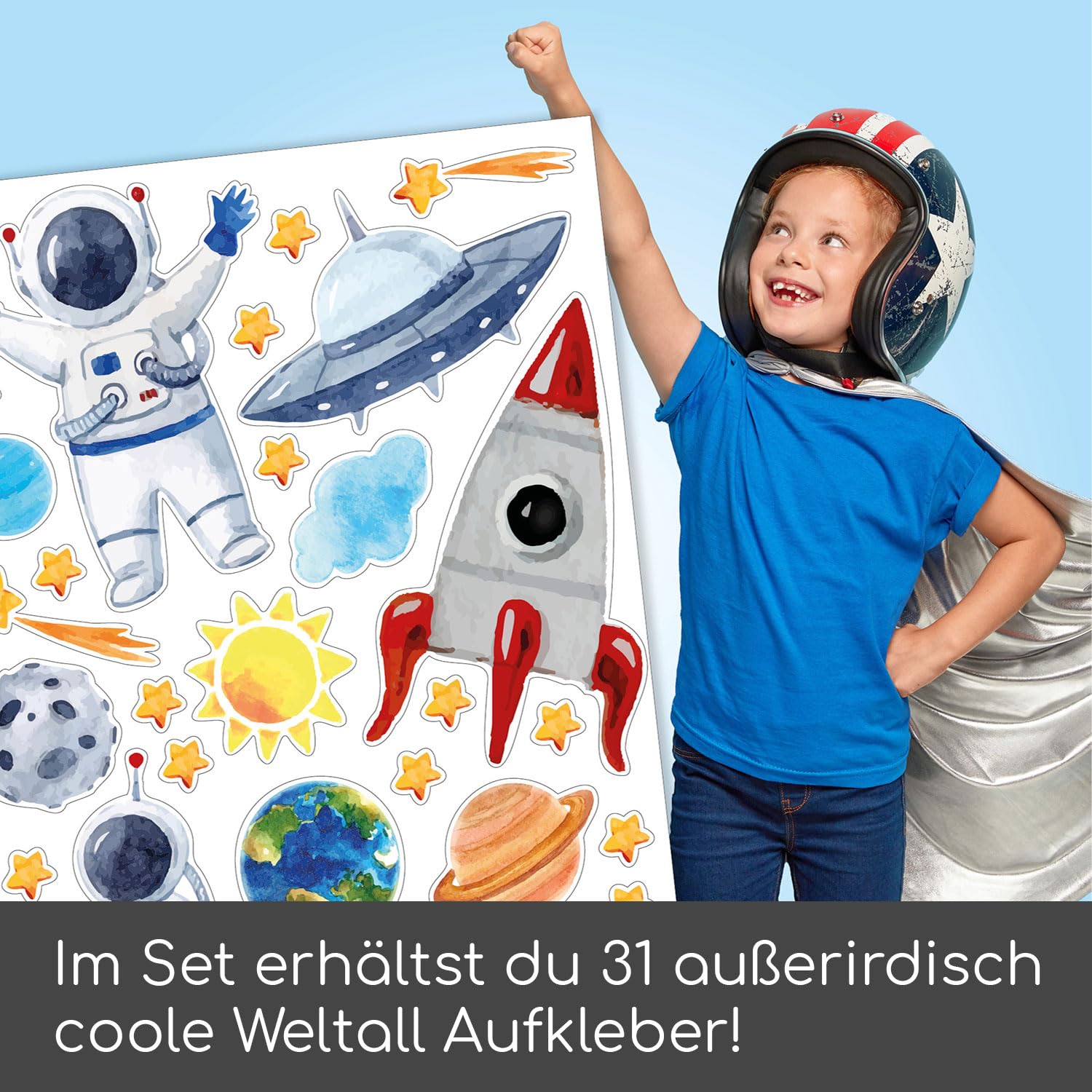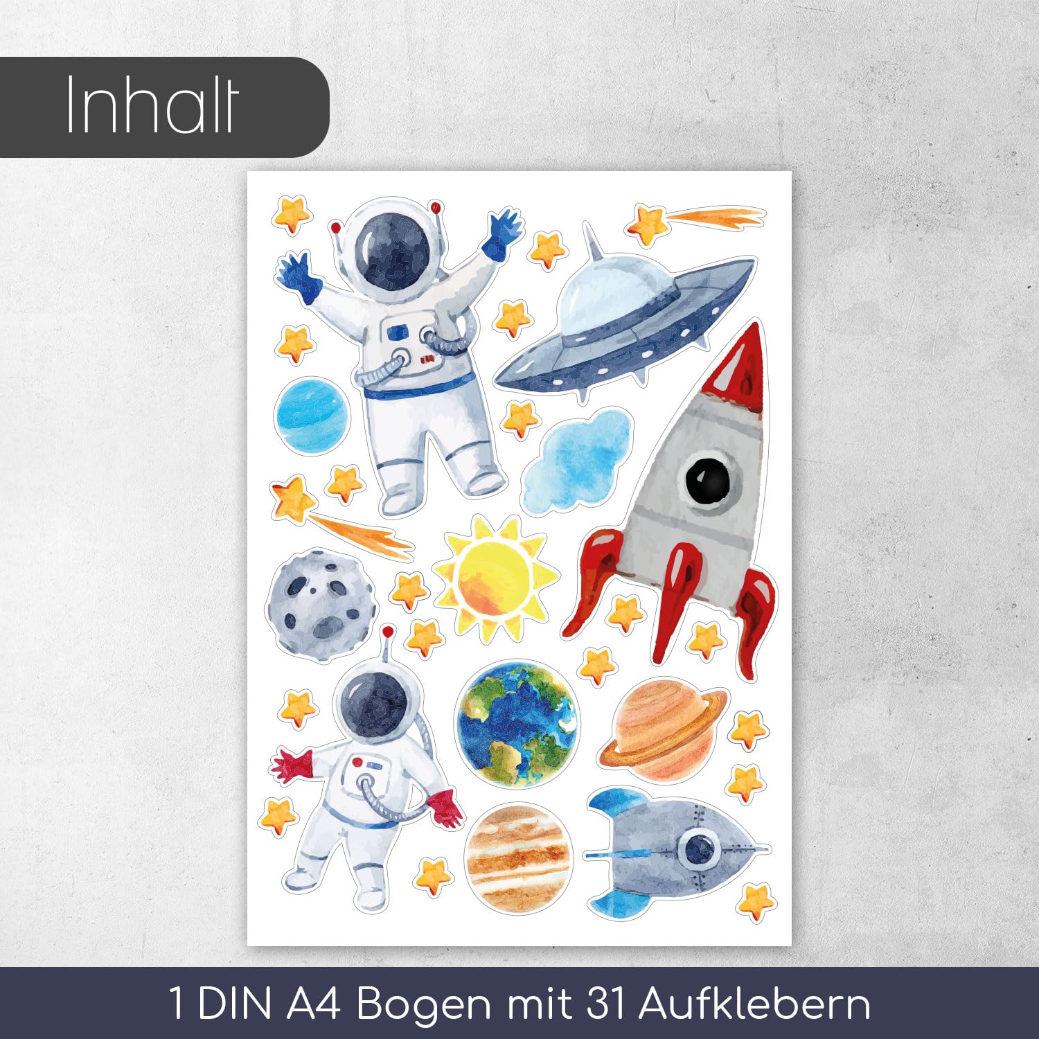 Aufkleber Set mit 31 Weltall Aufkleber I DIN A4 Bogen I Sonne Mond und Sterne I mit Rakete - Astronauten und Planeten I für Handy Kinder-Geburtstag Kinder-Zimmer Schultüte Scrapbooking I kfz667