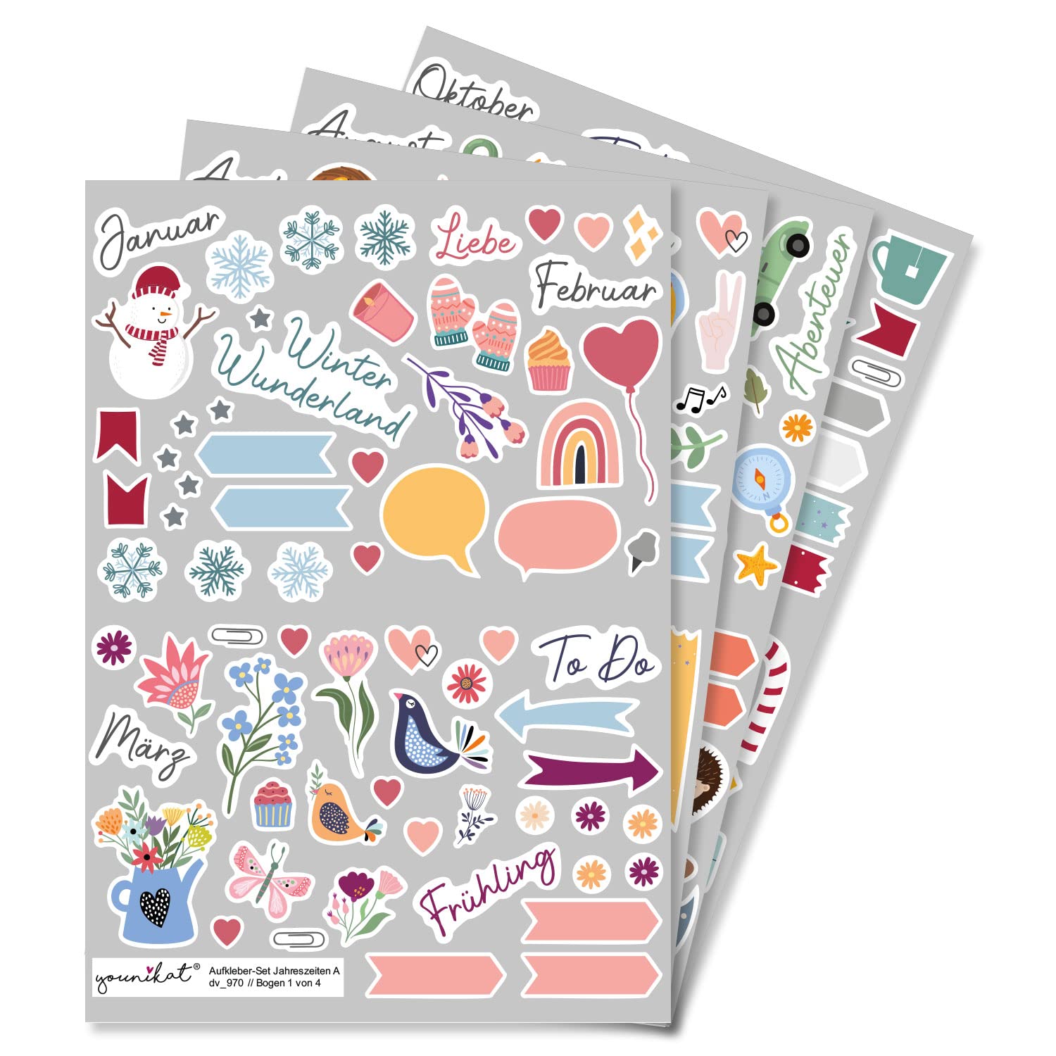Dieses Aufkleber Set ist die perfekte Ergänzung, für dein nächstes Papierbastel-Projekt! Das Set enthält verschiedene Motive, Sprüche (auf Deutsch), Formen, Banner, Fähnchen, schmückende Elemente, Verzierungen und Etiketten in aufeinander abgestimmtem Design. Passend zu diversen Anlässen: Durch die Aufteilung in die 4 Jahreszeiten (Frühling, Sommer, Herbst, Winter), findest du schnell die passenden Aufkleber, die perfekt zu den jeweiligen Themen und Anlässen passen. Egal ob für Scrapbooking, Foto-Album, Tagebuch, Kalender, Geschenkverpackung, Laptop oder Smartphone, das bunte Set enthält Aufkleber, die dein Projekt stilvoll verschönern. Die in Kontur geschnittenen Aufkleber sind übersichtlich verteilt auf vier Bögen. Dies ermöglicht ein leichtes Abziehen und erspart lästiges Ablösen jedes einzelnen Aufklebers von Trägerpapier.