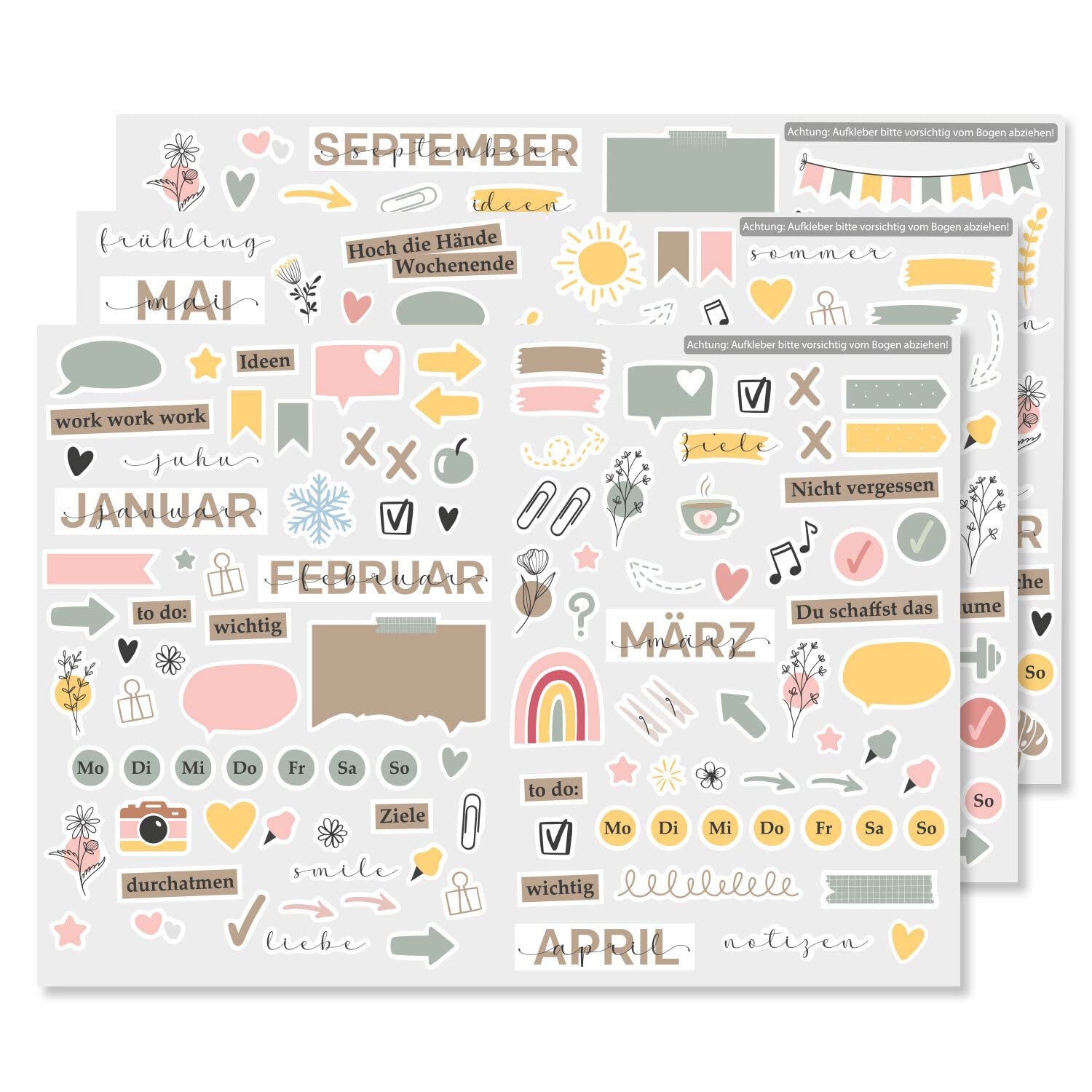 Dieses Aufkleber Set ist die perfekte Ergänzung, für dein nächstes Papierbastel-Projekt! Ideal für dein ganz persönliches Bullet Journal. Dieses Sticker-Set eignet sich ideal die eigene Organisation im Planer oder Journal zu verfeinern und zu individualisieren. Das Set enthält verschiedene Motive, Sprüche (auf Deutsch), Formen, Banner, Fähnchen, schmückende Elemente und Verzierungen mit Jahreszeiten in aufeinander abgestimmtem Design. Passend zu diversen Anlässen: