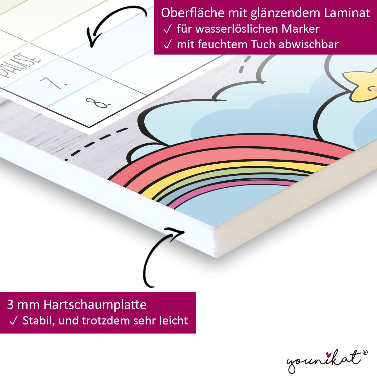 So macht die Schule doch gleich mehr Spass! Egal, ob für Gross oder Klein - der Stundenplan ist nicht nur praktisch, da du einen Überblick über deine Schulstunden hast, sondern niedlich und frech zugleich und daher auch eine tolle Dekoration. Jedes Schuljahr ändern sich die Fächer, du kannst deine alten Kurse einfach entfernen und neu eintragen. Der Stundenplan ist mit einem non permanent Marker beschreibbar und wieder abwischbar. Superpraktisch: Der Stundenplan kann dank der beigelegten Aufhängung an der Wand aufgehängt und nach Bedarf leicht abgehängt werden, um ihm gut zu beschriften. Der Planer kann mit wasserlöslichen Markern beschriftet und mit einem feuchten Tuch wieder abgewischt werden. Im Gegensatz zu trocken abwischbaren Planern verwischt nichts, wenn man aus Versehen, mit der Hand darüber geht. Dem Planer sind drei Klebe-Aufhängungen beigelegt, die man, angepasst an die persönlichen Gegebenheiten auf der Rückseite befestigen kann. So kann man den Planer an der Wand aufzuhängen und nach Bedarf abhängen, um ihm leichter zu beschriften. Das Material: Hartschaumplatte ist bestens für den Verwendungszweck geeignet, da es stabil und doch sehr leicht ist. Die harte Oberschicht lässt zudem sehr gut beschreiben. Die Halterung für den beiliegenden Stift kann entweder auf dem Planer oder an einer anderen glatten Oberfläche dauerhaft angebracht werden.