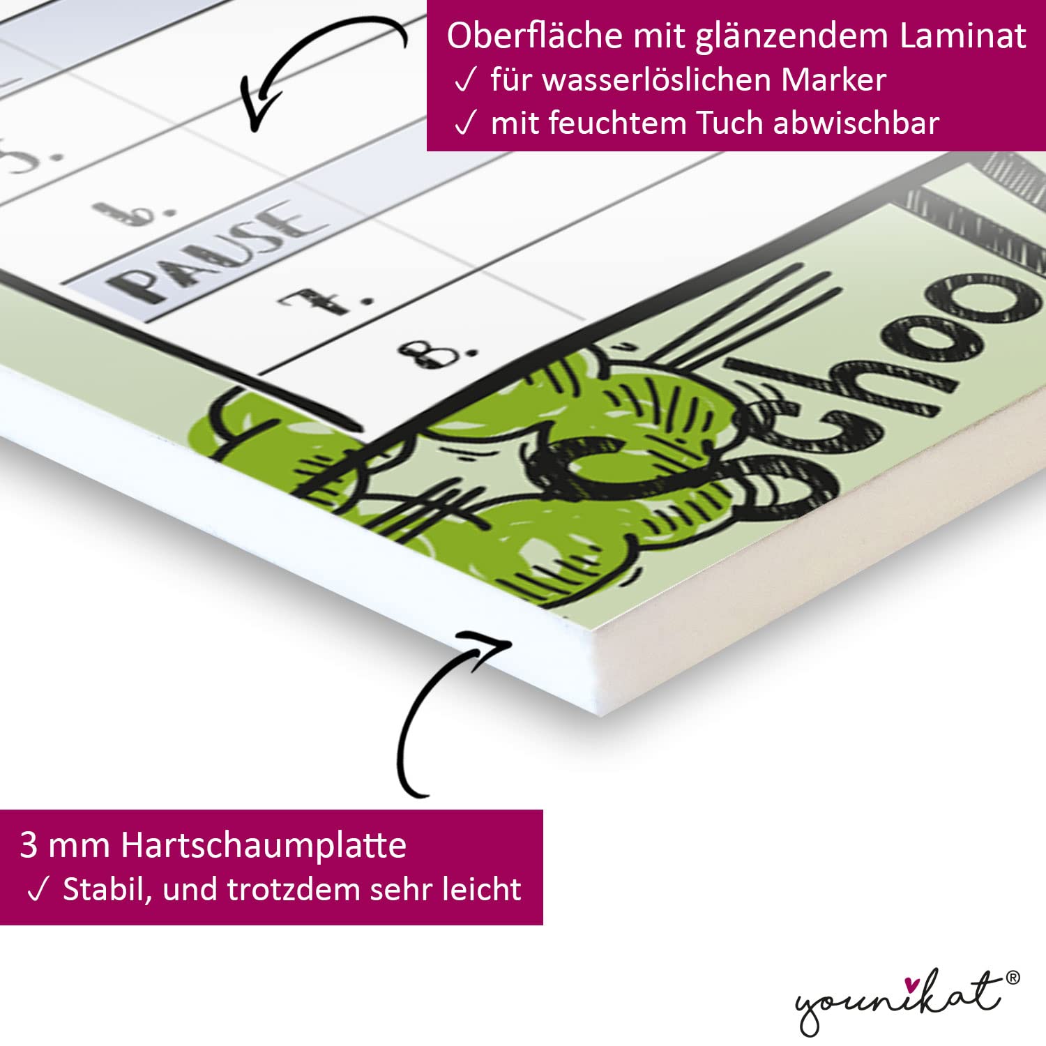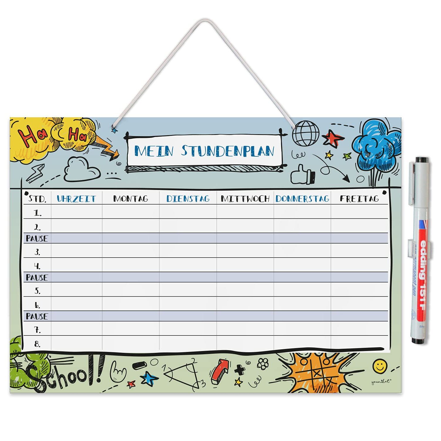 So macht die Schule doch gleich mehr Spass! Egal, ob für Gross oder Klein - der Stundenplan ist nicht nur praktisch, da du einen Überblick über deine Schulstunden hast, sondern cool zugleich und daher auch eine nützliche Dekoration. Jedes Schuljahr ändern sich die Fächer, du kannst deine alten Kurse einfach entfernen und neu eintragen. Eine klasse Geschenkidee für alle Schulkinder. Superpraktisch: Der Stundenplan kann dank der beigelegten Aufhängung an der Wand aufgehängt und nach Bedarf leicht abgehängt werden, um ihm gut zu beschriften. Der Planer kann mit wasserlöslichen Markern beschriftet und mit einem feuchten Tuch wieder abgewischt werden. Im Gegensatz zu trocken abwischbaren Planern verwischt nichts, wenn man aus Versehen mit der Hand darüber geht. Dem Menüplaner ist eine Schnur zum befestigen an dem Planer beigelegt. So kann man den Planer an der Wand aufzuhängen und nach Bedarf abhängen, um ihm leichter zu beschriften. Das Material: Hartschaumplatte ist bestens für den Verwendungszweck geeignet, da es stabil und doch sehr leicht ist. Die harte Oberschicht lässt sich gut beschreiben. Die Halterung für den beiliegenden Stift kann entweder auf dem Planer oder an einer anderen glatten Oberfläche dauerhaft angebracht werden.