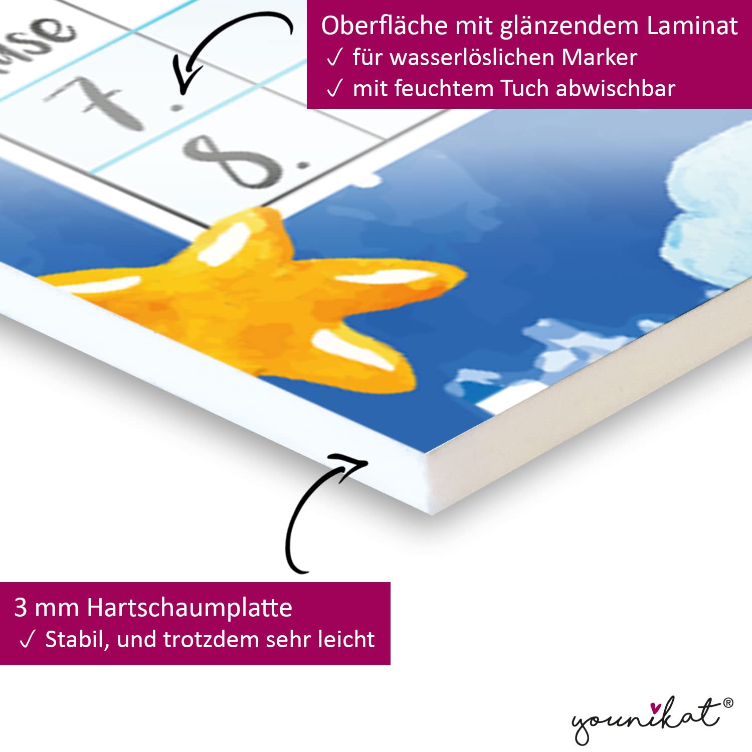Superpraktisch: Der Stundenplan kann dank der beigelegten Aufhängung an der Wand aufgehängt und nach Bedarf leicht abgehängt werden, um ihm gut zu beschriften. Der Planer kann mit wasserlöslichen Markern beschriftet und mit einem feuchten Tuch wieder abgewischt werden. Im Gegensatz zu trocken abwischbaren Planern verwischt nichts, wenn man aus Versehen mit der Hand darüber geht.